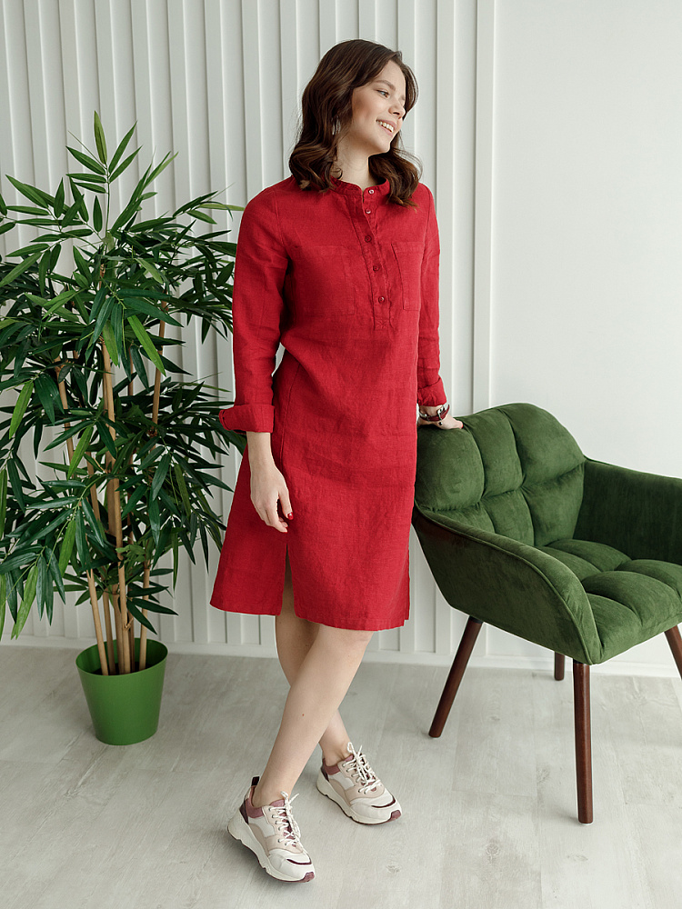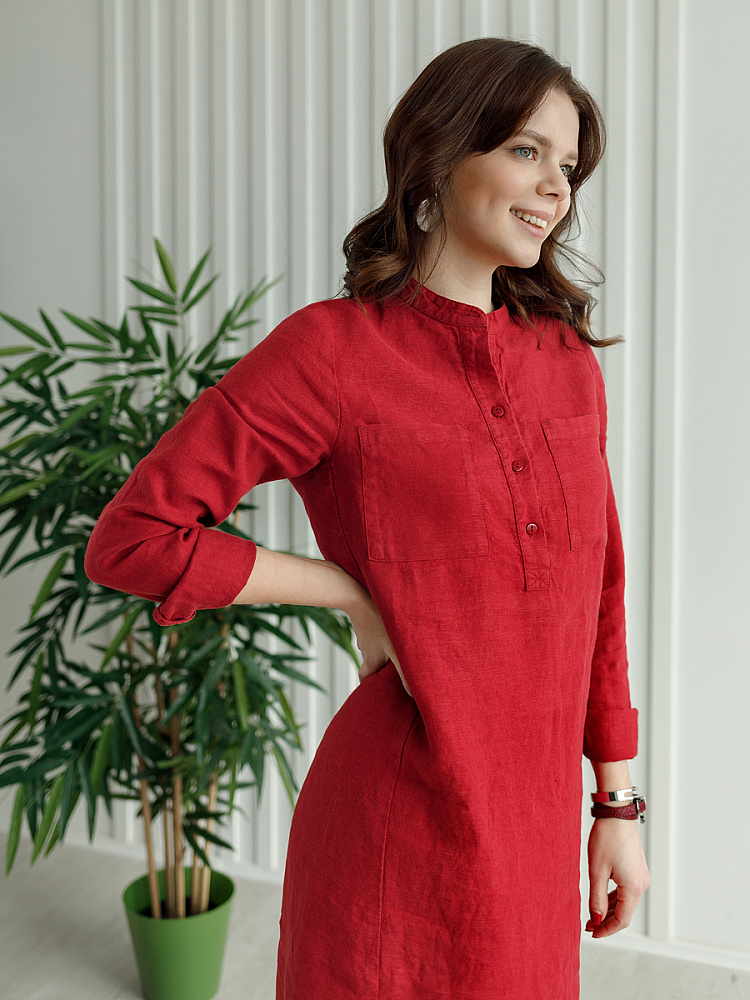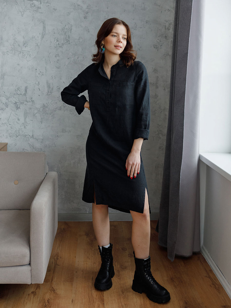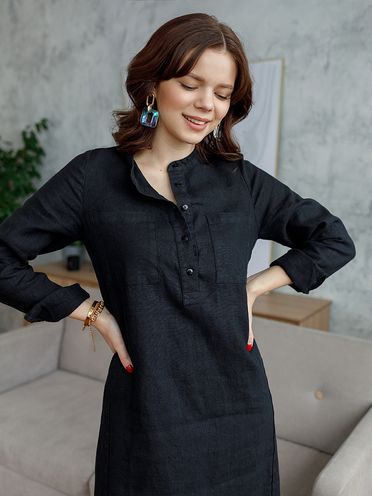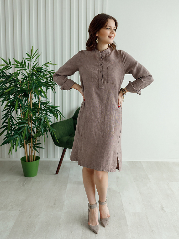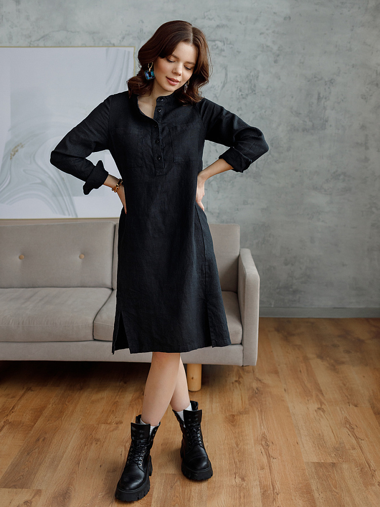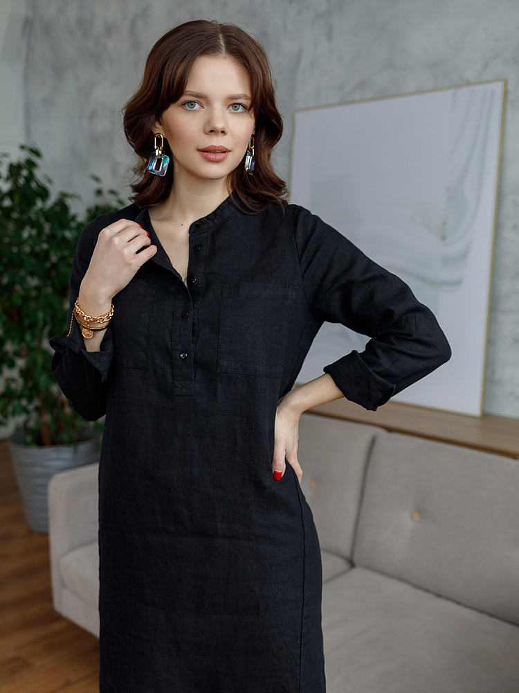 Невозможно не согласиться, что платье – рубашка очень удобная и универсальная вещь. Идеально подходит для создания повседневного или делового образа. Именно поэтому такая модель должна присутствовать в женском гардеробе. Это будет хорошим приобретением, которое оправдает вложения, не надоест и не потеряет своей актуальности многие сезоны. Ну а если, подобная модель изготовлена из натурального материала – все сомнения должны уйти. Представленное платье как нельзя лучше соответствует всем перечисленным критериям и качествам. В прямом силуэте удлинённого платья угадываются черты любимой мужской сорочки. Укороченная застёжка – планка как лаконичное продолжение воротника – стойки. В области груди расположены большие накладные карманы прямоугольной формы, которые подчёркивают геометрию силуэтных линий. Низ изделия лаконично дополнен разрезами в боковых швах. Жатая текстура натурального льна великолепно воплотила все дизайнерские задумки.