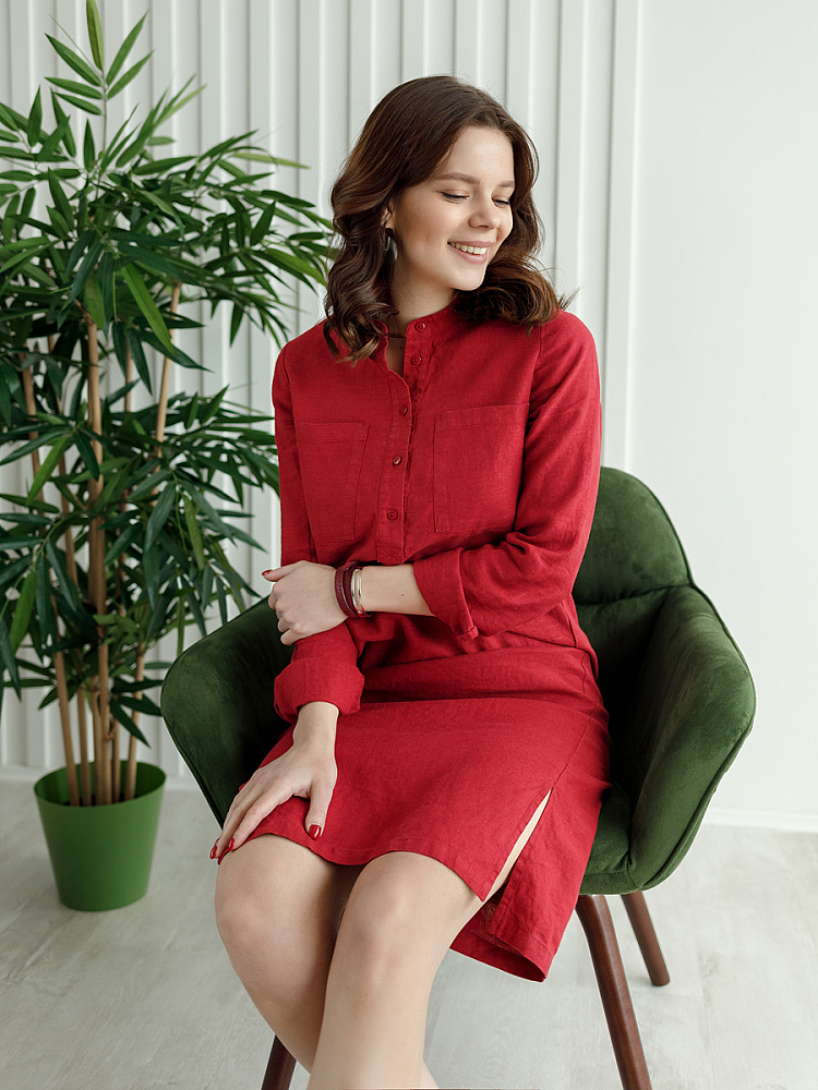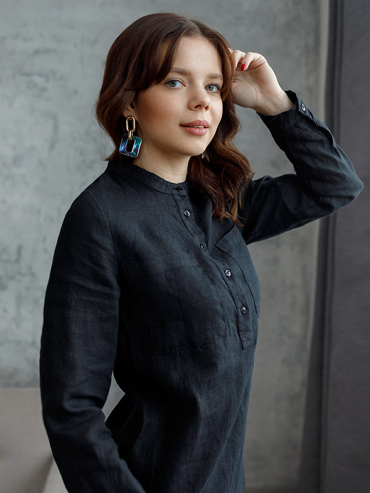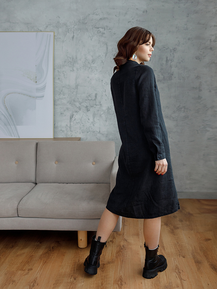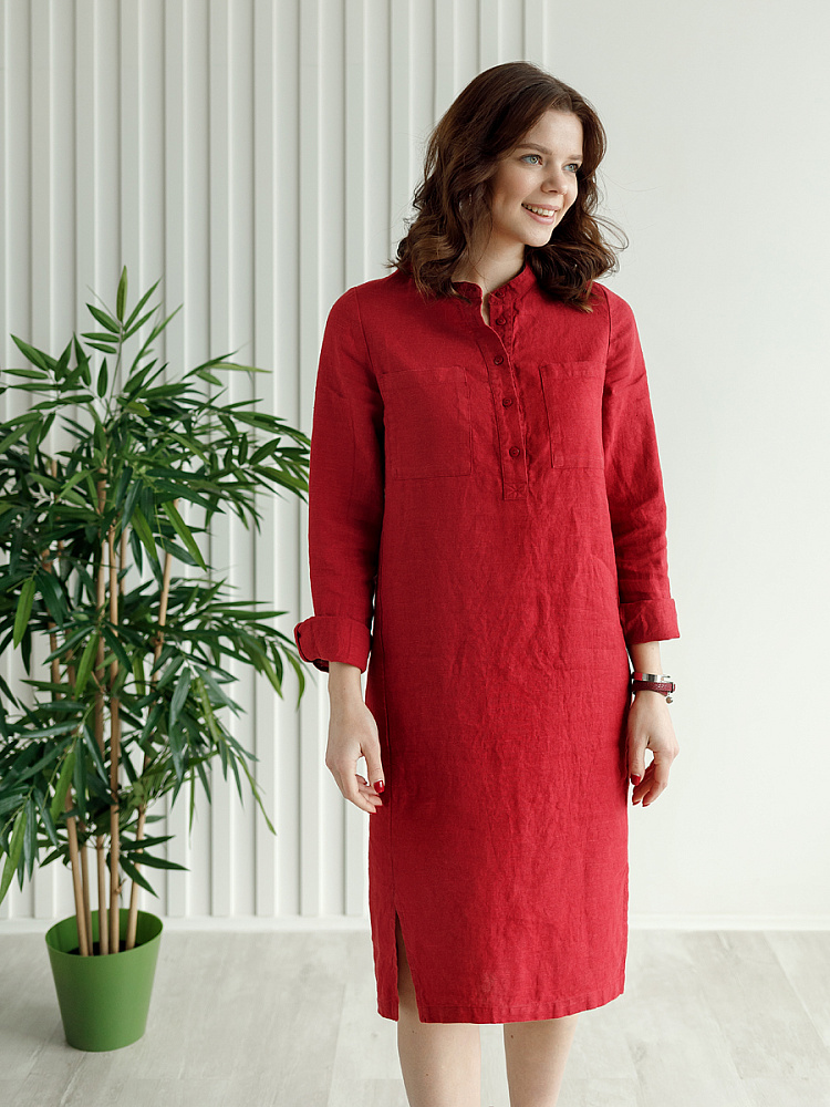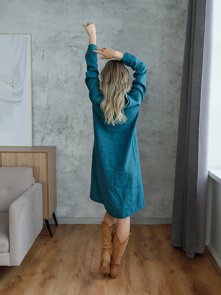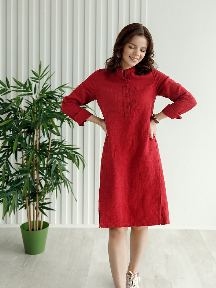 Невозможно не согласиться, что платье – рубашка очень удобная и универсальная вещь. Идеально подходит для создания повседневного или делового образа. Именно поэтому такая модель должна присутствовать в женском гардеробе. Это будет хорошим приобретением, которое оправдает вложения, не надоест и не потеряет своей актуальности многие сезоны. Ну а если, подобная модель изготовлена из натурального материала – все сомнения должны уйти. Представленное платье как нельзя лучше соответствует всем перечисленным критериям и качествам. В прямом силуэте удлинённого платья угадываются черты любимой мужской сорочки. Укороченная застёжка – планка как лаконичное продолжение воротника – стойки. В области груди расположены большие накладные карманы прямоугольной формы, которые подчёркивают геометрию силуэтных линий. Низ изделия лаконично дополнен разрезами в боковых швах. Жатая текстура натурального льна великолепно воплотила все дизайнерские задумки.