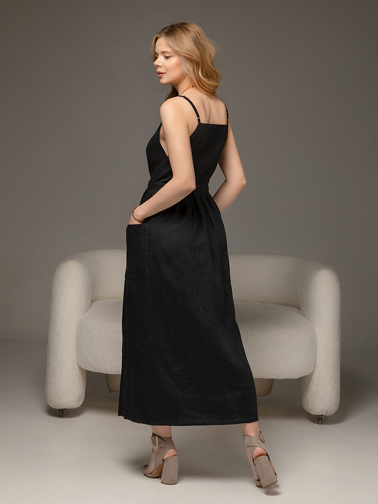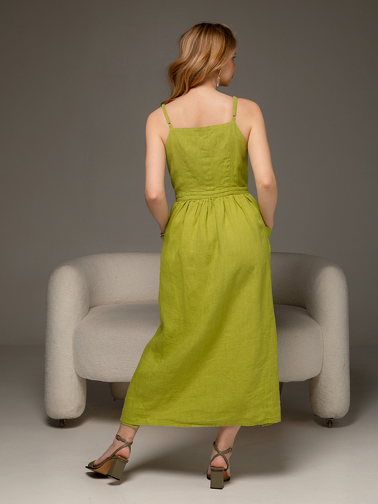 Летний сарафан – это залог комфорта и женственного образа. Открытые плечи и парящий силуэт юбки всегда гарантируют утончённые и привлекательные черты. Благодаря открытому лифу и отсутствию рукавов в сарафане не будет жарко в самое знойное лето. Да и к тому же, такая «открытость» позволяет эффектно продемонстрировать свой золотистый загар. Поэтому не стоит терять время! Обратите внимание на представленную модель сарафана из натурального льна. А – силуэт в сочетании с макси длиной наделяют женский силуэт статью и грациозностью. Пропорции модели зрительно вытягивают фигуру по вертикали, создавая утончённый формы. Оригинальная конструкция сарафана не может не заинтересовать. Линия талии подчёркнута горизонтальным подрезом имитирующим пояс, который на полочке трансформируется в кушак. Мелкая присборенность на юбке создаёт кокетливые складки и привлекательный объём в области бёдер, что ещё больше подчёркивает талию. Детали кроя умело интригуют и запутывают, создавая имитацию запаха. Спинка нахлёстывается на полочку, в результате чего образуются разрезы по бокам. Большие накладные карманы смотрятся свежо и оригинально. На этом фоне лиф модели не многословен и сдержан. Горизонтальный срез по линии декольте лаконично поддержан тонкой бретелью, длину которой можно удобно регулировать.