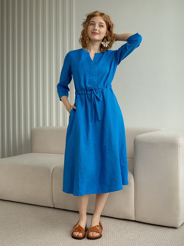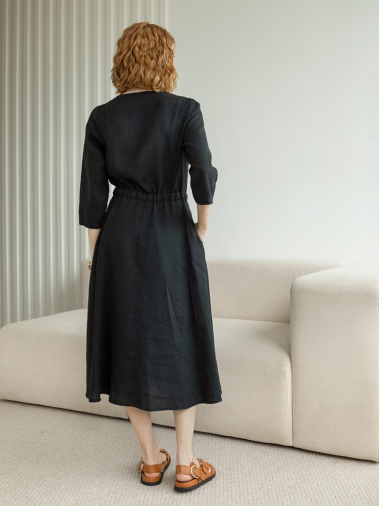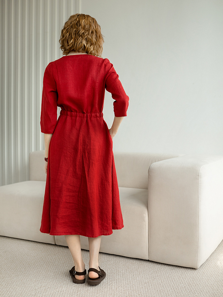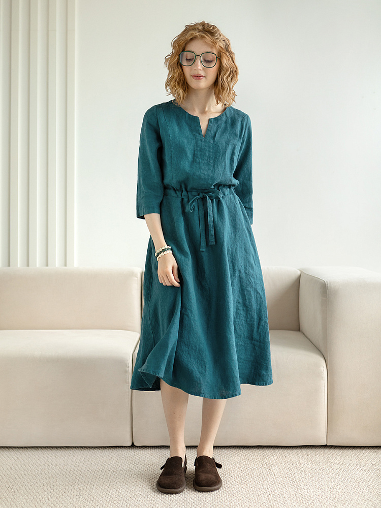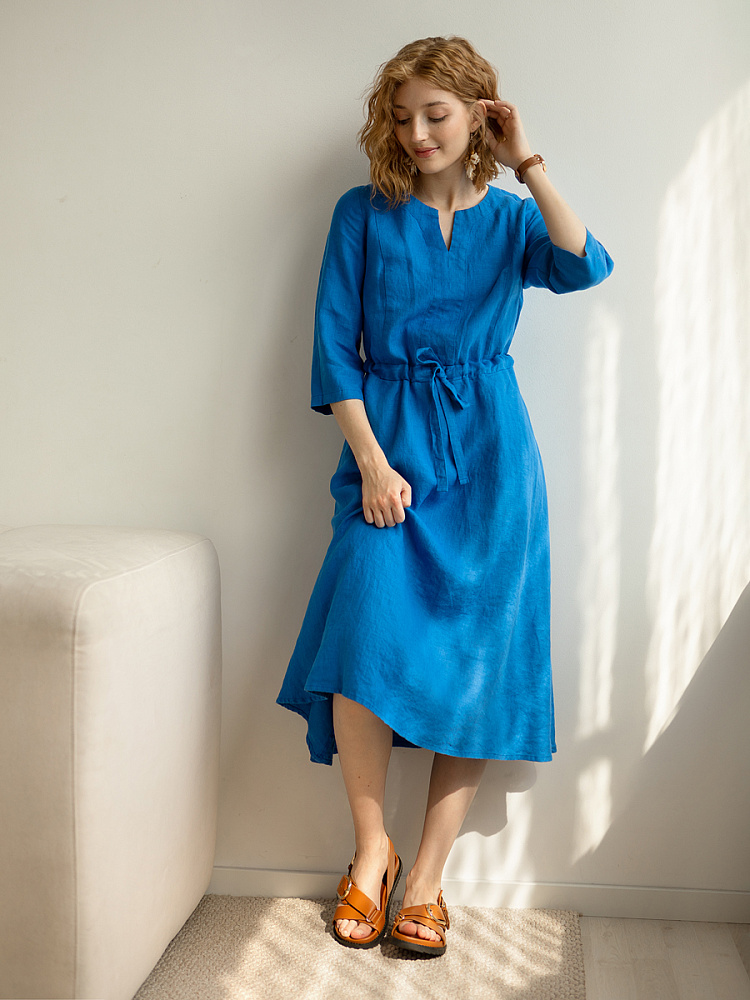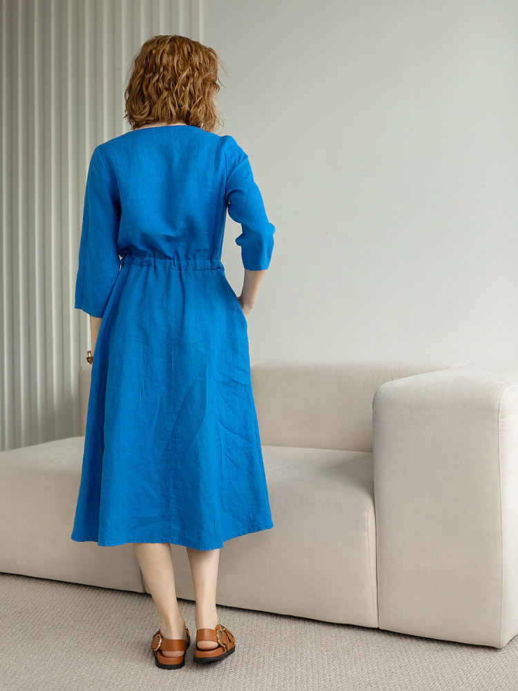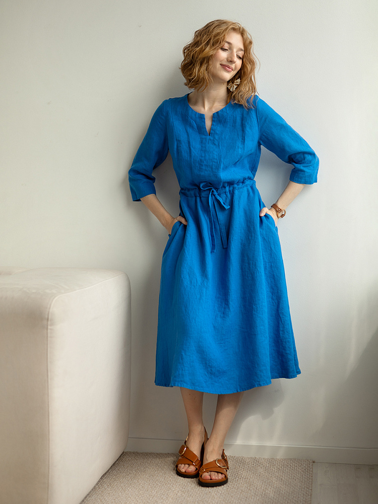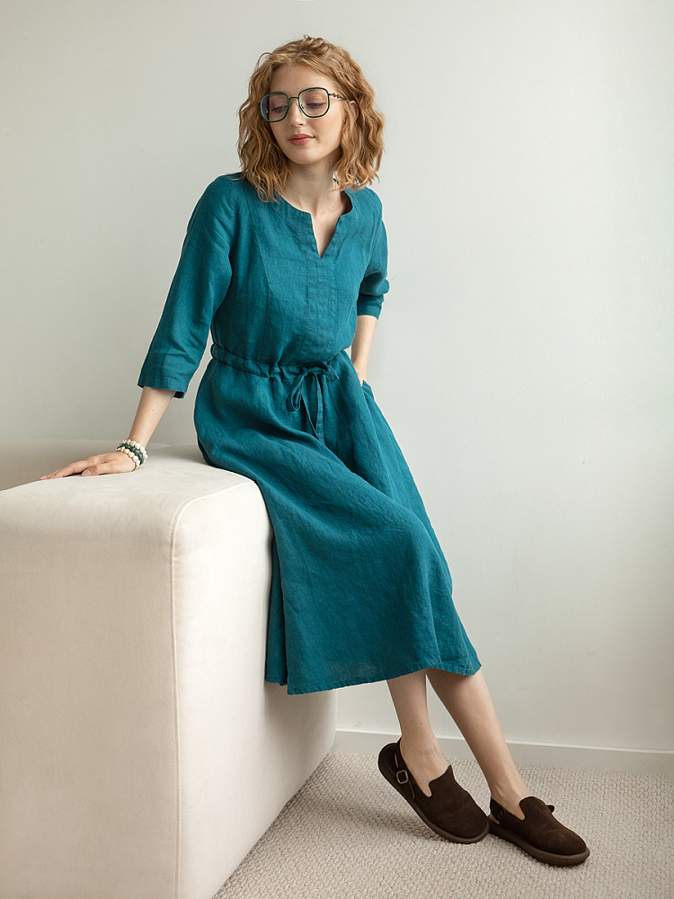 Руководствуясь принципом – к хорошему быстро привыкаешь, в последние несколько лет прослеживается запрос покупателей на качественные изделия, выполненные из натуральных материалов, обладающие хорошей посадкой на фигуре. Подобные изделия всегда в тренде, их комфортно носить, от них не наступает моральная усталость и к тому же, не стыдно демонстрировать окружающим. Представленная модель платья из льна способно удовлетворить все эти запросы. Силуэт песочные часы в сочетании с длиной миди великолепны на представительницах самого разнообразного роста и весомых достоинств. Акцентная кулиса на талии хорошо её подчёркивает, разделяя силуэт на верхнюю и нижнюю часть. Юбка не выказывает декоративного изобилия. Лёгкая расклешённость дополнена карманами в боковых швах. Лиф модели более разнообразен конструкторскими решениями. Рельефные швы на полочке и спинке выстраивают вертикали, которые поддержаны декоративной планкой по борту. Круглый вырез горловины дополняет V - образный вырез, что придаёт женским чертам утончённый силуэт.