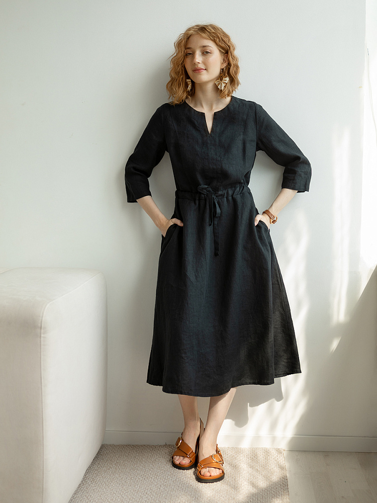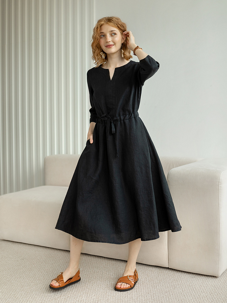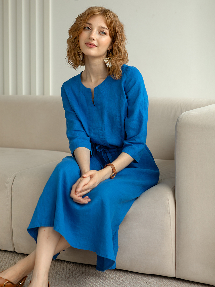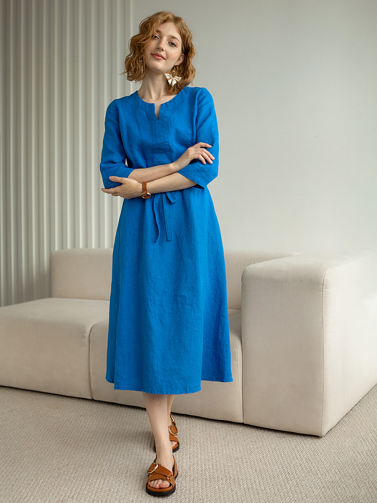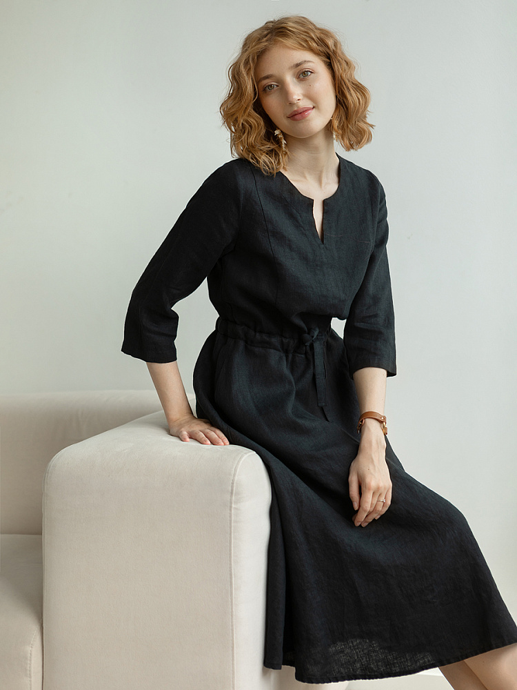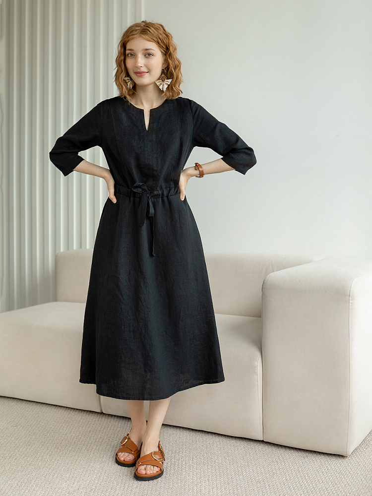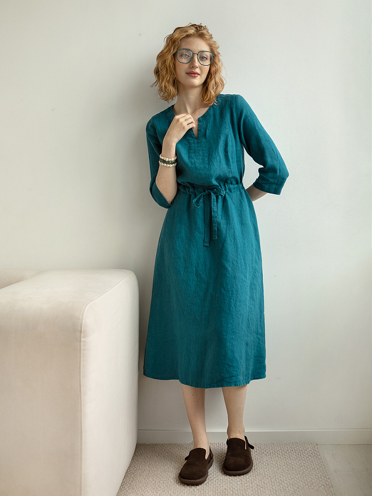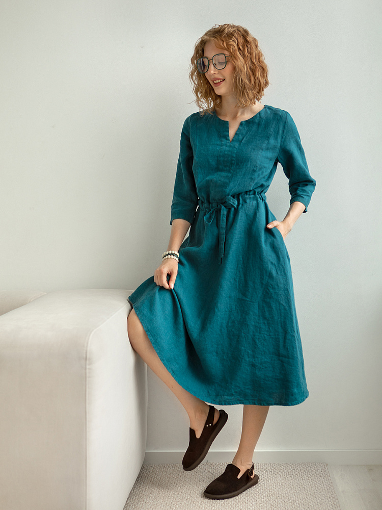 Руководствуясь принципом – к хорошему быстро привыкаешь, в последние несколько лет прослеживается запрос покупателей на качественные изделия, выполненные из натуральных материалов, обладающие хорошей посадкой на фигуре. Подобные изделия всегда в тренде, их комфортно носить, от них не наступает моральная усталость и к тому же, не стыдно демонстрировать окружающим. Представленная модель платья из льна способно удовлетворить все эти запросы. Силуэт песочные часы в сочетании с длиной миди великолепны на представительницах самого разнообразного роста и весомых достоинств. Акцентная кулиса на талии хорошо её подчёркивает, разделяя силуэт на верхнюю и нижнюю часть. Юбка не выказывает декоративного изобилия. Лёгкая расклешённость дополнена карманами в боковых швах. Лиф модели более разнообразен конструкторскими решениями. Рельефные швы на полочке и спинке выстраивают вертикали, которые поддержаны декоративной планкой по борту. Круглый вырез горловины дополняет V - образный вырез, что придаёт женским чертам утончённый силуэт.