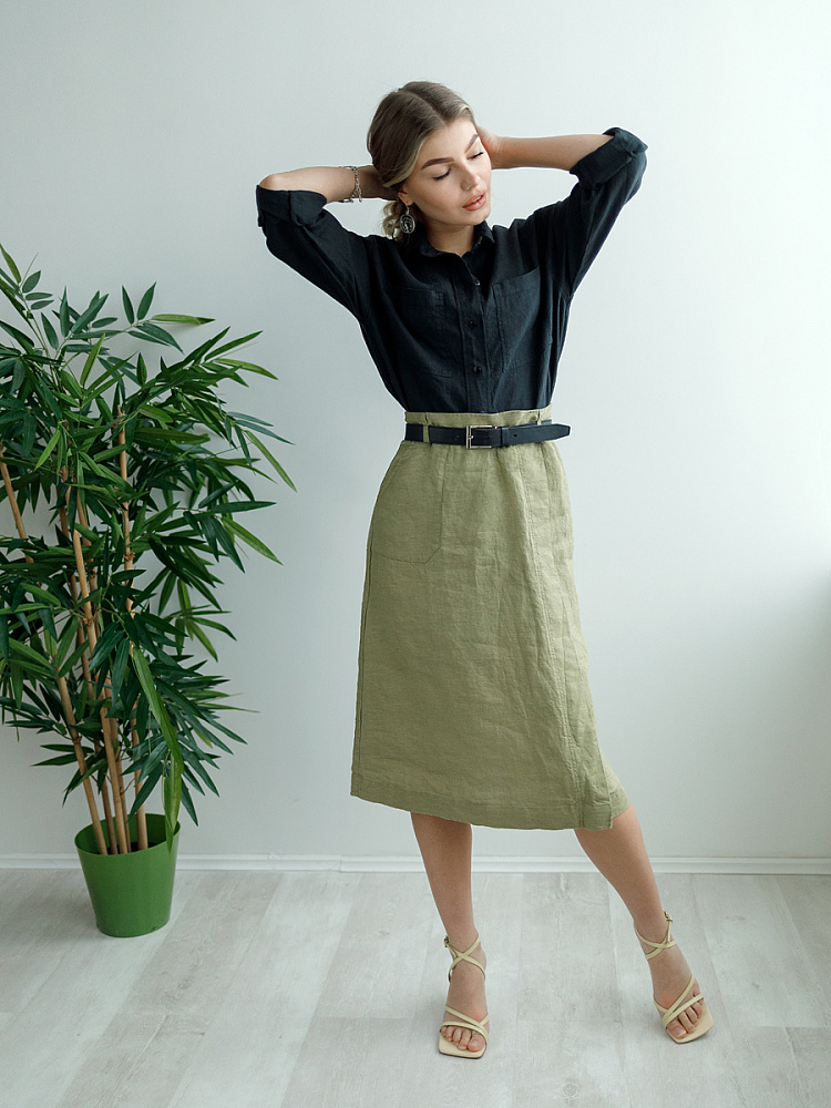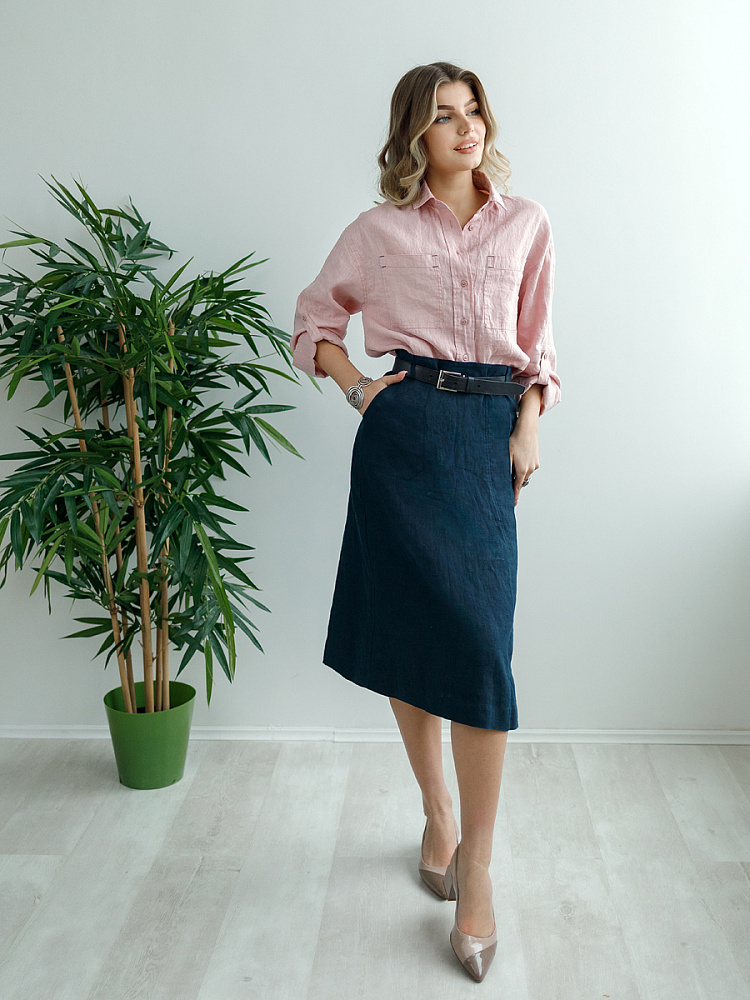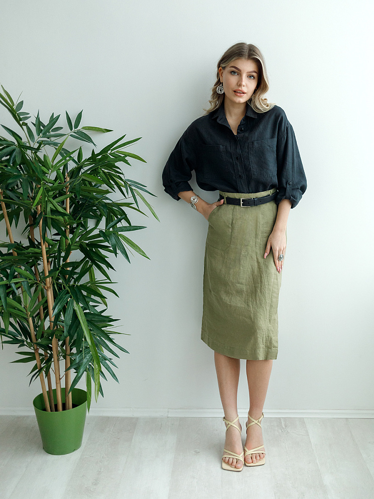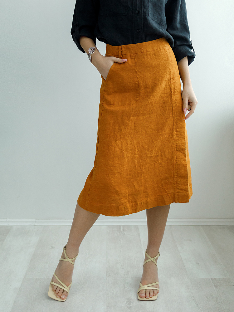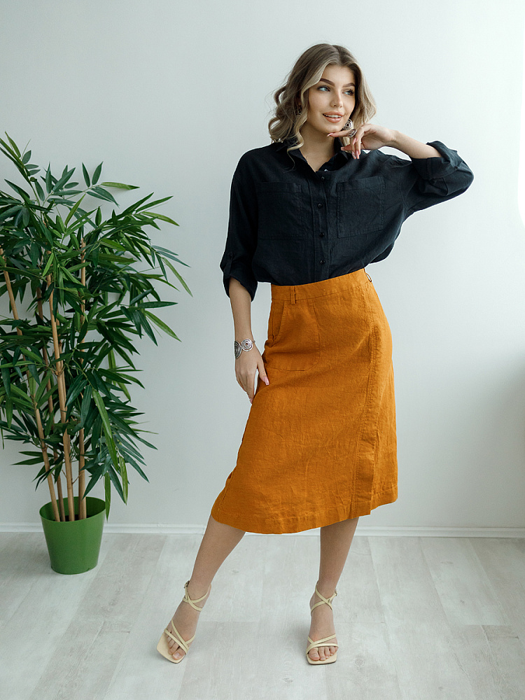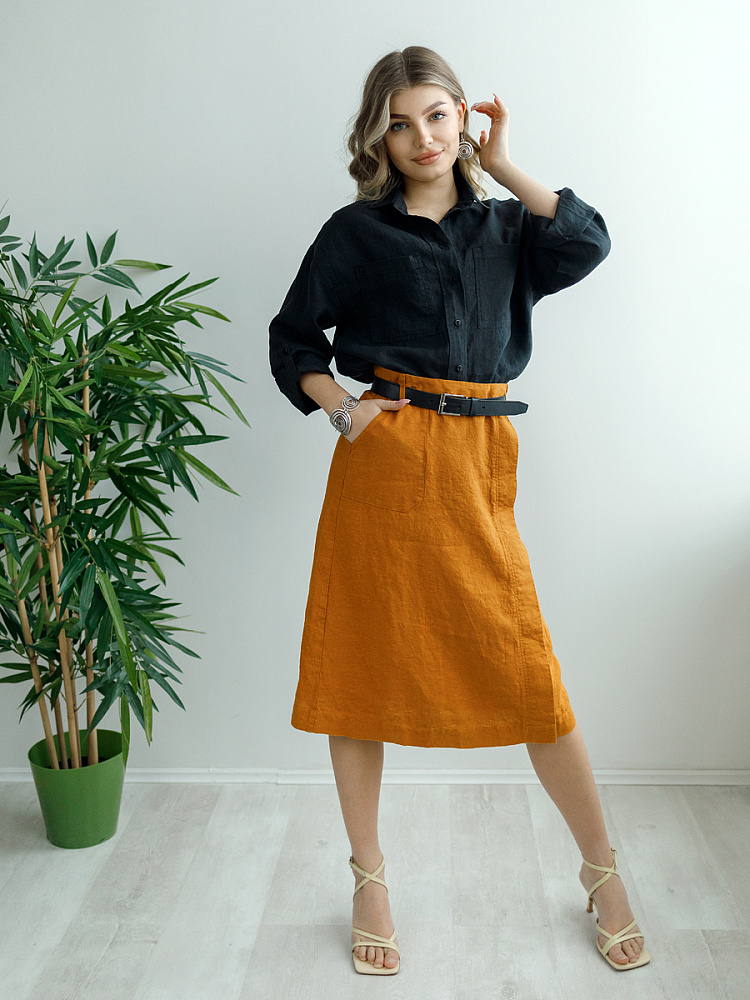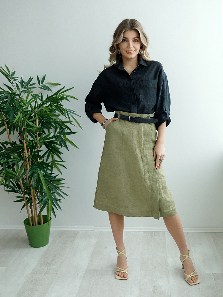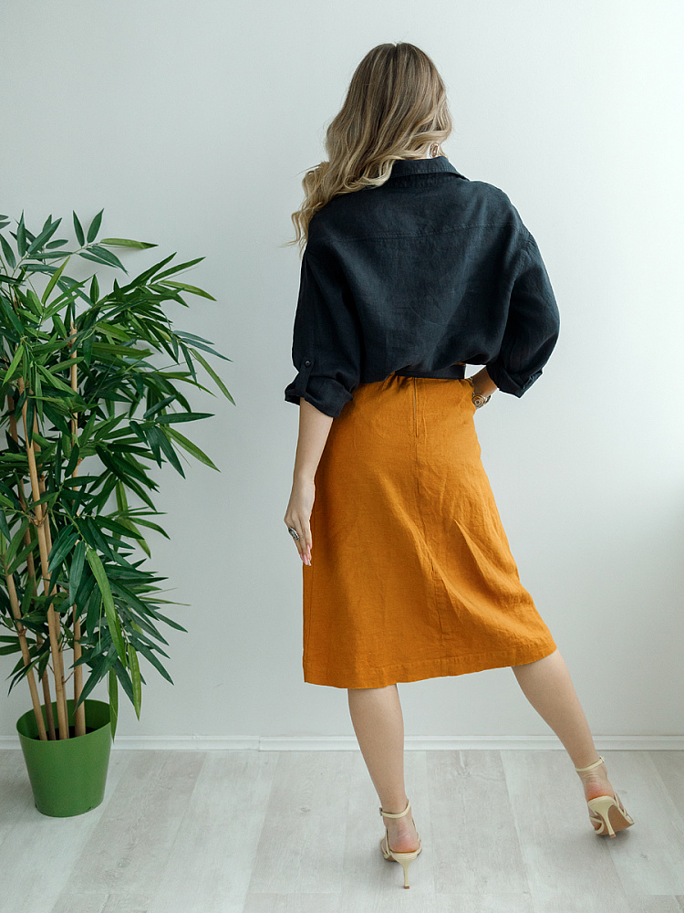 В последние годы прослеживается тенденция на популярность натуральных материалов. Согласитесь, приятнее ходить в одежде, которая выполнена не из синтетики, а из материалов природного происхождения. Харизматичным лидером этого списка является лён, со своими неповторимыми свойствами. Обратите внимание на представленную модель юбки! Чуть расклешённый силуэт в сочетании с длинной ниже линии колена создают стильный образ, который подойдёт любой женщине или девушке. Вертикальная планка вытягивает силуэт, стройнит его и добавляет желаемых сантиметров к росту. Невозможно упустить из виду ассиметричный накладной карман, который привносит немного бесшабашности в правильный геометричный крой. Представленная юбка позволит самые разнообразные миксы с обувью, аксессуарами и компаньонами одежды. Уверены, окружающие по достоинству оценят ваш стильный выбор.