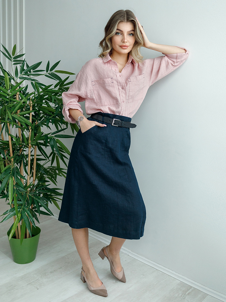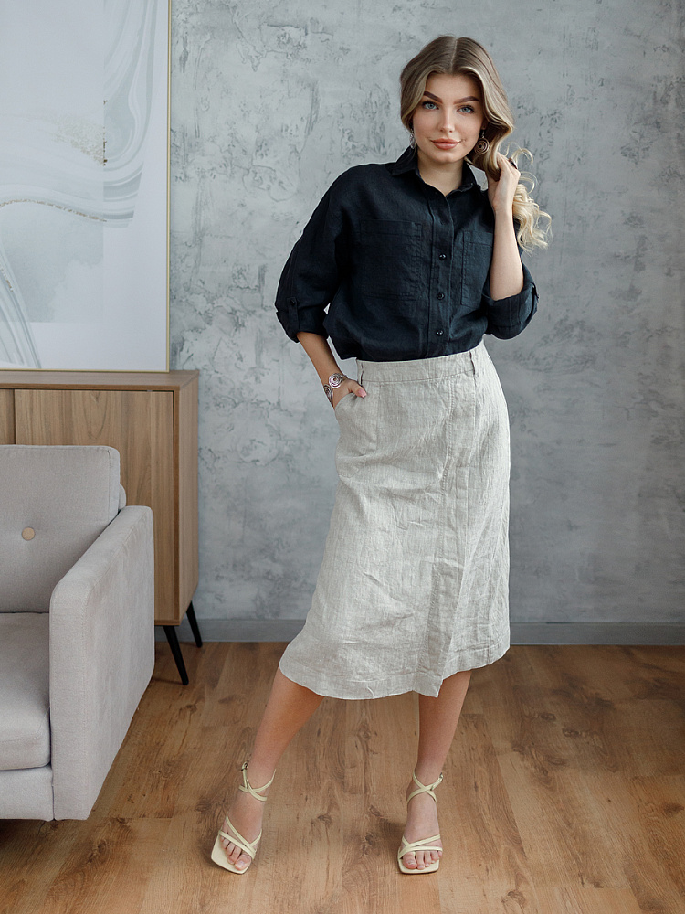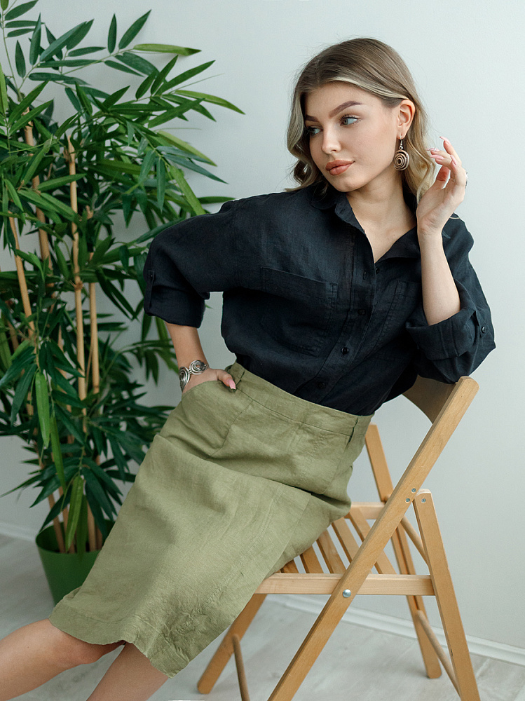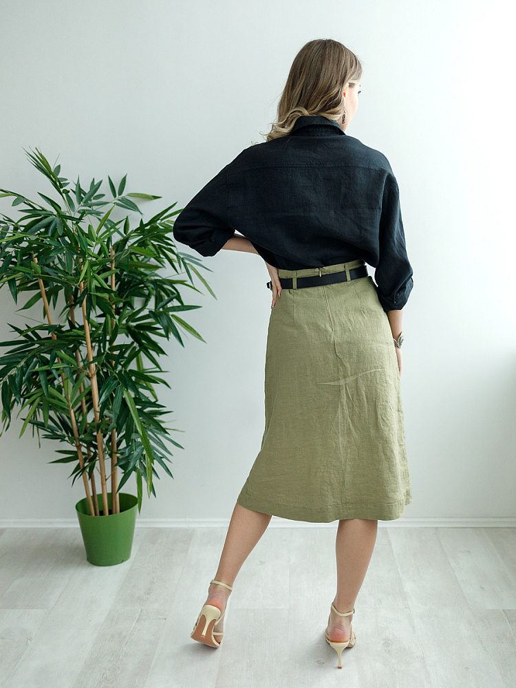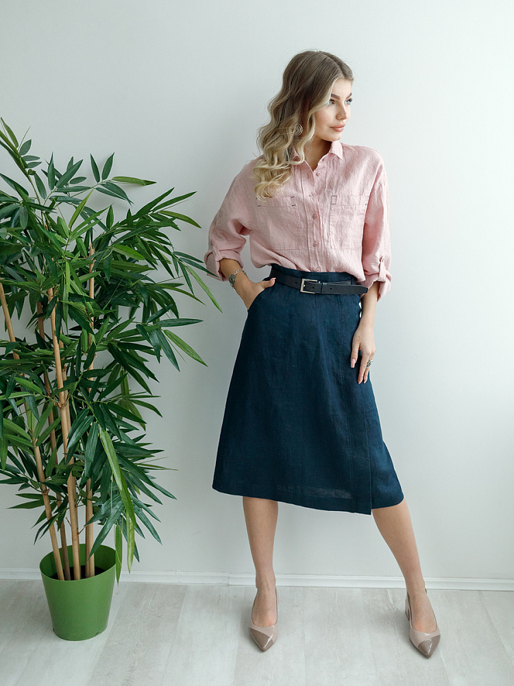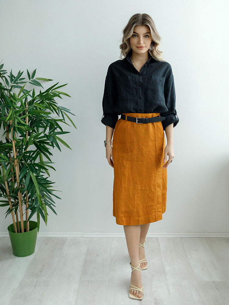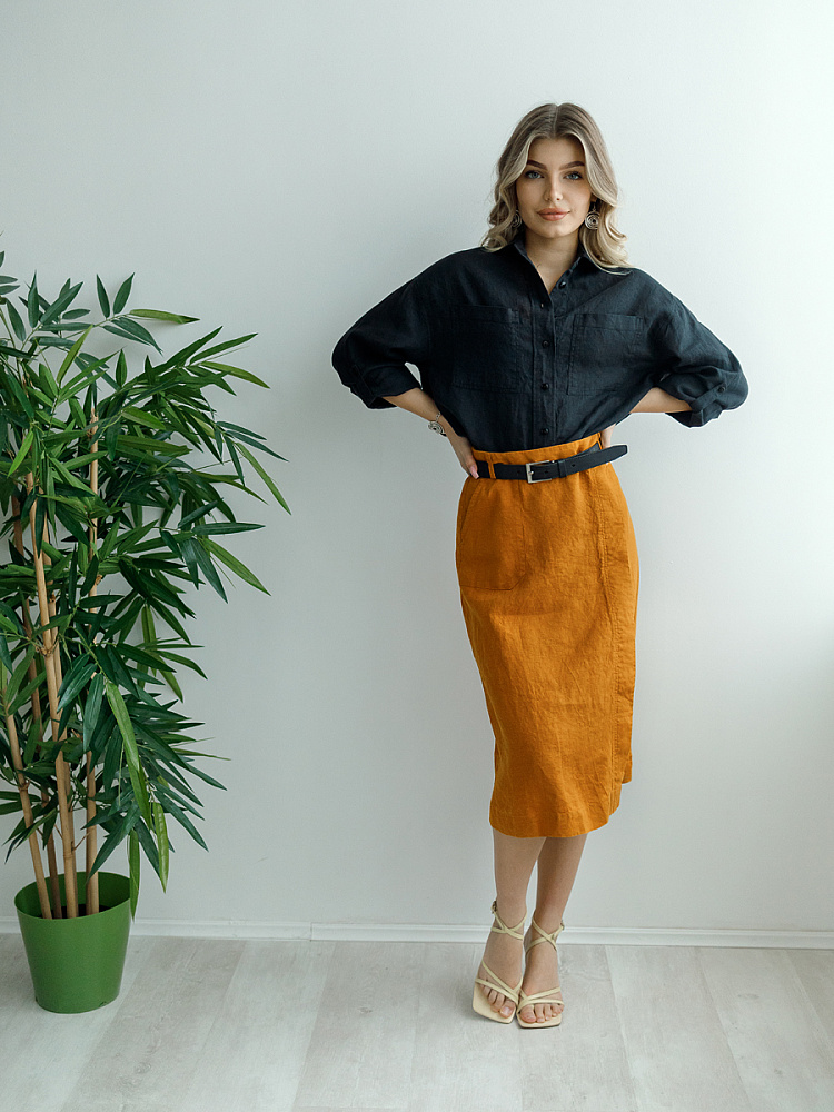 В последние годы прослеживается тенденция на популярность натуральных материалов. Согласитесь, приятнее ходить в одежде, которая выполнена не из синтетики, а из материалов природного происхождения. Харизматичным лидером этого списка является лён, со своими неповторимыми свойствами. Обратите внимание на представленную модель юбки! Чуть расклешённый силуэт в сочетании с длинной ниже линии колена создают стильный образ, который подойдёт любой женщине или девушке. Вертикальная планка вытягивает силуэт, стройнит его и добавляет желаемых сантиметров к росту. Невозможно упустить из виду ассиметричный накладной карман, который привносит немного бесшабашности в правильный геометричный крой. Представленная юбка позволит самые разнообразные миксы с обувью, аксессуарами и компаньонами одежды. Уверены, окружающие по достоинству оценят ваш стильный выбор.