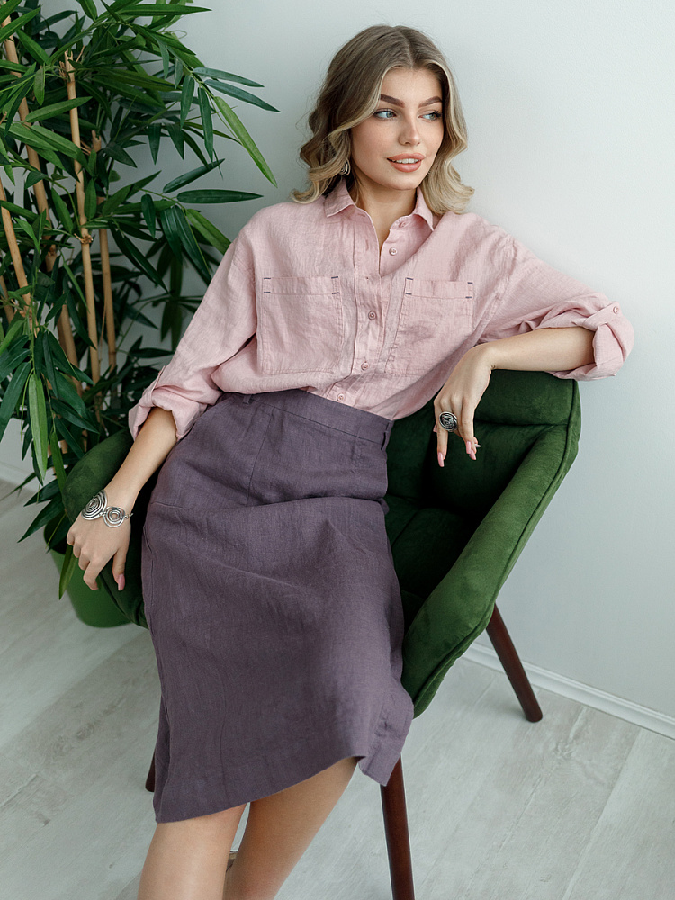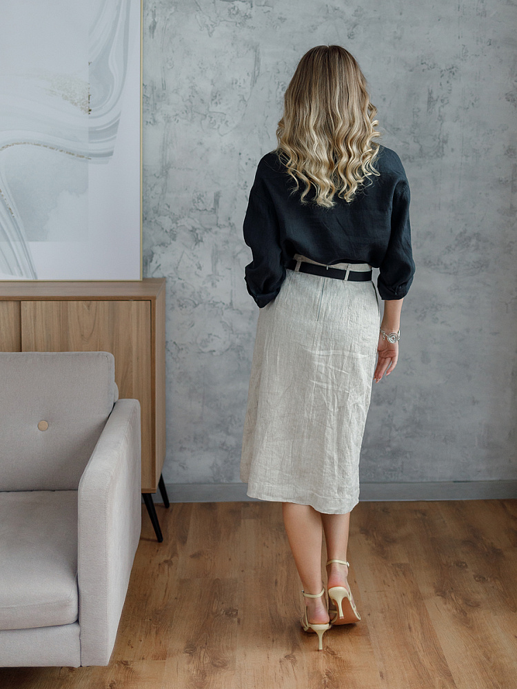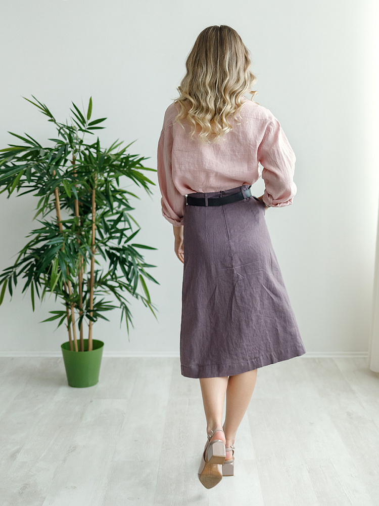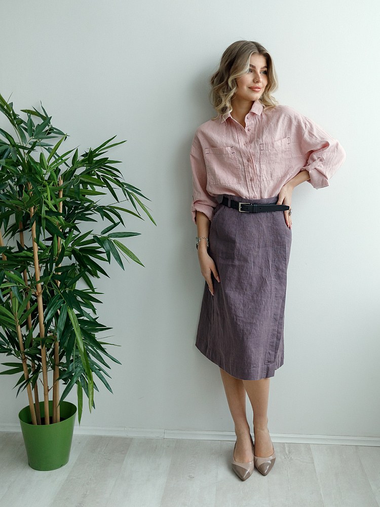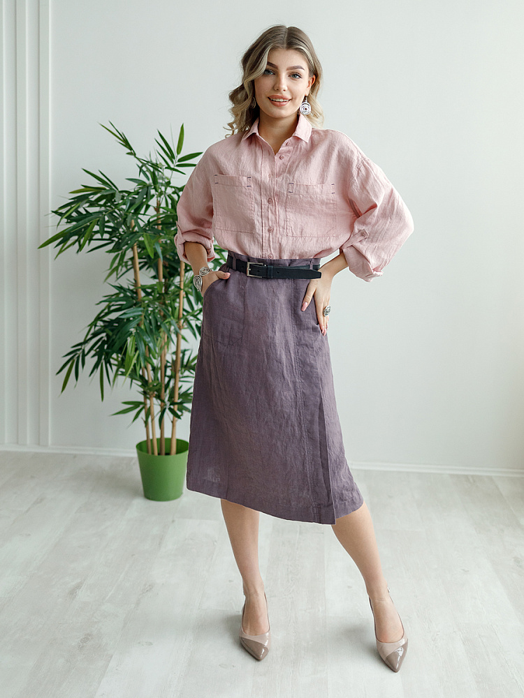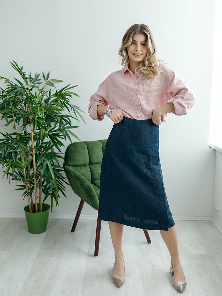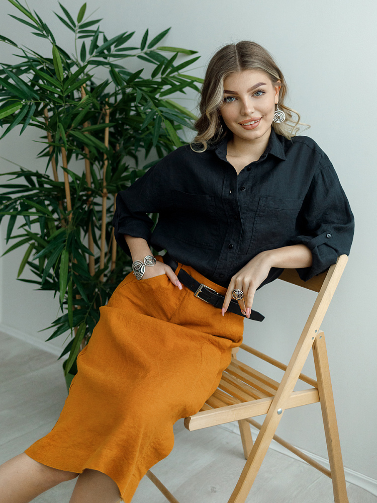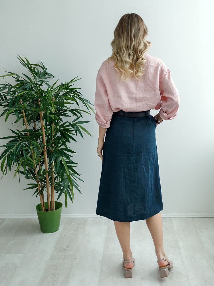 В последние годы прослеживается тенденция на популярность натуральных материалов. Согласитесь, приятнее ходить в одежде, которая выполнена не из синтетики, а из материалов природного происхождения. Харизматичным лидером этого списка является лён, со своими неповторимыми свойствами. Обратите внимание на представленную модель юбки! Чуть расклешённый силуэт в сочетании с длинной ниже линии колена создают стильный образ, который подойдёт любой женщине или девушке. Вертикальная планка вытягивает силуэт, стройнит его и добавляет желаемых сантиметров к росту. Невозможно упустить из виду ассиметричный накладной карман, который привносит немного бесшабашности в правильный геометричный крой. Представленная юбка позволит самые разнообразные миксы с обувью, аксессуарами и компаньонами одежды. Уверены, окружающие по достоинству оценят ваш стильный выбор.