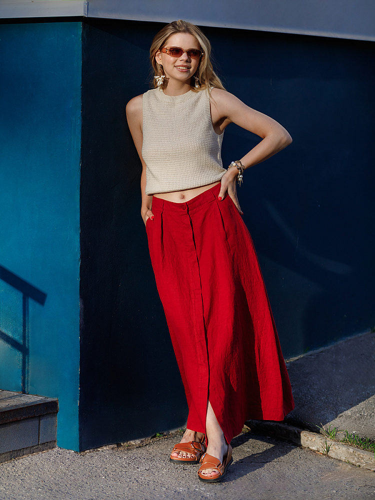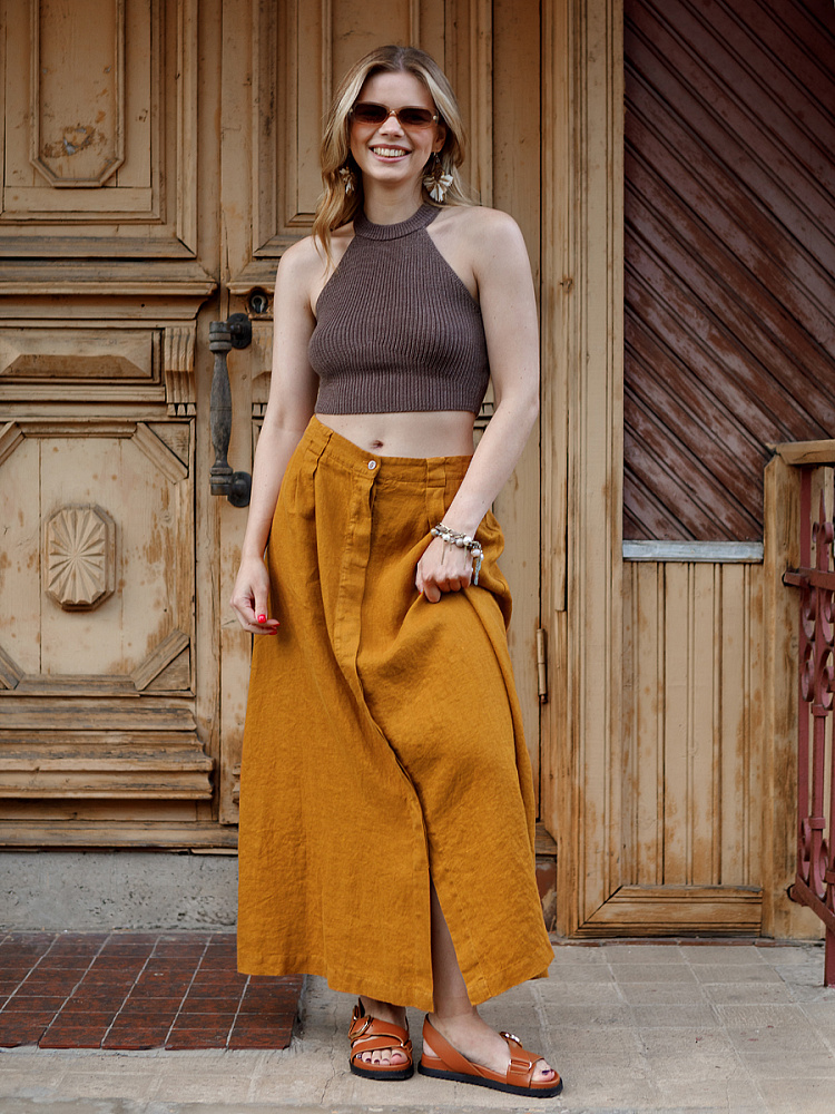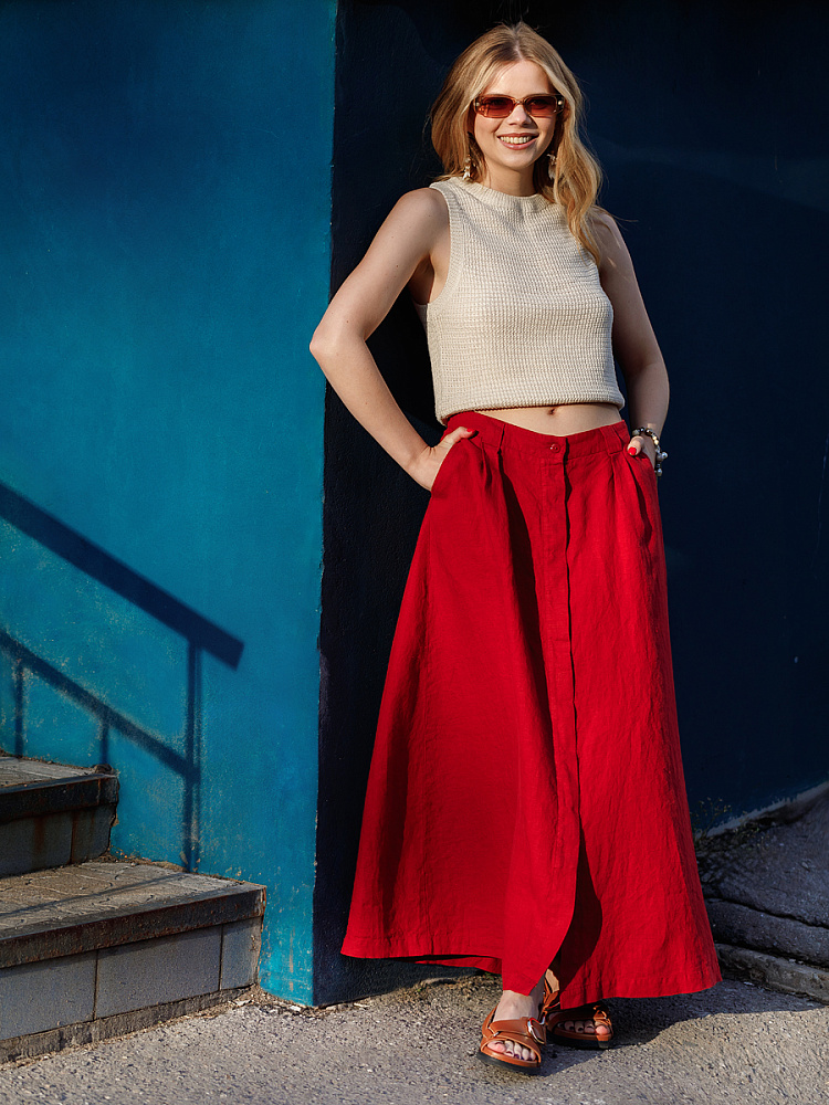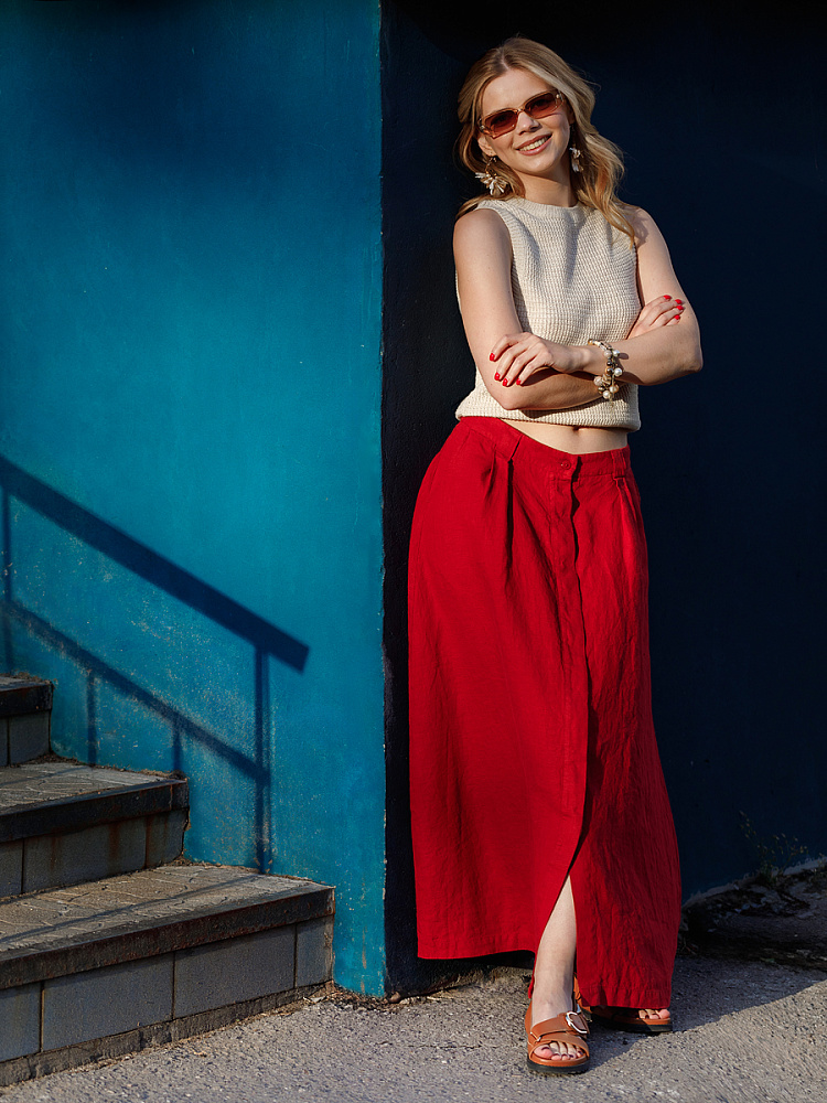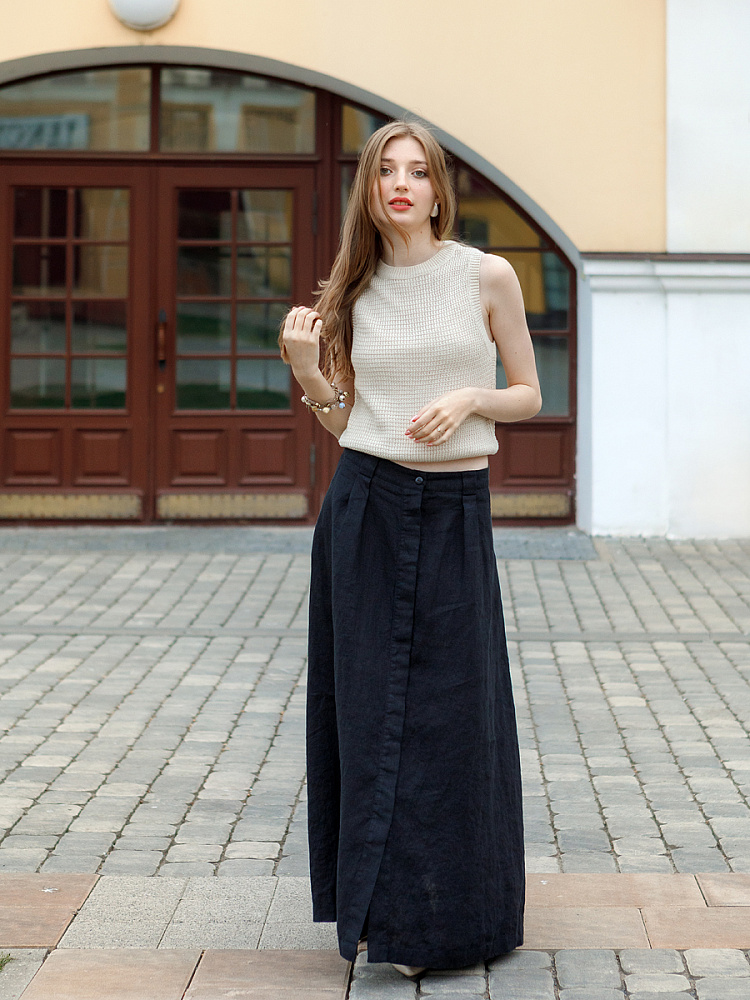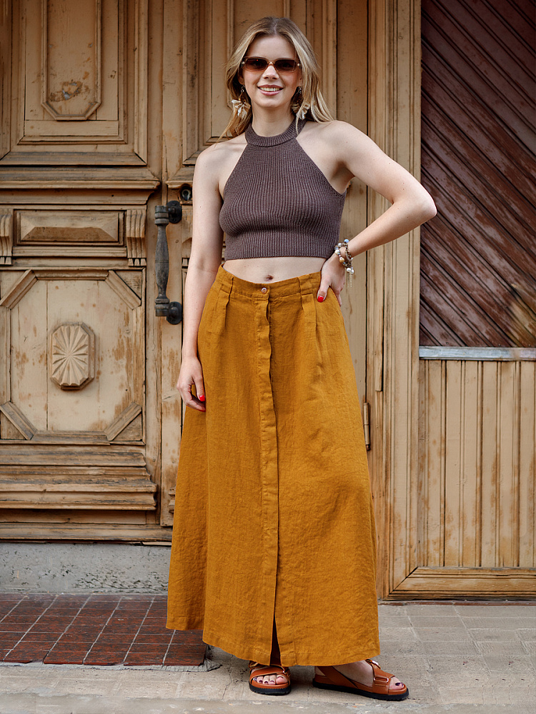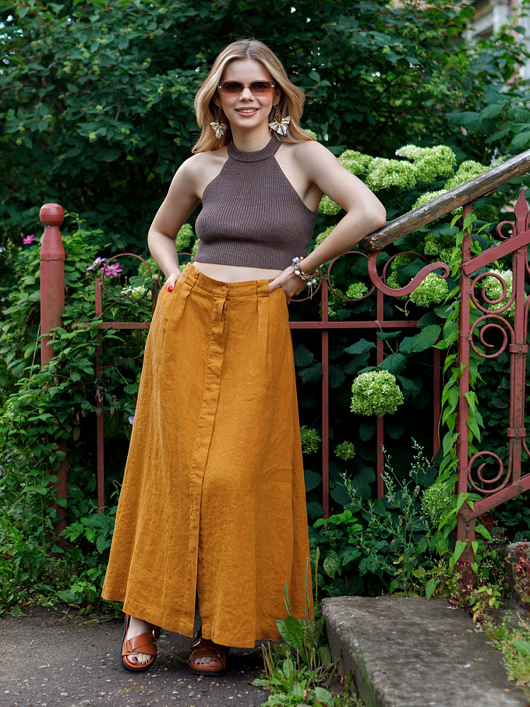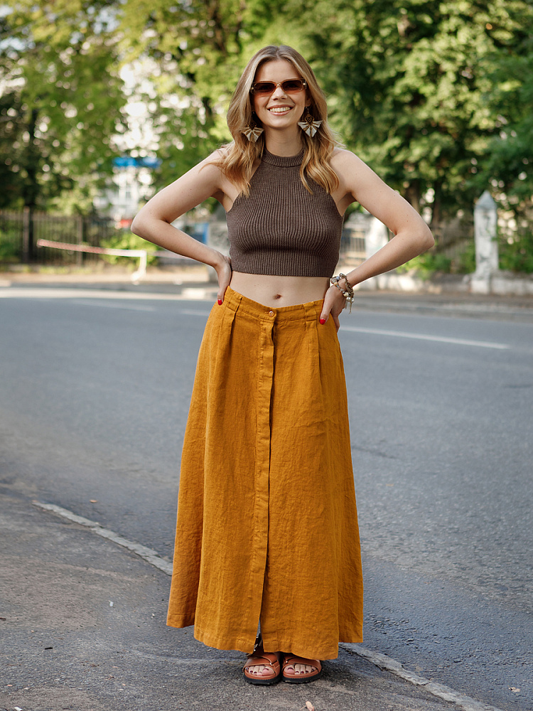 Юбка макси всегда заставляет обратить на себя внимание. Её пропорции визуально удлиняют силуэт, создавая статный и стильный образ. Нетривиальный внешний вид выгодно выделяется на фоне моделей из кэжуала и денима. Харизматичный внешний вид сопровождается максимальным комфортом для обладательницы. Вероятно поэтому, данные модели все больше и чаще встречаются в повседневном гардеробе женщин и девушек. И если у вас еще нет такой модели, вам стоит обратить внимание на представленную модель! Натуральный лён создаёт неповторимую жатую текстуру, которая умело воплощает все задумки дизайнера. А – силуэт рисует грациозный силуэт, позволяя не думать о несовершенствах фигуры. Вертикаль в виде потайной застёжки на пуговицы «добавит» сантиметров вашему росту. Лаконичные защипы по талии привносят декоративной эстетики модели, а боковые карманы добавляют функционала. Модель юбки универсальна – предполагает самую разнообразную обувь, будь то изящный каблук или спортивные кеды на сплошном ходу. Цветовая гамма удовлетворит самую «закоренелую» модницу и позволит подобрать свой оттенок.