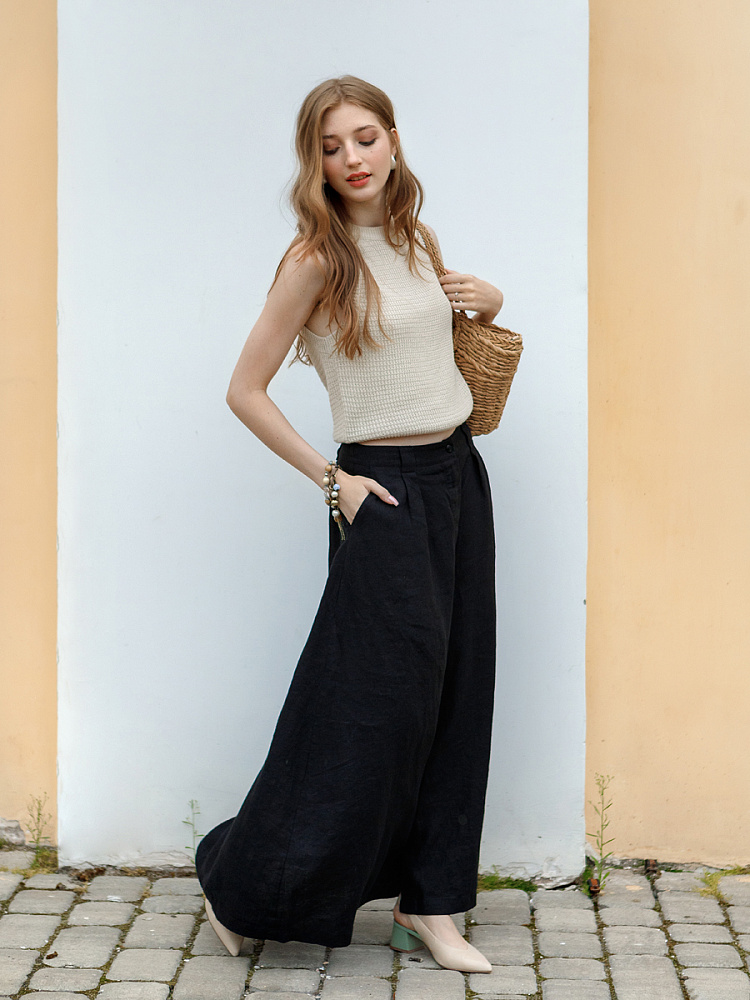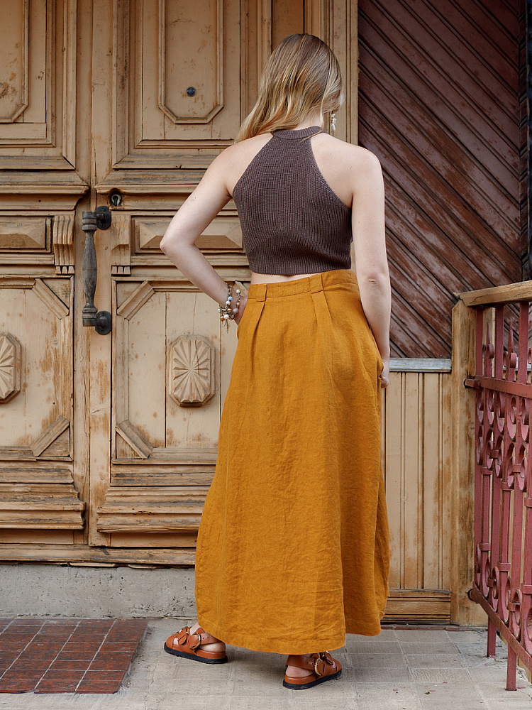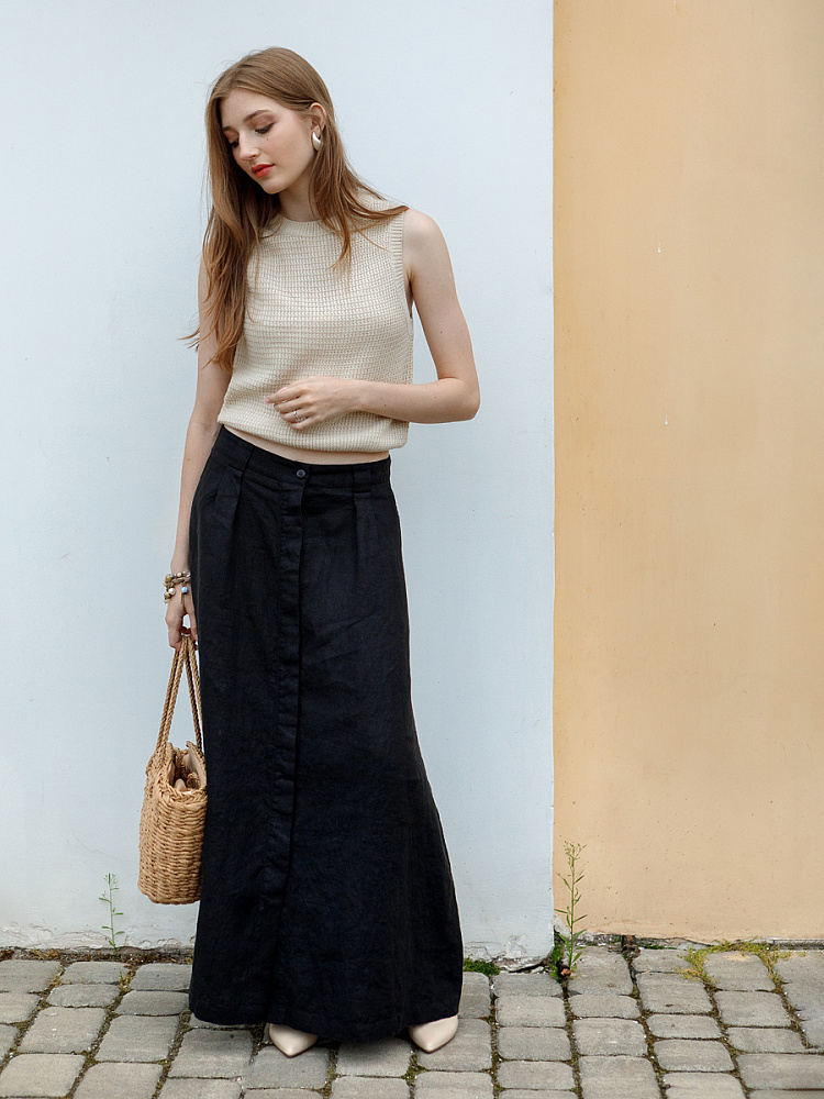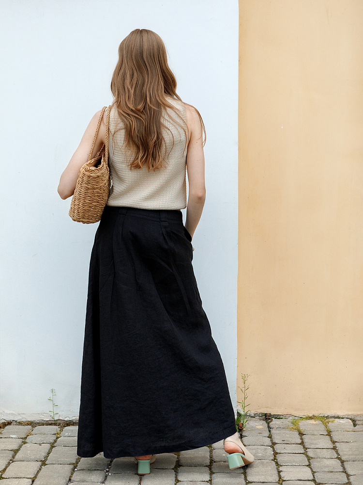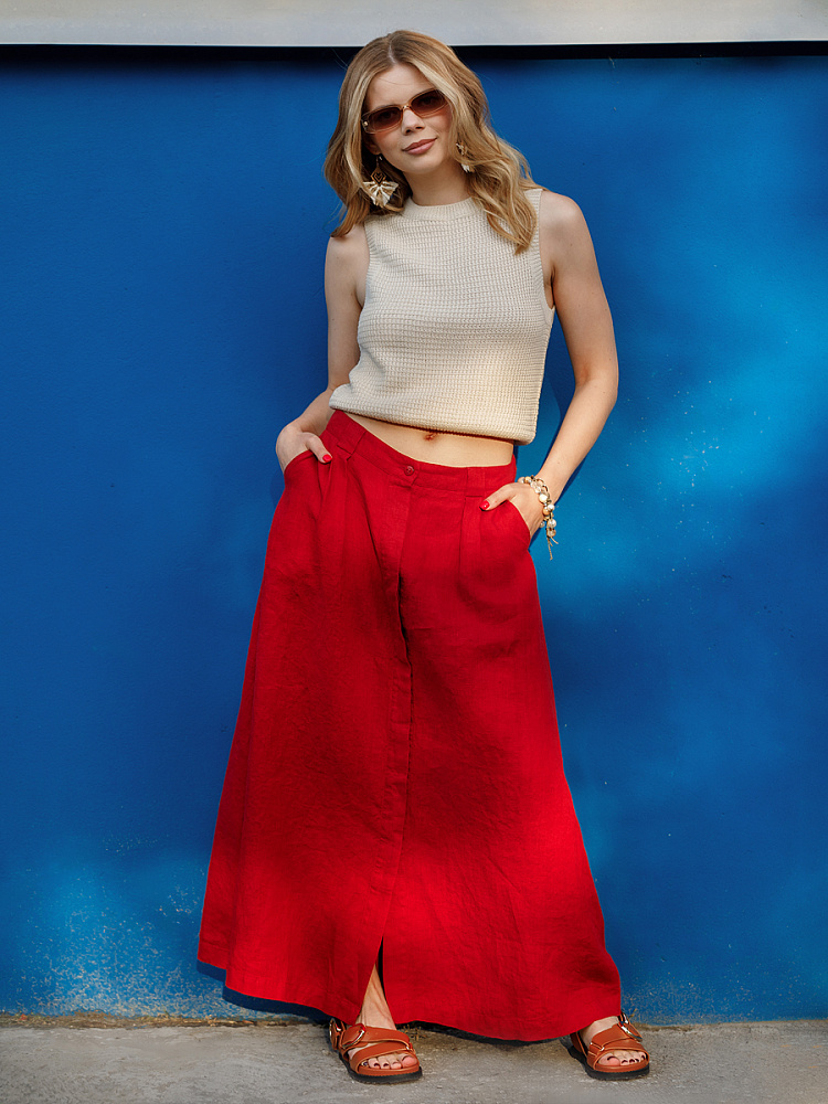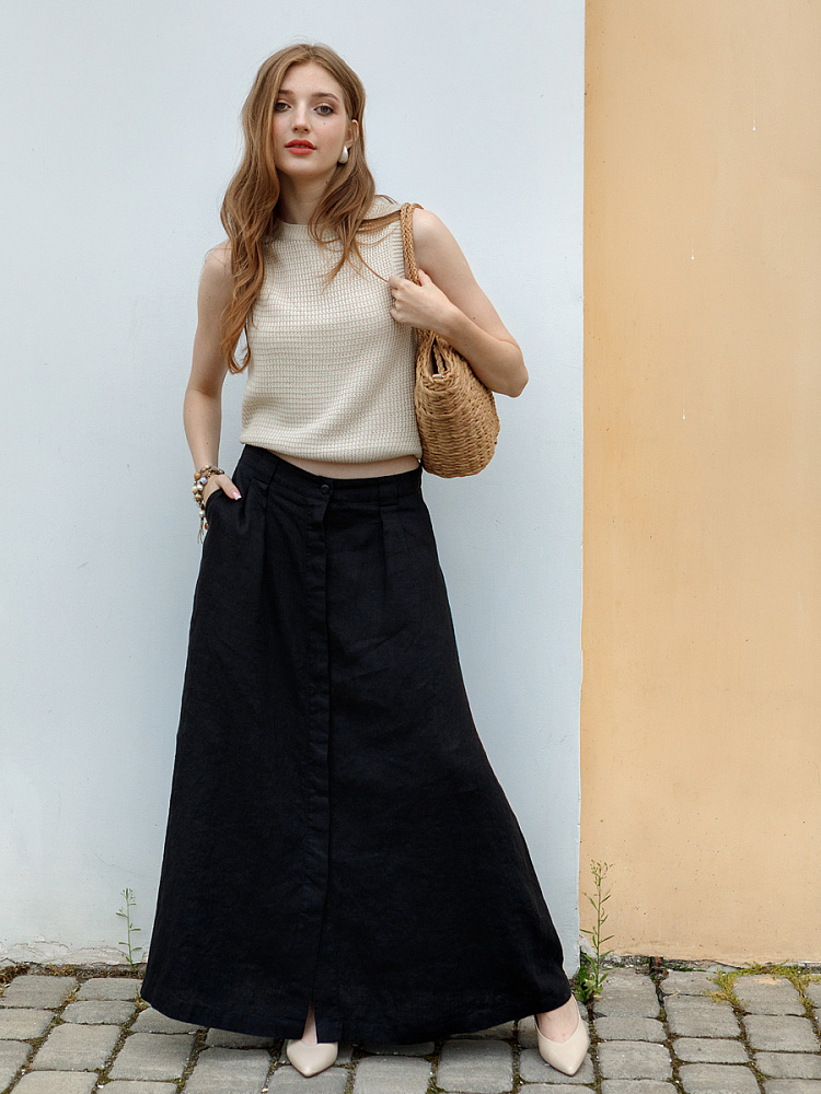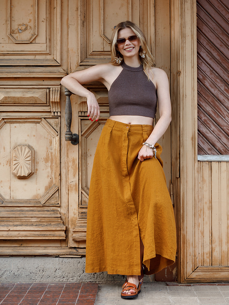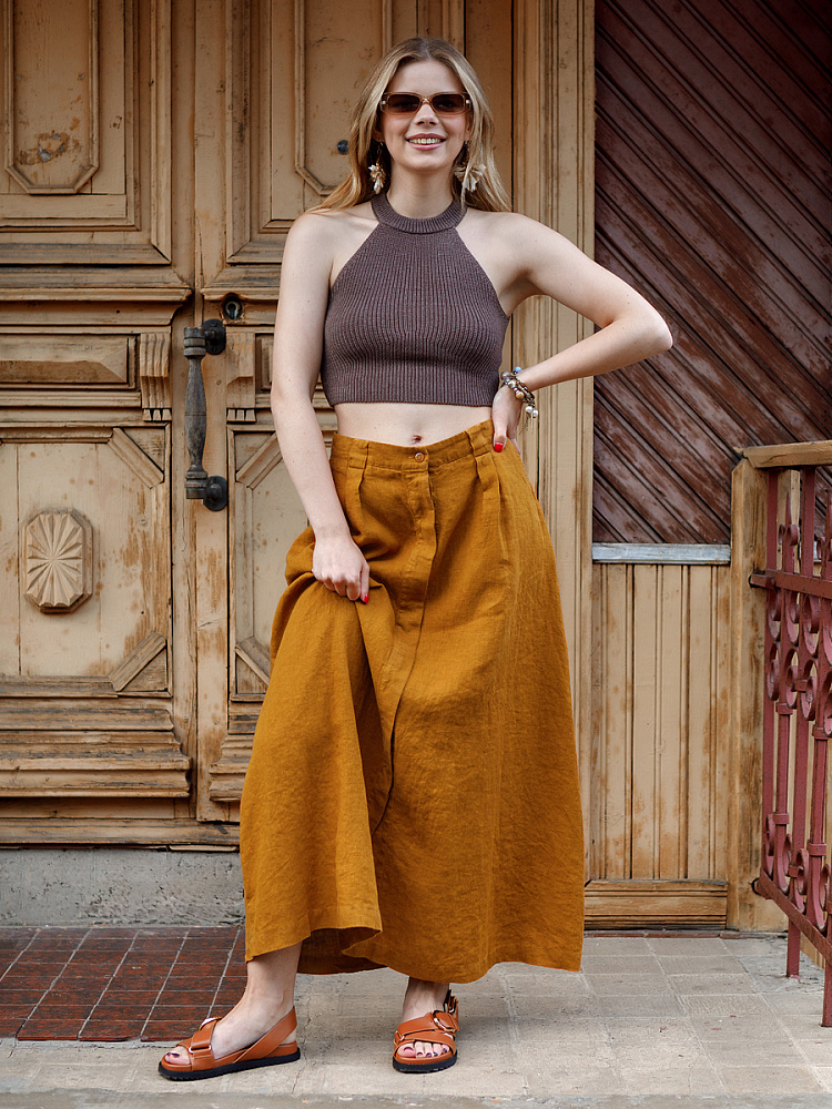 Юбка макси всегда заставляет обратить на себя внимание. Её пропорции визуально удлиняют силуэт, создавая статный и стильный образ. Нетривиальный внешний вид выгодно выделяется на фоне моделей из кэжуала и денима. Харизматичный внешний вид сопровождается максимальным комфортом для обладательницы. Вероятно поэтому, данные модели все больше и чаще встречаются в повседневном гардеробе женщин и девушек. И если у вас еще нет такой модели, вам стоит обратить внимание на представленную модель! Натуральный лён создаёт неповторимую жатую текстуру, которая умело воплощает все задумки дизайнера. А – силуэт рисует грациозный силуэт, позволяя не думать о несовершенствах фигуры. Вертикаль в виде потайной застёжки на пуговицы «добавит» сантиметров вашему росту. Лаконичные защипы по талии привносят декоративной эстетики модели, а боковые карманы добавляют функционала. Модель юбки универсальна – предполагает самую разнообразную обувь, будь то изящный каблук или спортивные кеды на сплошном ходу. Цветовая гамма удовлетворит самую «закоренелую» модницу и позволит подобрать свой оттенок.