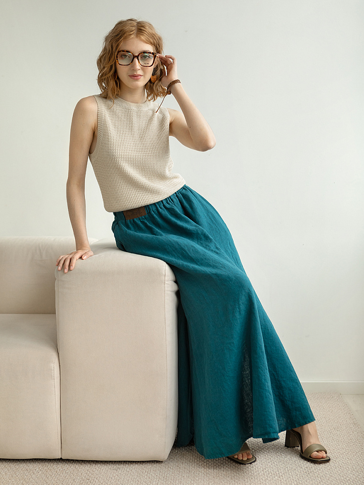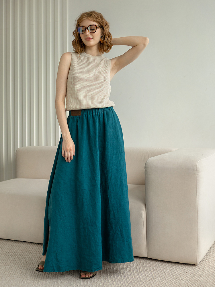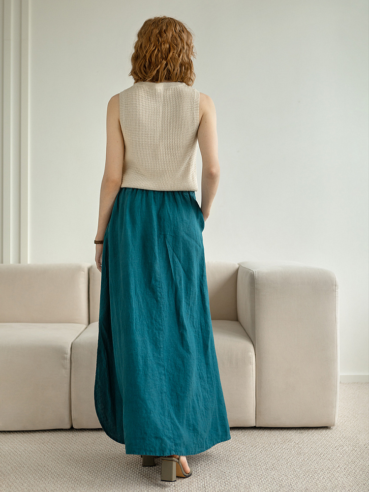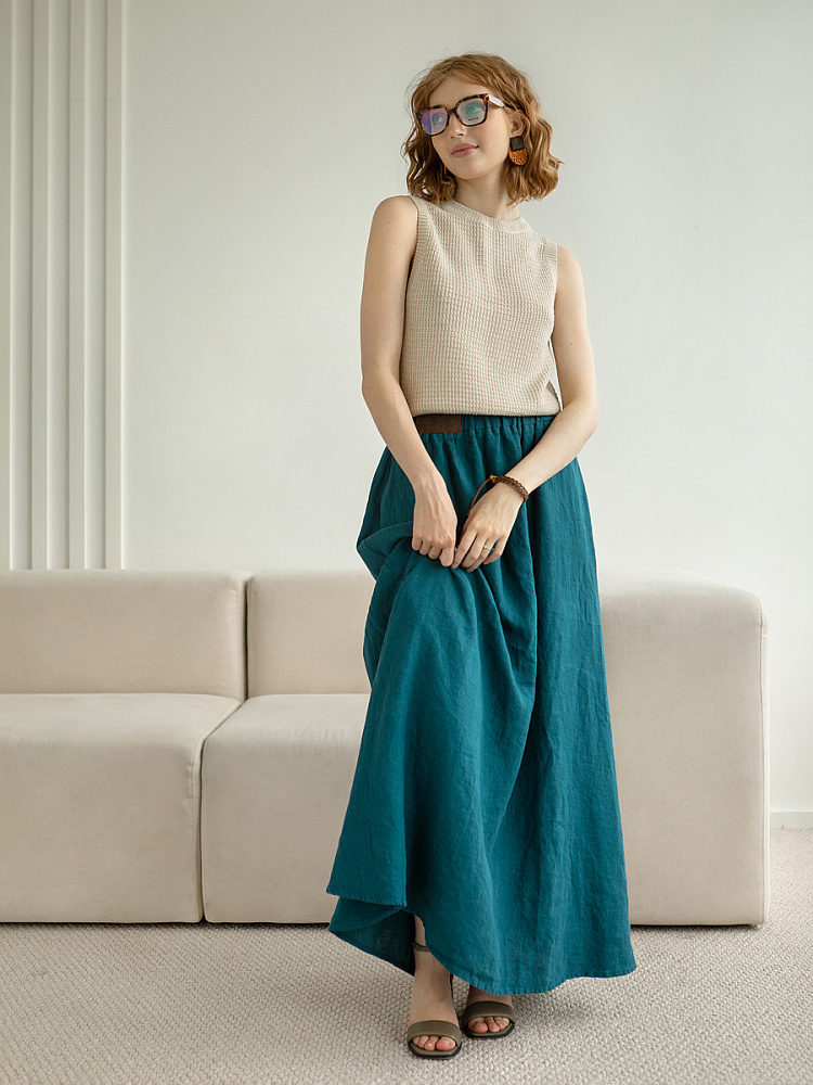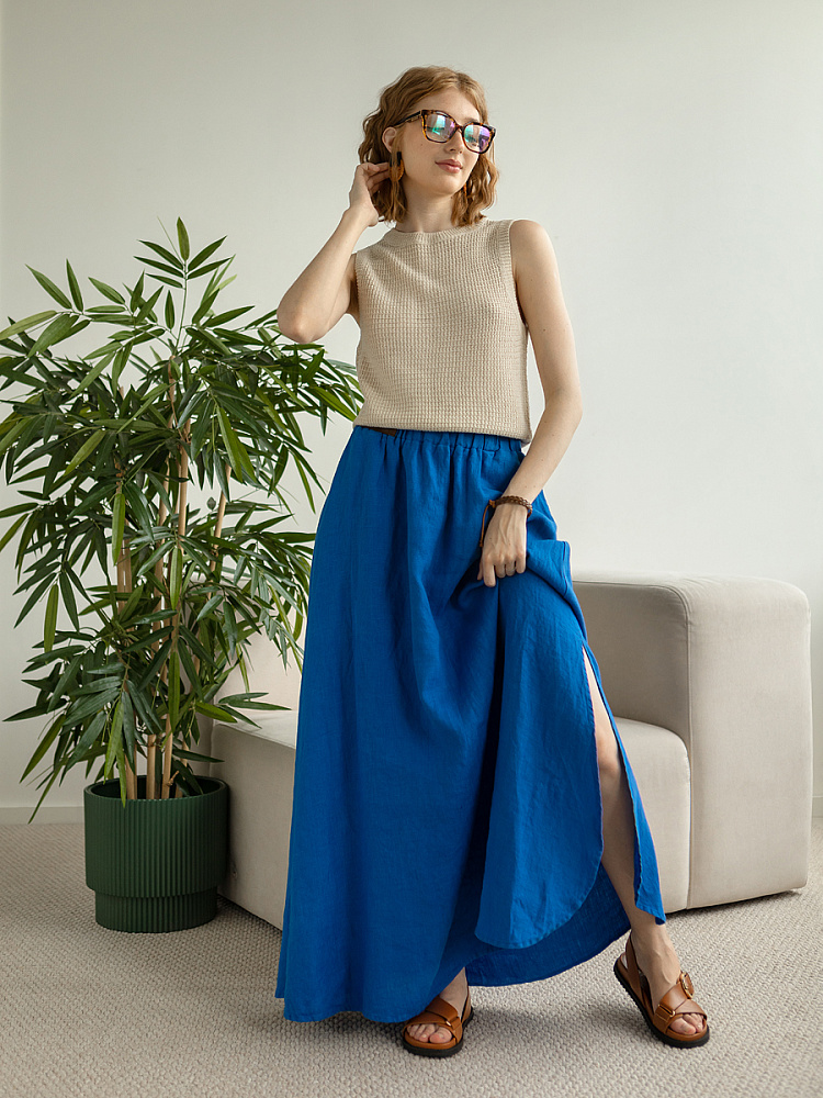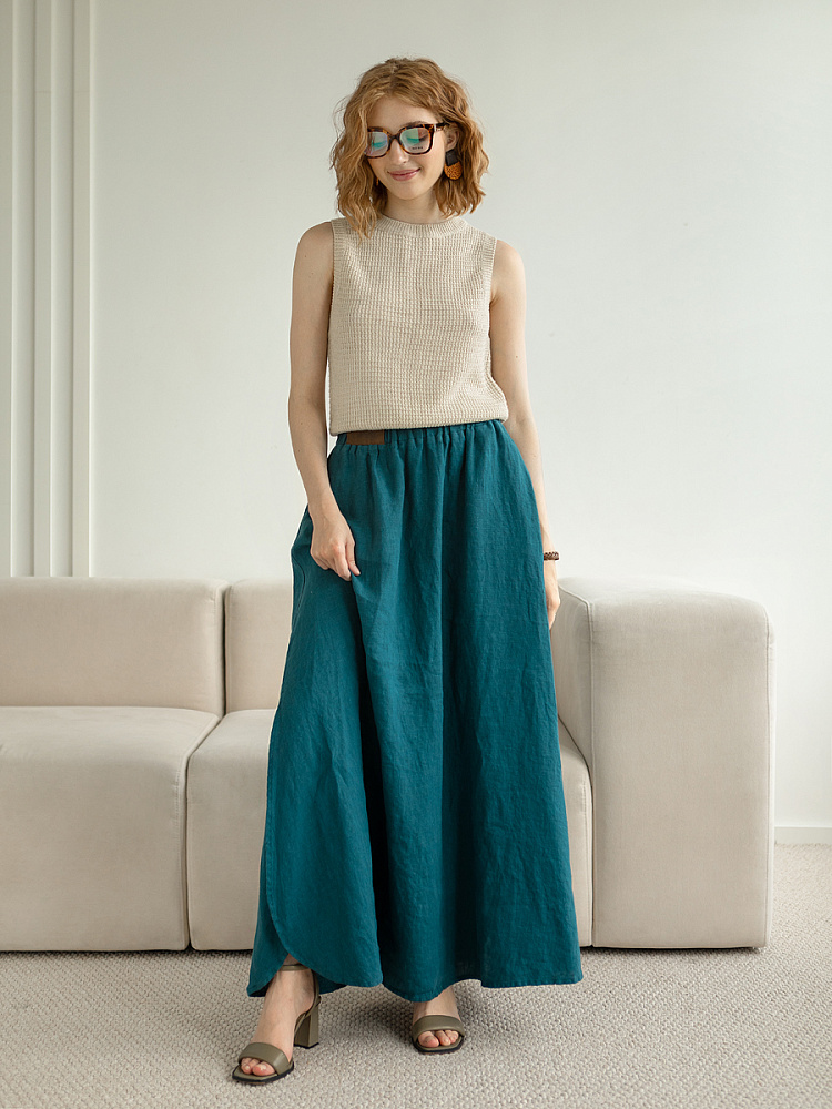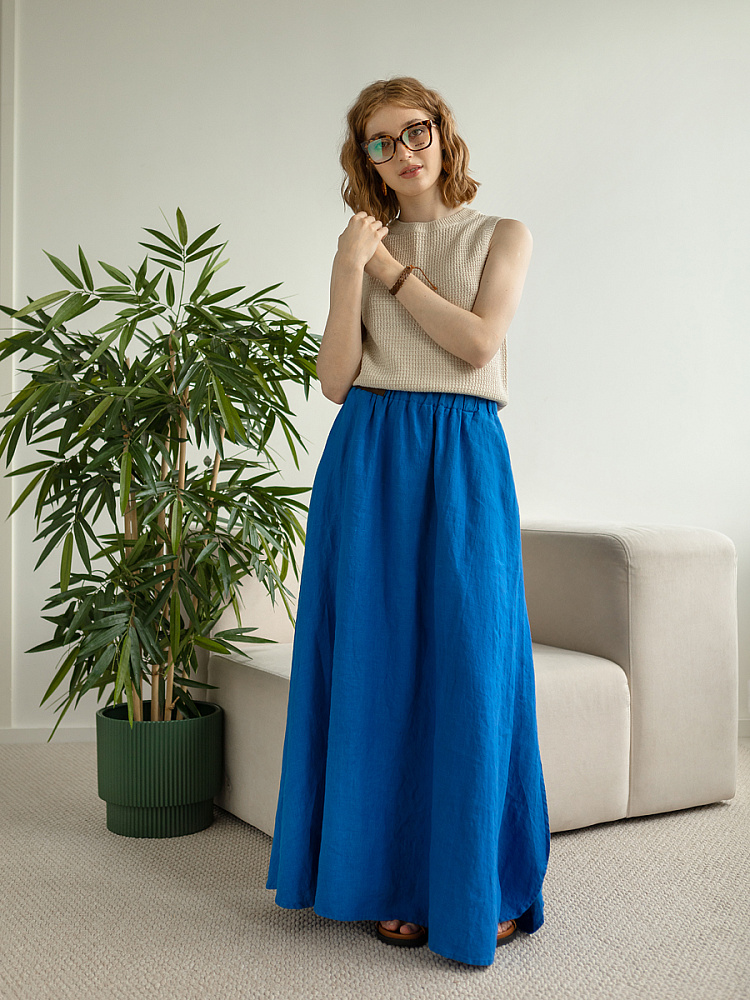 Юбка - как олицетворение женственности. Ей должна обладать каждая уважающая себя женщина и девушка. Этот элемент гардероба способен передать характер своей обладательницы. От нежного и романтичного, до вздорного и решительного. Представленная модель юбки из натурального льна остепенит любую порывистую натуру. Её длина макси придаст женскому силуэту стати и грациозности. Одновременно с этим, свободный силуэт трапеция не будет сковывать движений, обеспечив максимальный комфорт. Такой аргумент весом, когда речь идёт о летней модели юбки. Вспомните как некомфортно в обтягивающих моделях, изготовленных из синтетических волокон. В отличии от них, натуральный лён хорошо пропускает воздух и прекрасно отводит влагу. Не стоит тревожиться о жатой текстуре и быстрой сминаемости – естественность — это тренд последнего времени. Эластичный пояс удобно снимать и надевать, он не сдавливает тело, не вызывает неприятных ощущений на коже. Карманы в боковых швах приятный и стильный акцент этой модели. Глубокий разрез по боку привносит пикантности внешнему виду, позволяя продемонстрировать красивые женские ножки.
