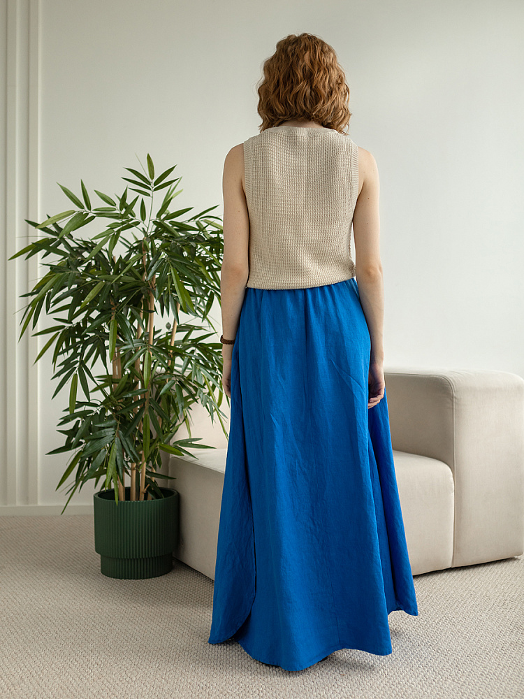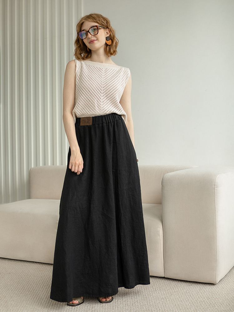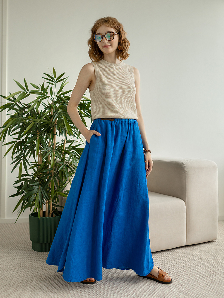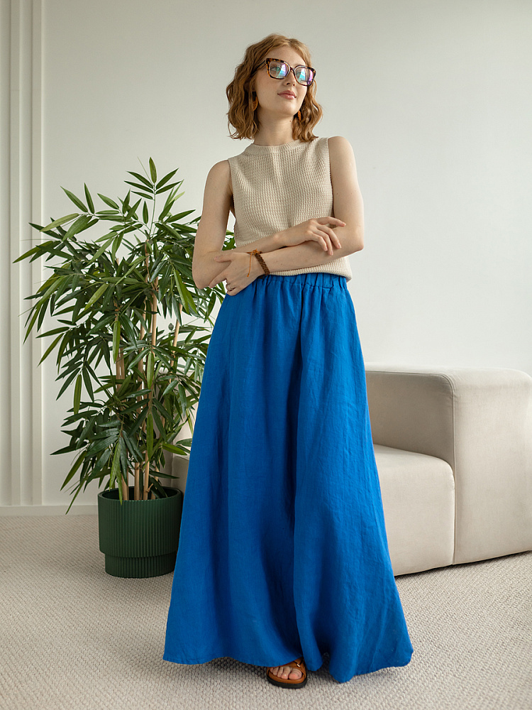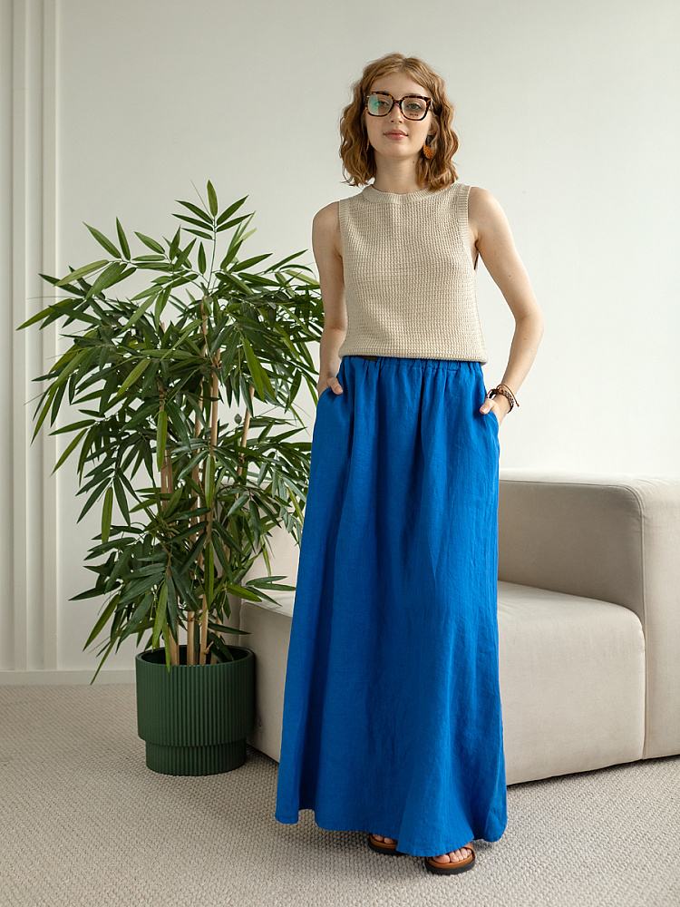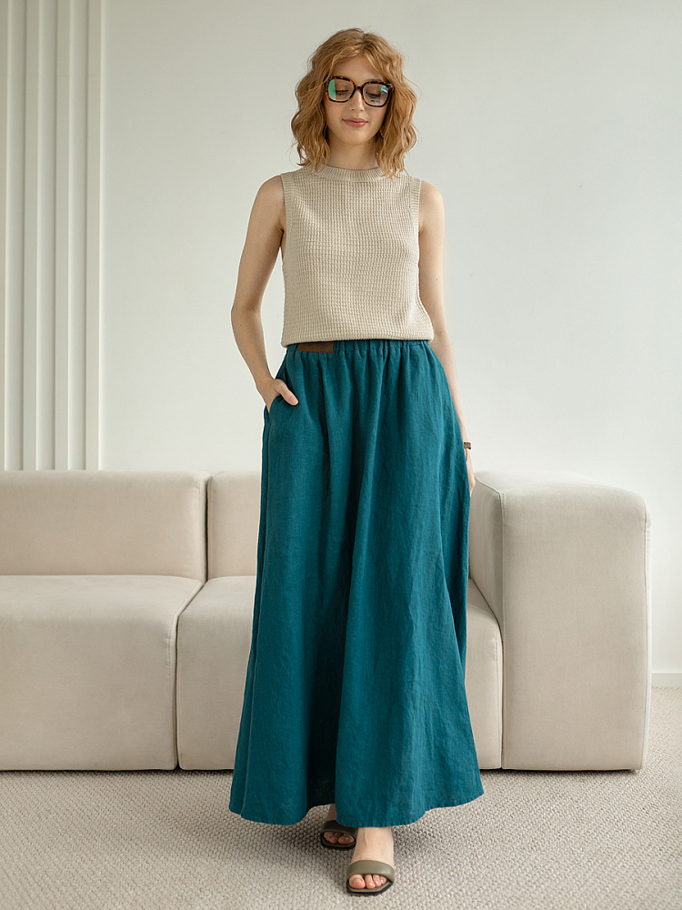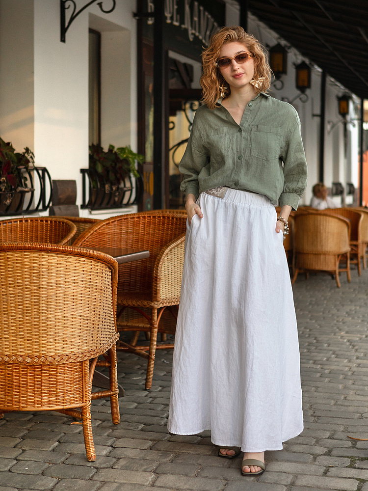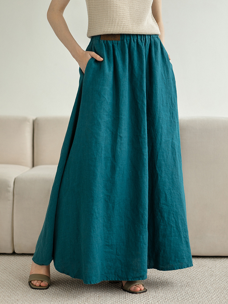 Юбка - как олицетворение женственности. Ей должна обладать каждая уважающая себя женщина и девушка. Этот элемент гардероба способен передать характер своей обладательницы. От нежного и романтичного, до вздорного и решительного. Представленная модель юбки из натурального льна остепенит любую порывистую натуру. Её длина макси придаст женскому силуэту стати и грациозности. Одновременно с этим, свободный силуэт трапеция не будет сковывать движений, обеспечив максимальный комфорт. Такой аргумент весом, когда речь идёт о летней модели юбки. Вспомните как некомфортно в обтягивающих моделях, изготовленных из синтетических волокон. В отличии от них, натуральный лён хорошо пропускает воздух и прекрасно отводит влагу. Не стоит тревожиться о жатой текстуре и быстрой сминаемости – естественность — это тренд последнего времени. Эластичный пояс удобно снимать и надевать, он не сдавливает тело, не вызывает неприятных ощущений на коже. Карманы в боковых швах приятный и стильный акцент этой модели. Глубокий разрез по боку привносит пикантности внешнему виду, позволяя продемонстрировать красивые женские ножки.