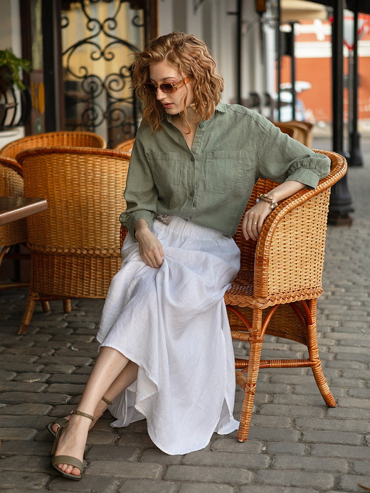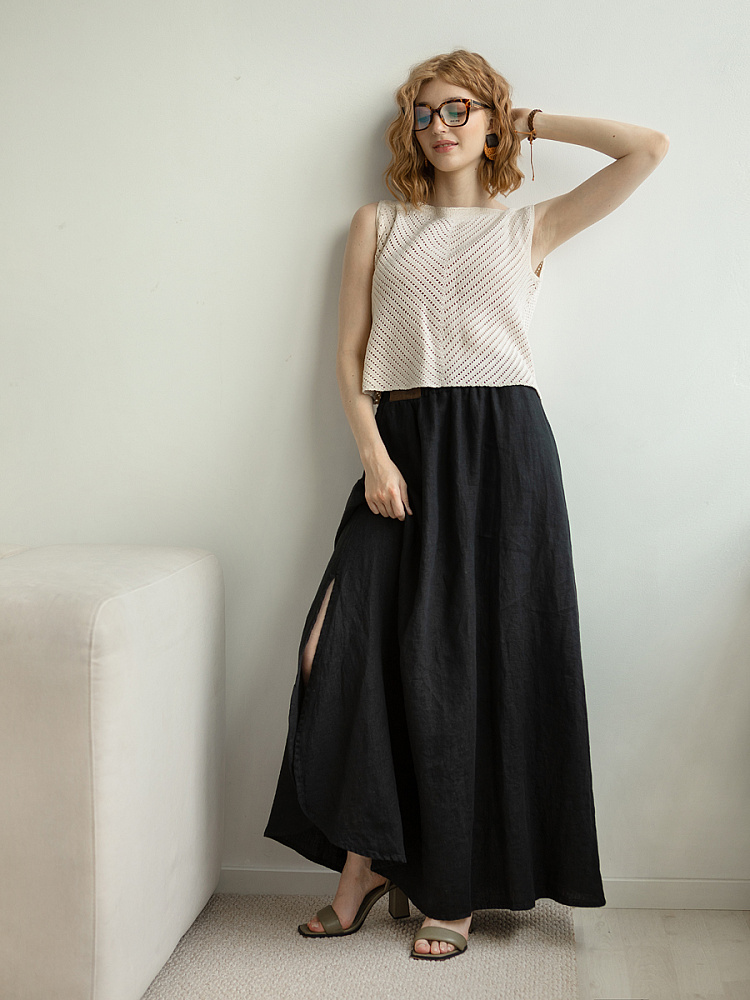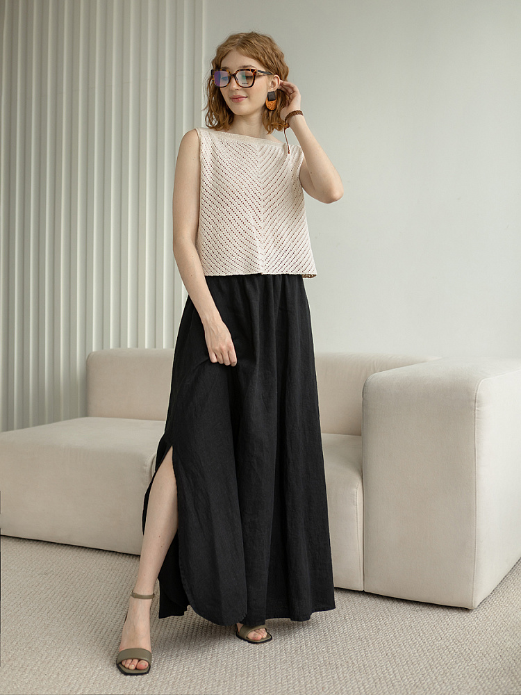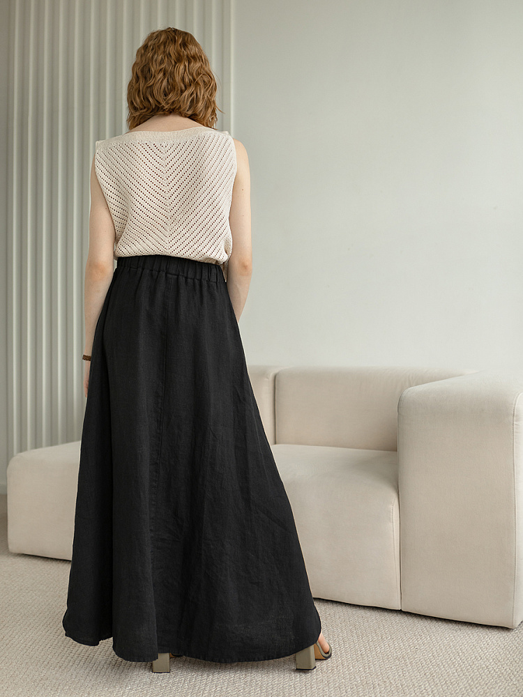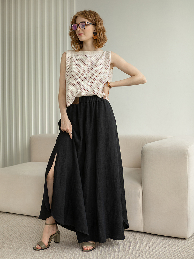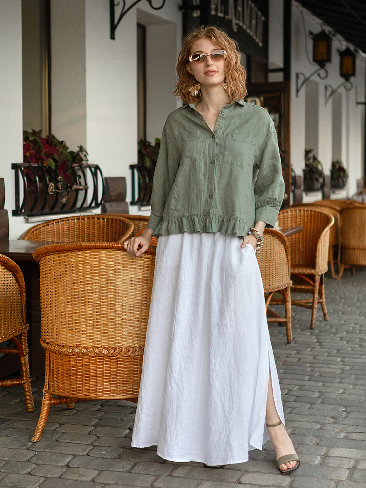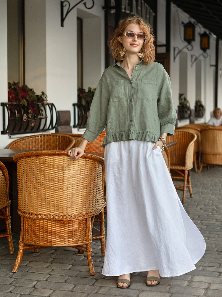 Юбка - как олицетворение женственности. Ей должна обладать каждая уважающая себя женщина и девушка. Этот элемент гардероба способен передать характер своей обладательницы. От нежного и романтичного, до вздорного и решительного. Представленная модель юбки из натурального льна остепенит любую порывистую натуру. Её длина макси придаст женскому силуэту стати и грациозности. Одновременно с этим, свободный силуэт трапеция не будет сковывать движений, обеспечив максимальный комфорт. Такой аргумент весом, когда речь идёт о летней модели юбки. Вспомните как некомфортно в обтягивающих моделях, изготовленных из синтетических волокон. В отличии от них, натуральный лён хорошо пропускает воздух и прекрасно отводит влагу. Не стоит тревожиться о жатой текстуре и быстрой сминаемости – естественность — это тренд последнего времени. Эластичный пояс удобно снимать и надевать, он не сдавливает тело, не вызывает неприятных ощущений на коже. Карманы в боковых швах приятный и стильный акцент этой модели. Глубокий разрез по боку привносит пикантности внешнему виду, позволяя продемонстрировать красивые женские ножки.