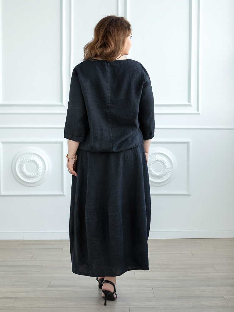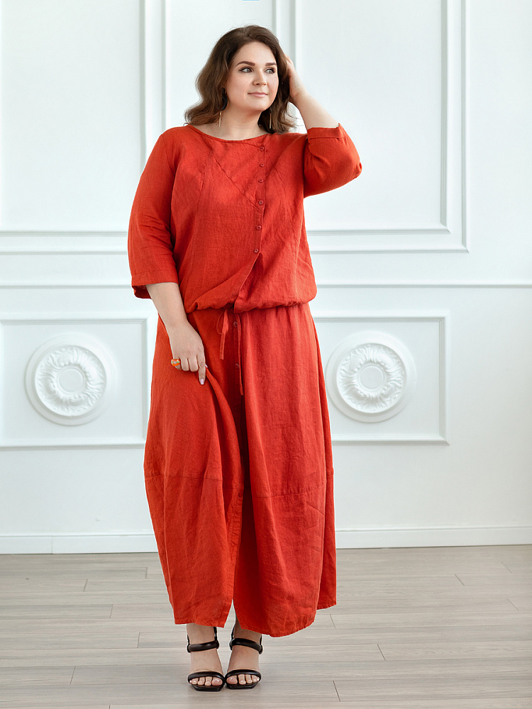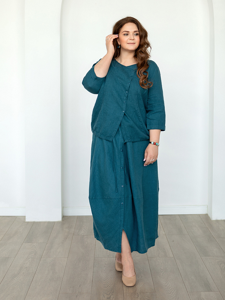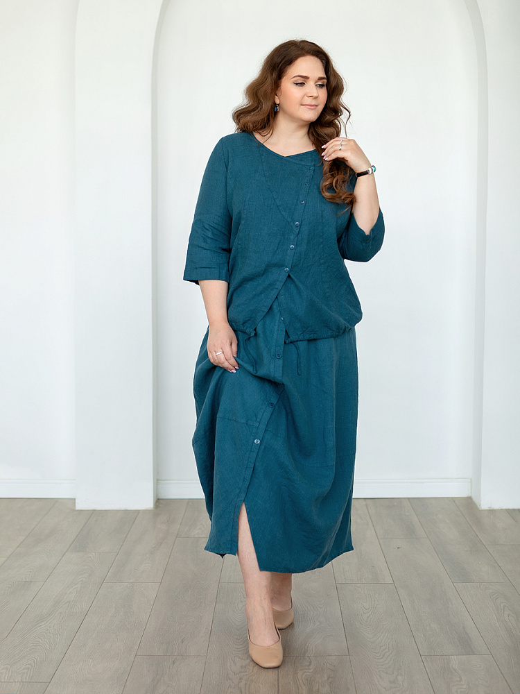 Юбка для женщины – это больше чем предмет гардероба. Это олицетворение самой женственности. Однако, в последние годы в следствии быстрого ритма жизни, женщины всё чаще делают выбор в пользу брюк. Посмотрите на представленную модель юбки! Она заставит вас изменить мнение и вернуться «к истокам». Это модель разработана для женщин весомых достоинств, с учётом их пожеланий. Она сочетает в себе функциональность брюк и женственность юбки. Роскошный силуэт трапеция наделён длиной макси, что придаёт женской фигуре стати и респектабельности. Такие формы хорошо сочетать как с каблуком, так и с обувью на сплошном ходу. Детали кроя создают уже полюбившийся образ стиля Бохо, который подчеркнёт вашу индивидуальность. Вертикальная застёжка на пуговицы на протяжении всей длины – яркий акцентный декоративный элемент. И все это – мастерски подчёркнуто жатой текстурой натурального льна.