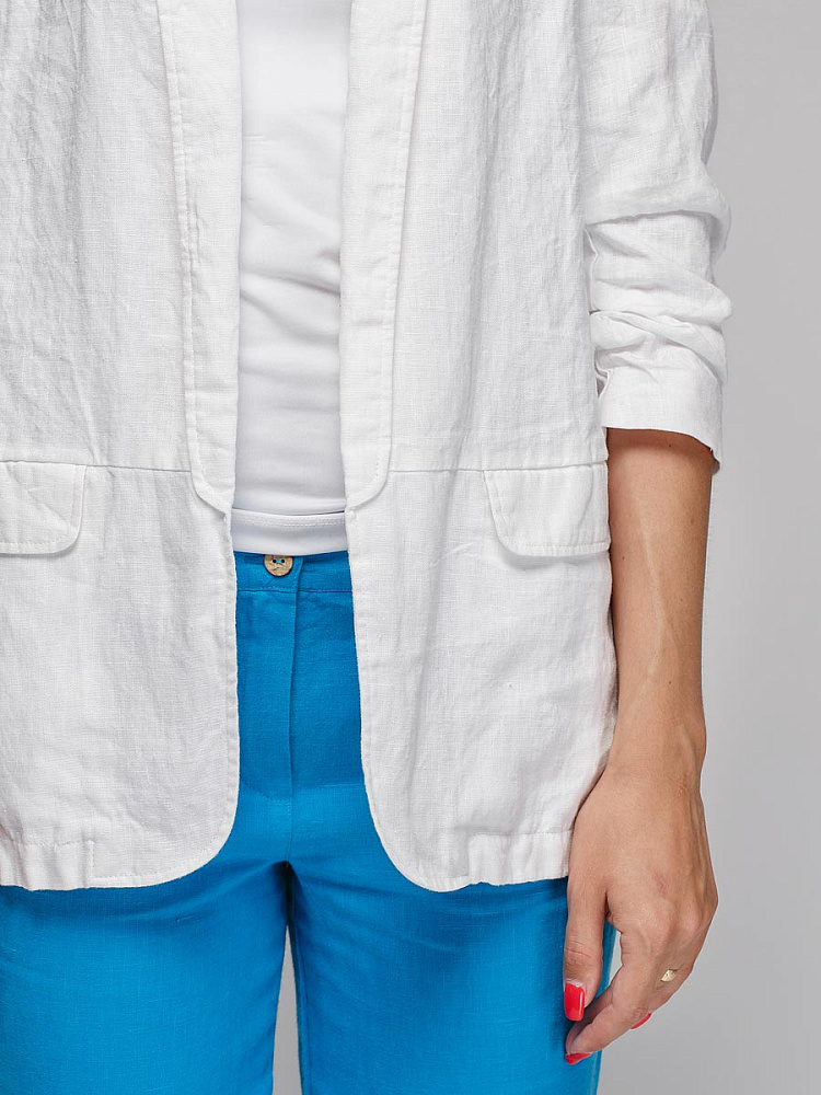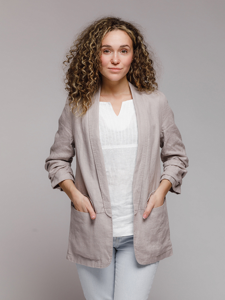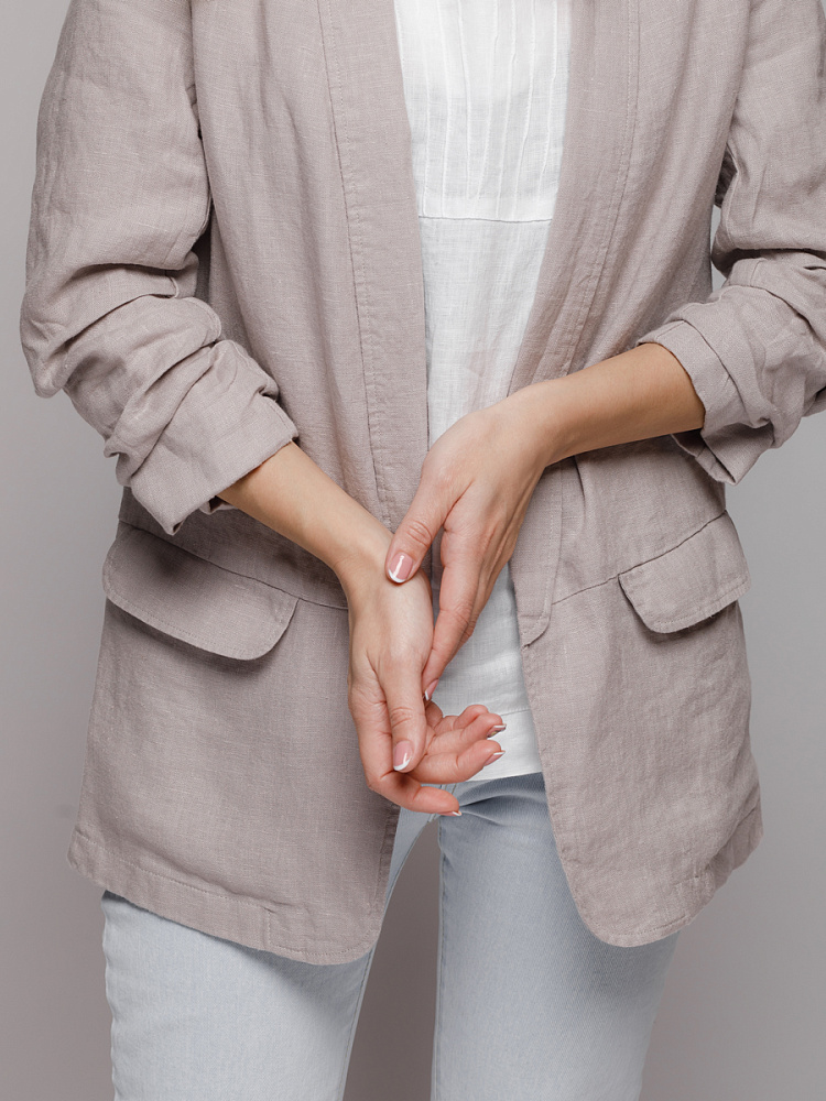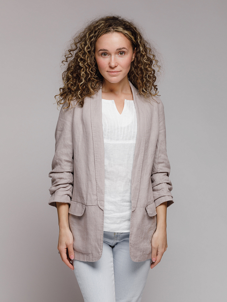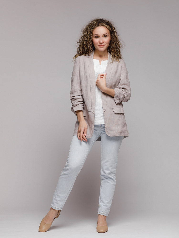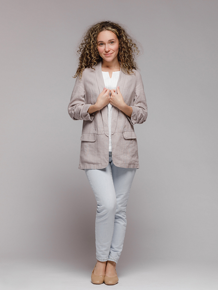 Удивительно прост и элегантен представленный жакет. Прямой покрой дополнен отложным воротником – шаль, который плавными силуэтными линиями переходит в скругленные края борта. По задумке дизайнера – он лишён каких – либо пуговиц, и не стоит волноваться по поводу поддёрнутых рукавов – эта модная драпировка чётко зафиксирована для удобства пользования.
