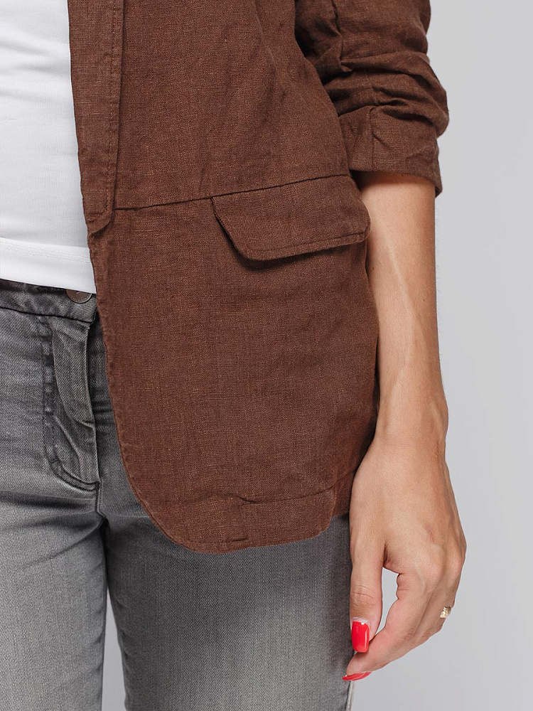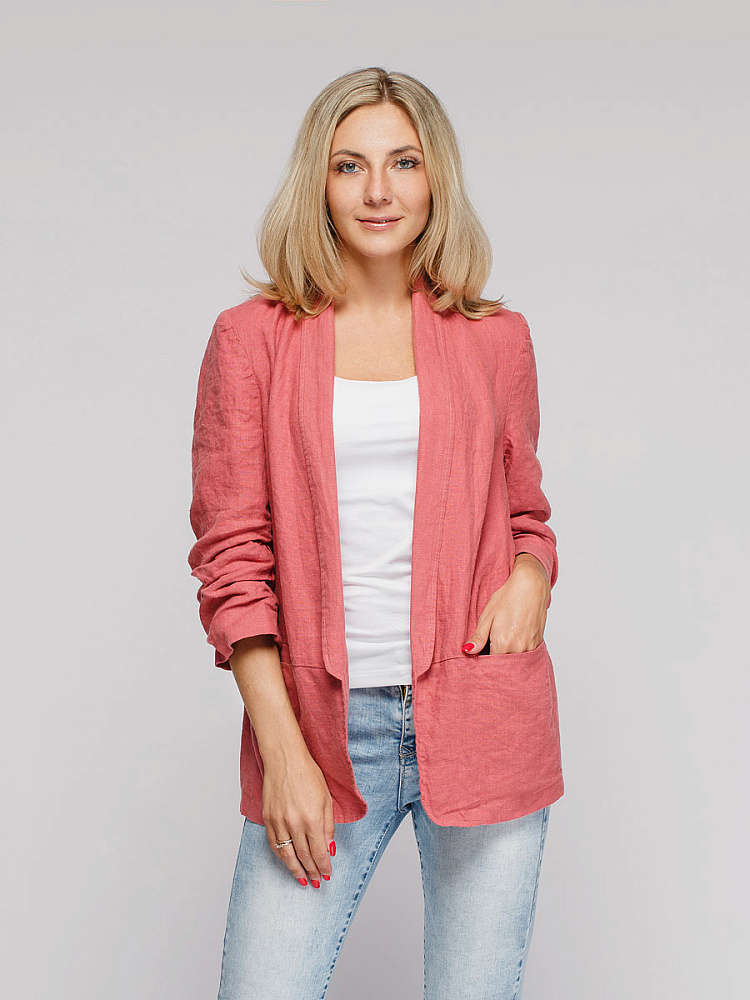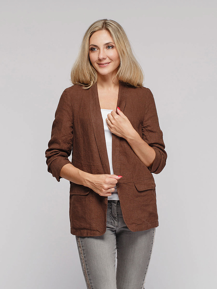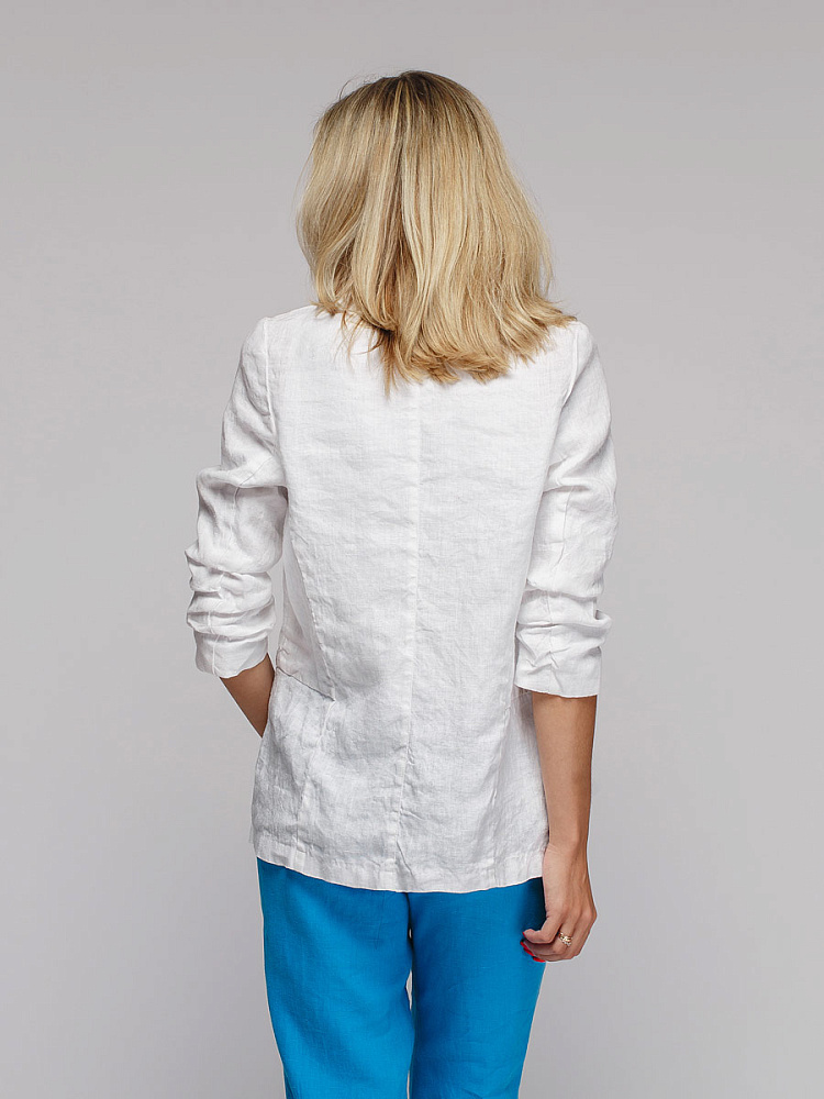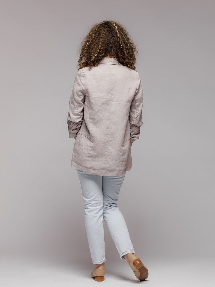 Удивительно прост и элегантен представленный жакет. Прямой покрой дополнен отложным воротником – шаль, который плавными силуэтными линиями переходит в скругленные края борта. По задумке дизайнера – он лишён каких – либо пуговиц, и не стоит волноваться по поводу поддёрнутых рукавов – эта модная драпировка чётко зафиксирована для удобства пользования.