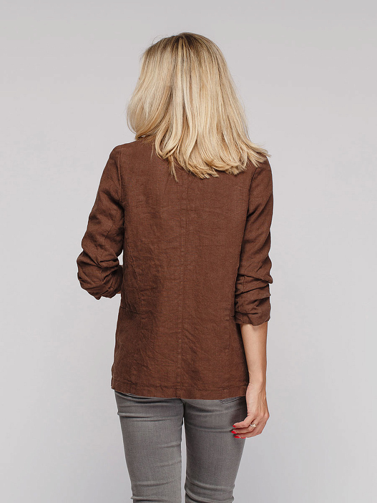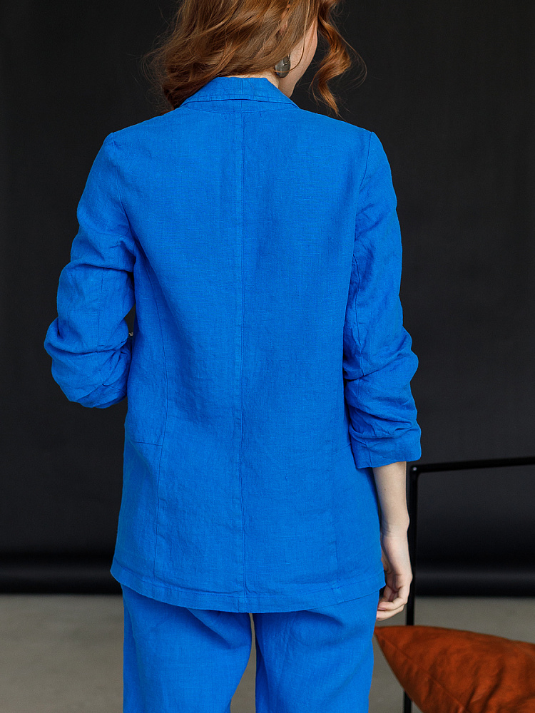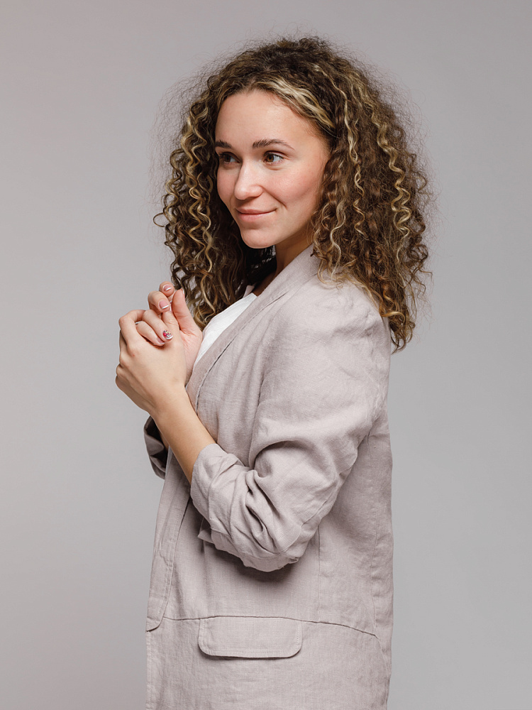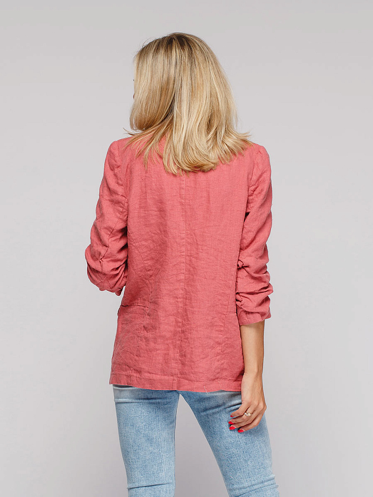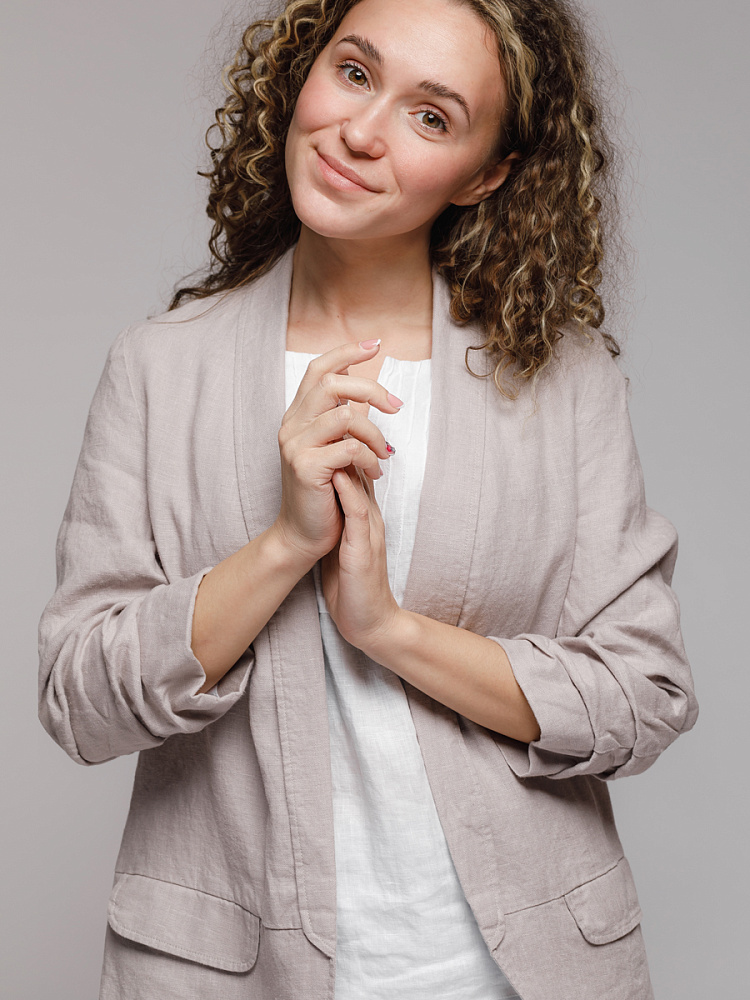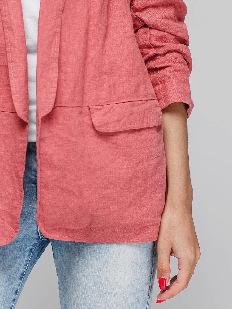 Удивительно прост и элегантен представленный жакет. Прямой покрой дополнен отложным воротником – шаль, который плавными силуэтными линиями переходит в скругленные края борта. По задумке дизайнера – он лишён каких – либо пуговиц, и не стоит волноваться по поводу поддёрнутых рукавов – эта модная драпировка чётко зафиксирована для удобства пользования.