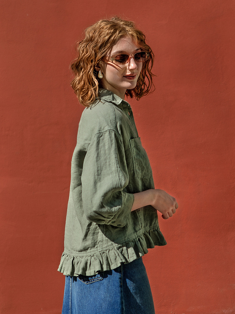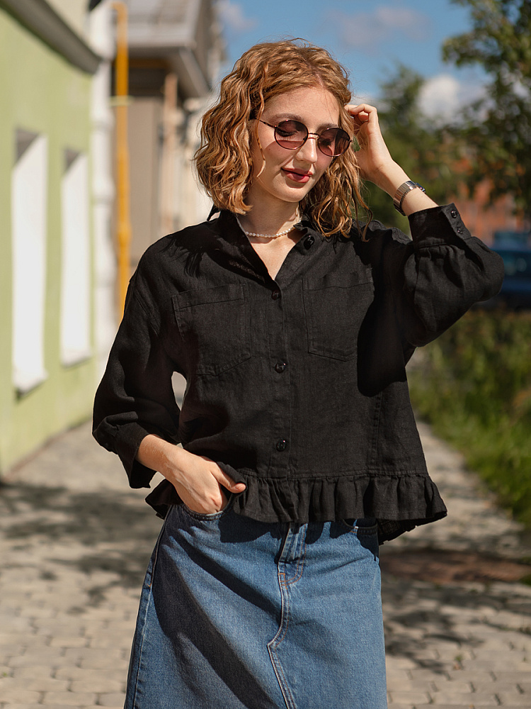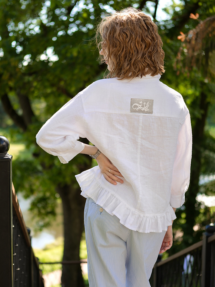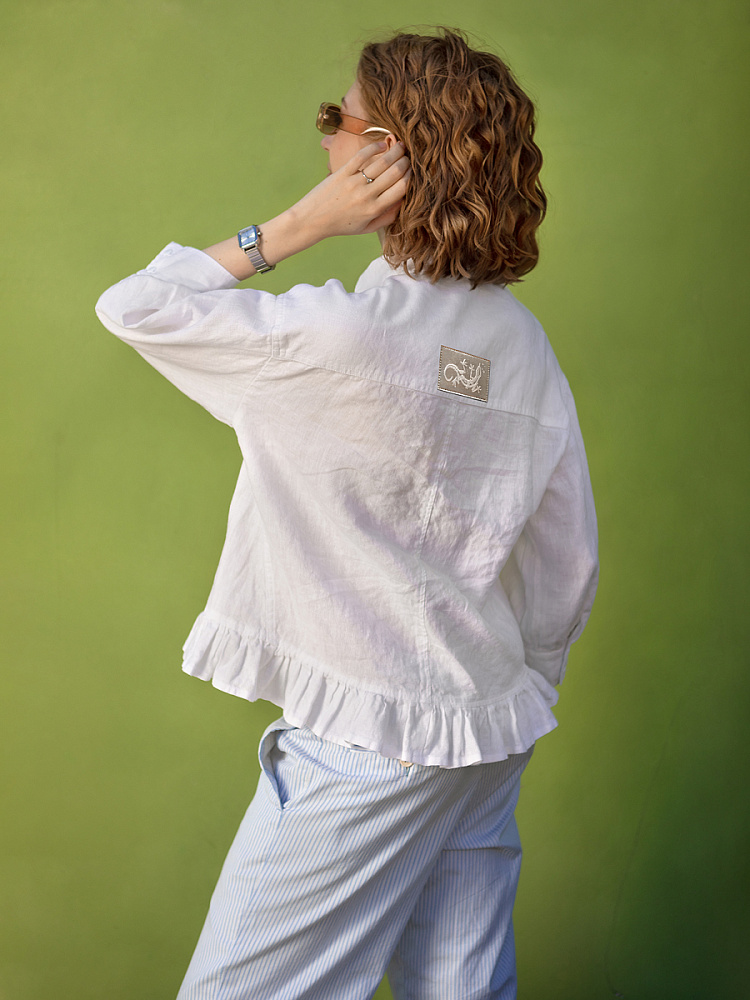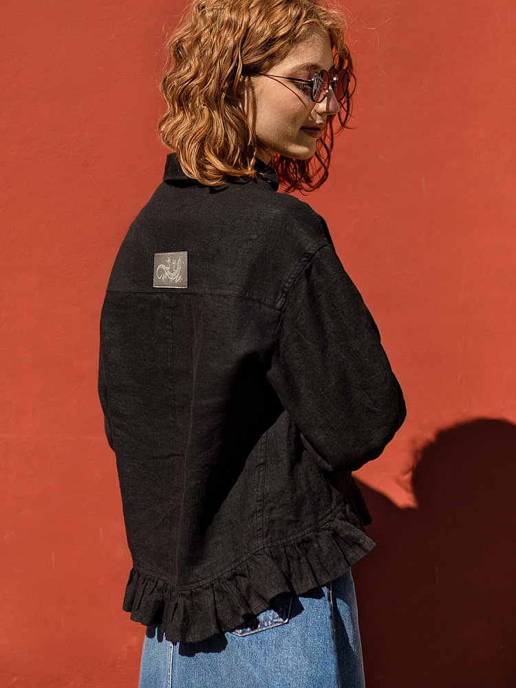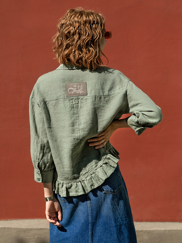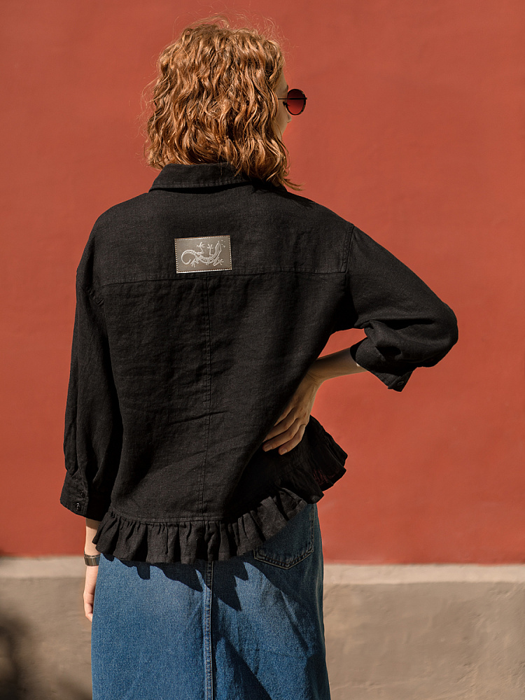 Если вы ищущая натура, любящая эксперименты и различные стилевые сочетания – вам стоит обратить внимание на представленную модель льняного жакета. Даже если вы более демократичны в своём выборе одежды – рекомендуем порадовать себя чем-то новым и необычным. Незаурядный внешний вид жакета из натурального льна приковывает к себе взгляды. На первый взгляд это привычный жакет - рубашка в стиле кэжуал. Прямой силуэт с кокеткой по полочке и спинке, центральной застёжкой – планкой на пуговицы и стояче – отложным воротником – такие привычные элементы для классической рубашка из денима. Однако, сочетание сдержанных накладных карманов с кокетливой оборкой на укороченной длине жакета вызывает интерес и внимание. В классическую конструкцию кроя плечевого шва вписался неординарный рукав. Длина ¾ завершена сборкой на манжету. Не уйдёт от нашего внимания и контрастный патч пришитый на спинке, демонстрирующий витиеватый образ модели.