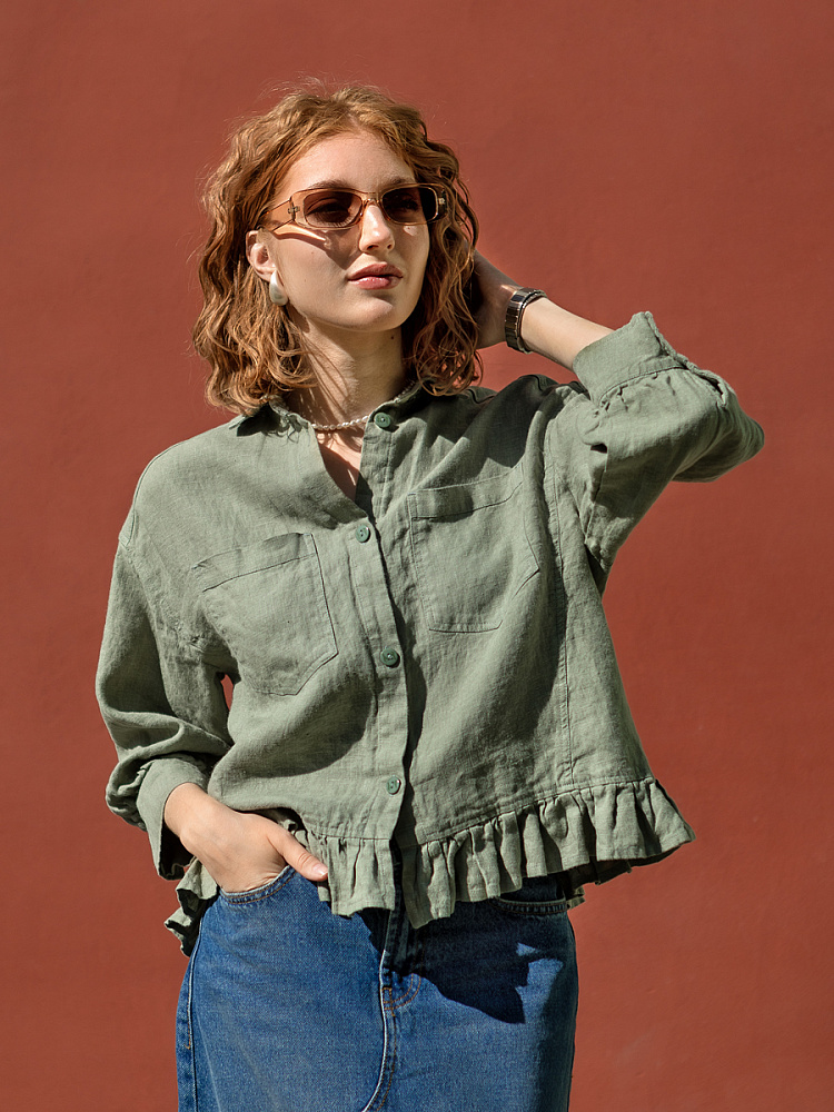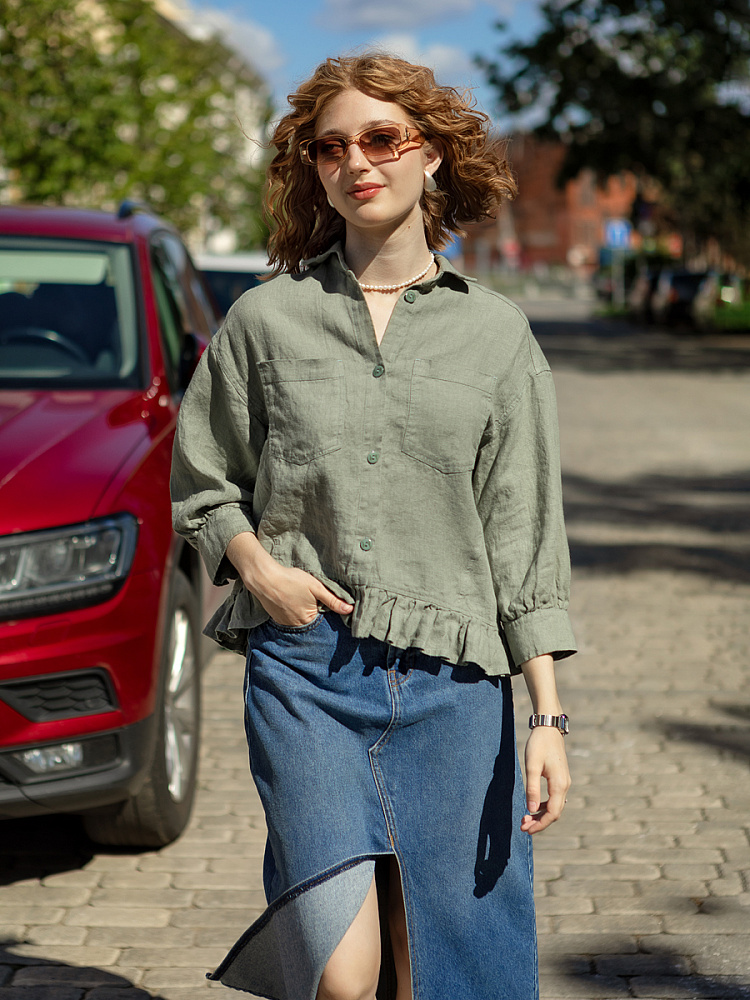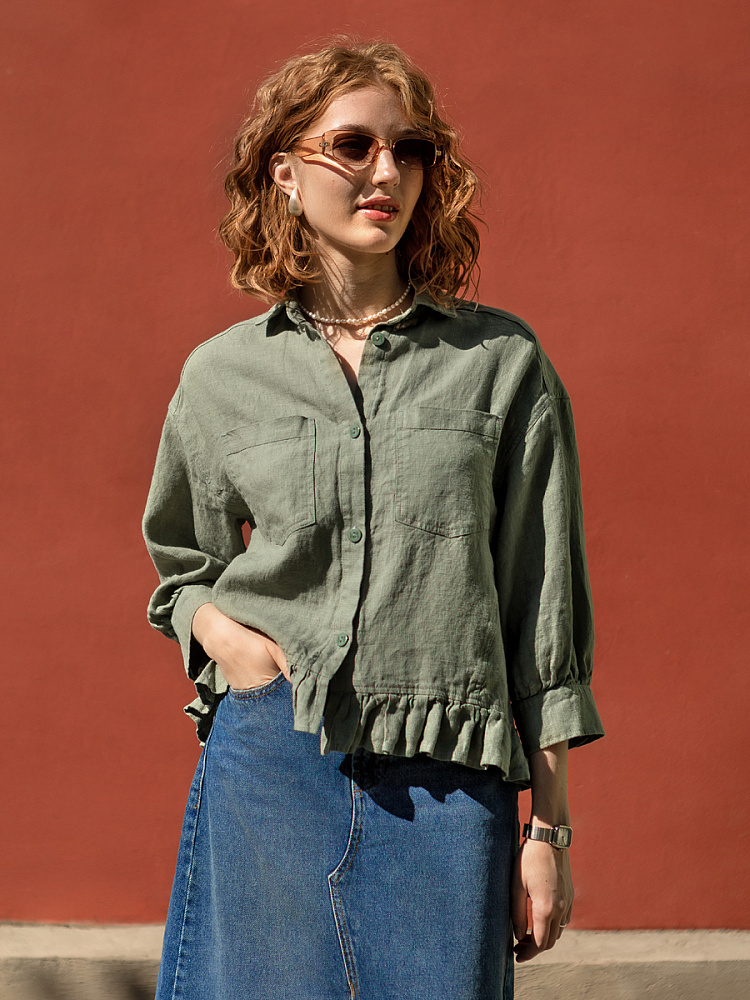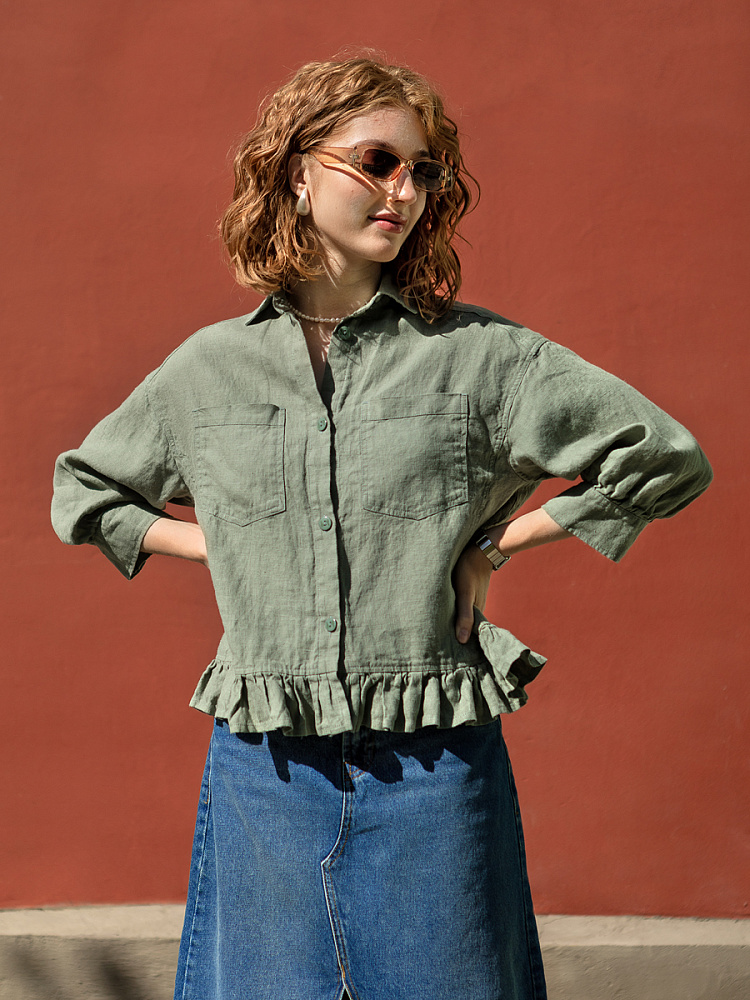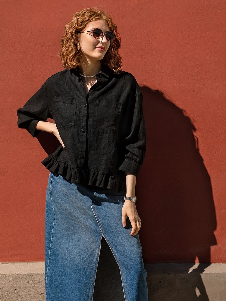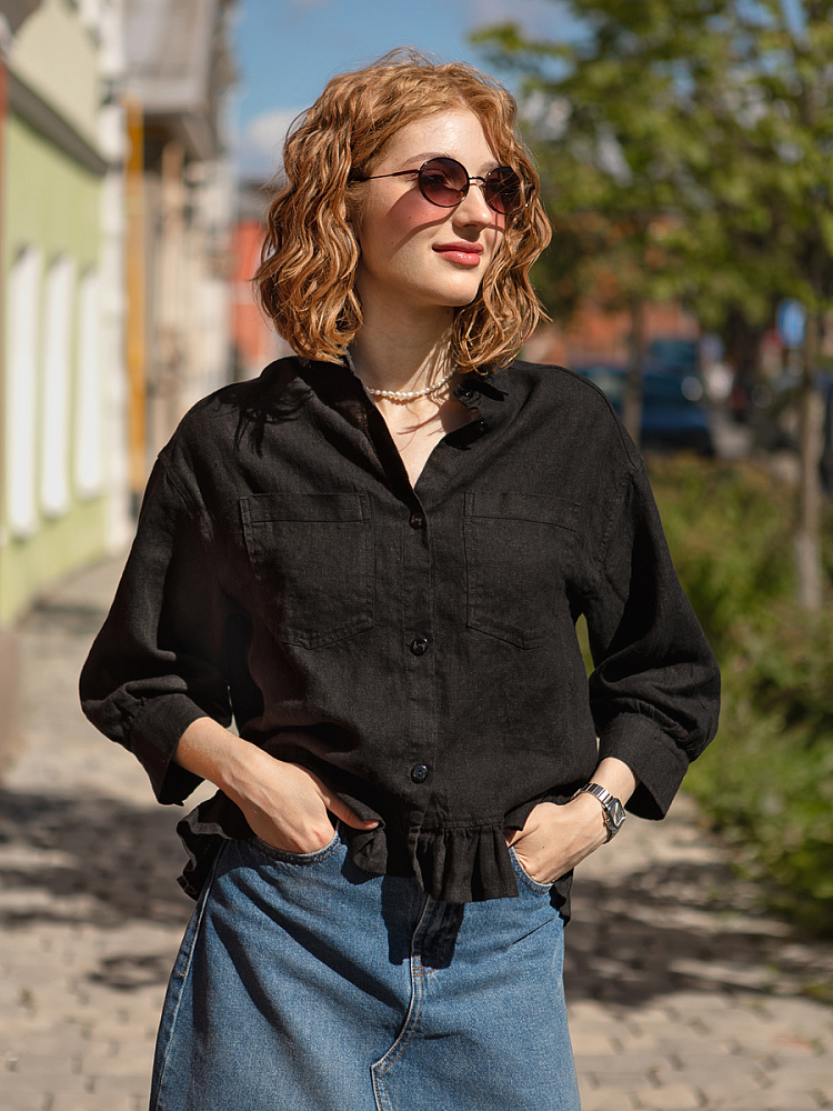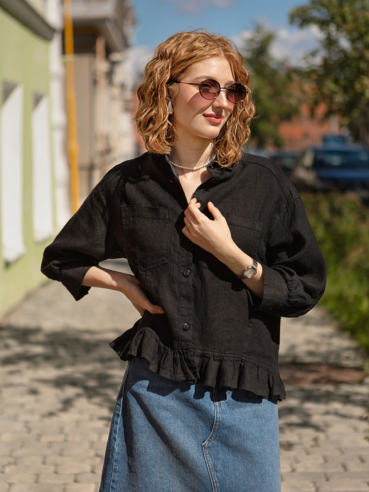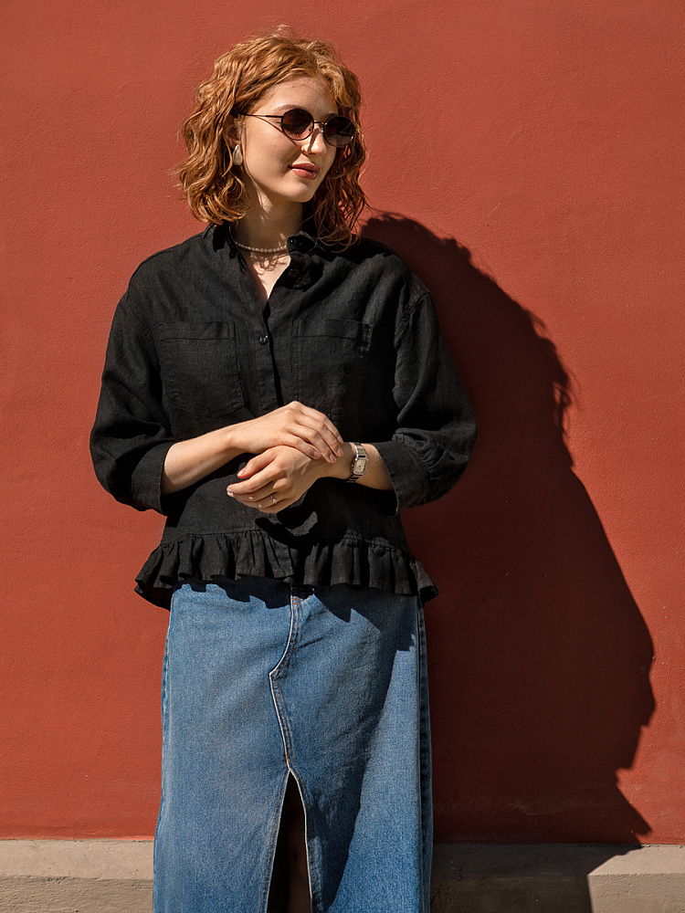Если вы ищущая натура, любящая эксперименты и различные стилевые сочетания – вам стоит обратить внимание на представленную модель льняного жакета. Даже если вы более демократичны в своём выборе одежды – рекомендуем порадовать себя чем-то новым и необычным. Незаурядный внешний вид жакета из натурального льна приковывает к себе взгляды. На первый взгляд это привычный жакет - рубашка в стиле кэжуал. Прямой силуэт с кокеткой по полочке и спинке, центральной застёжкой – планкой на пуговицы и стояче – отложным воротником – такие привычные элементы для классической рубашка из денима. Однако, сочетание сдержанных накладных карманов с кокетливой оборкой на укороченной длине жакета вызывает интерес и внимание. В классическую конструкцию кроя плечевого шва вписался неординарный рукав. Длина ¾ завершена сборкой на манжету. Не уйдёт от нашего внимания и контрастный патч пришитый на спинке, демонстрирующий витиеватый образ модели.