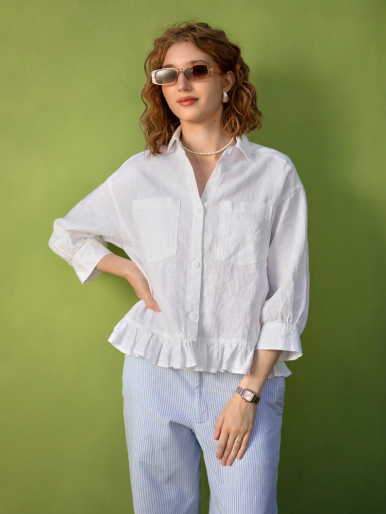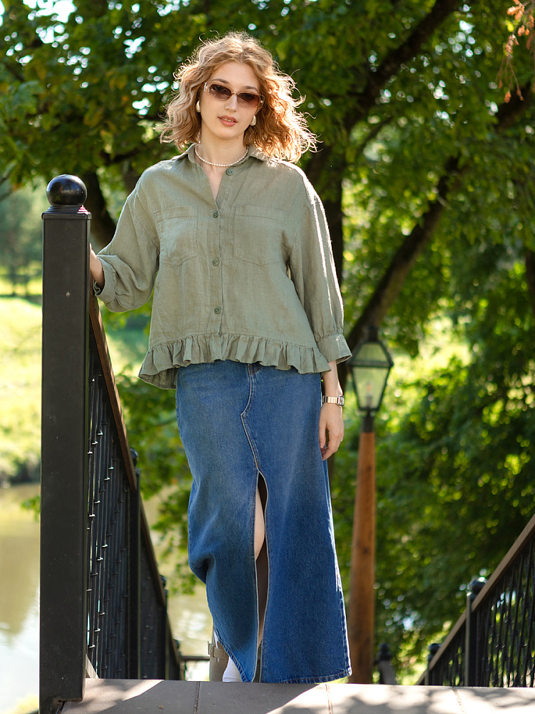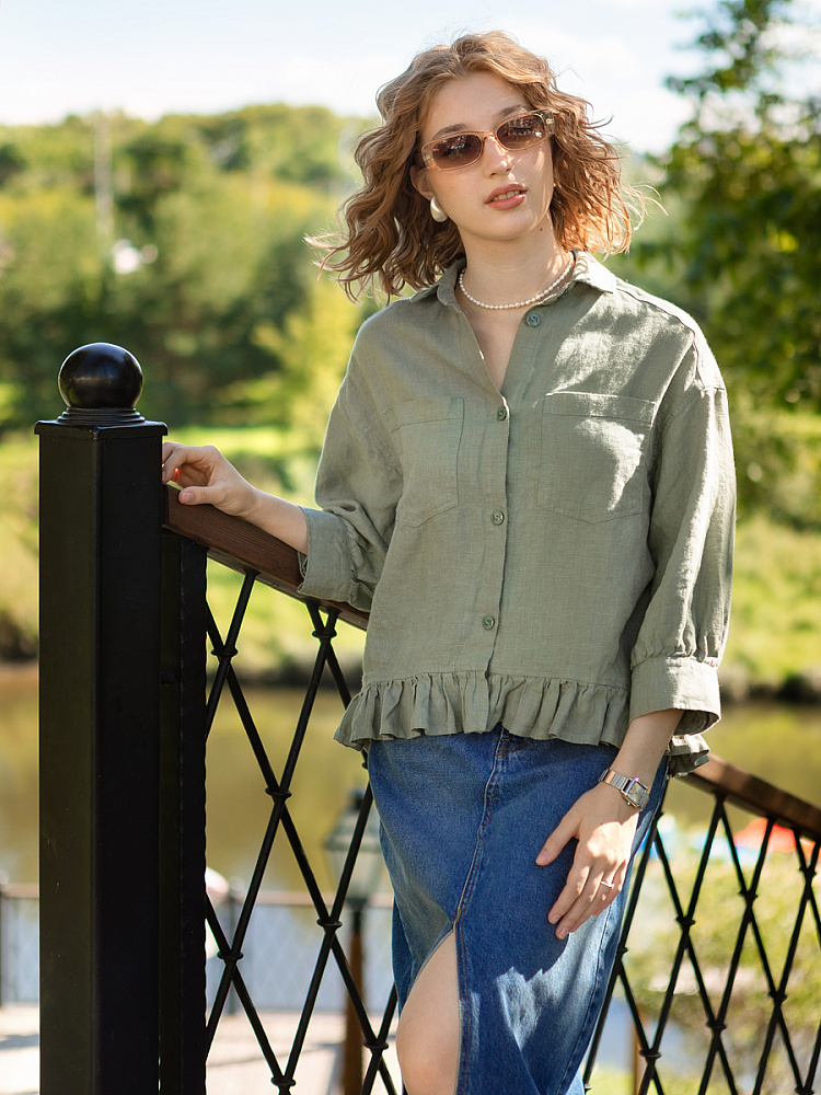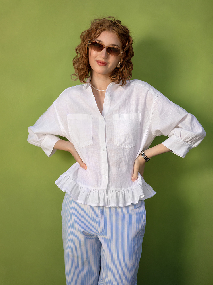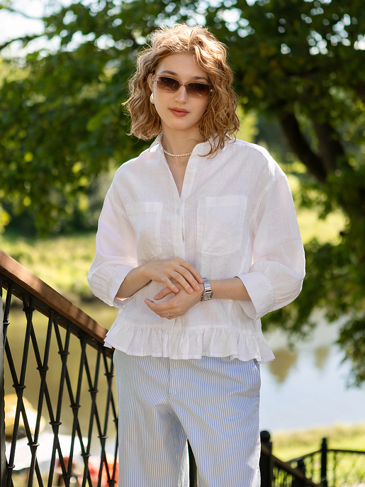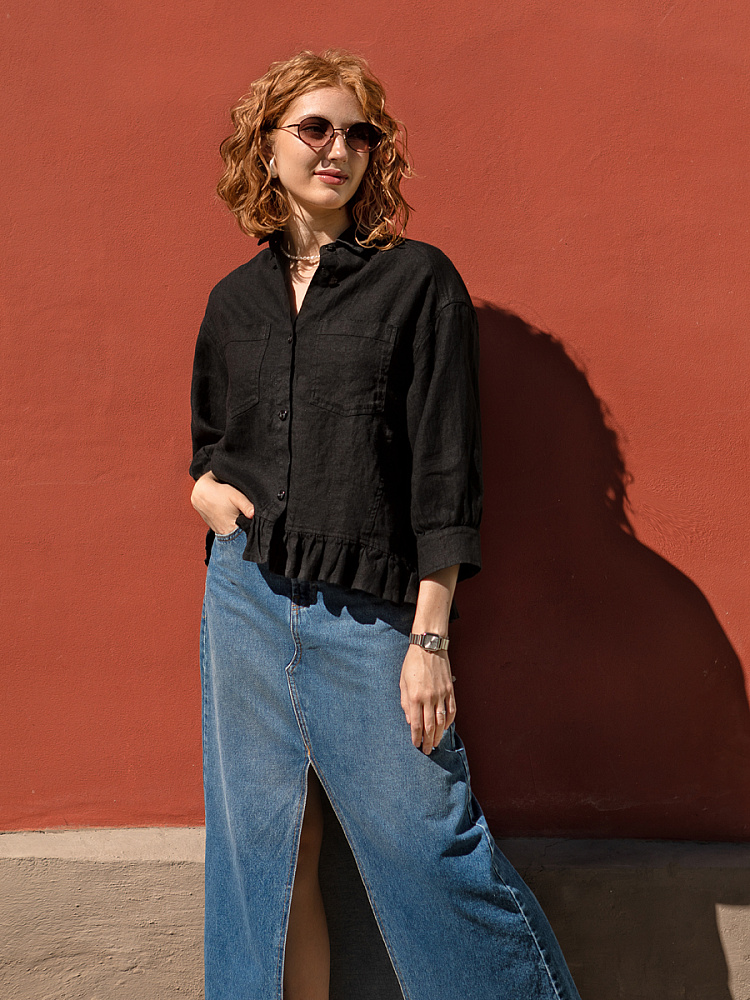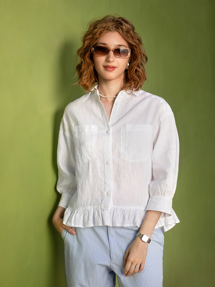Если вы ищущая натура, любящая эксперименты и различные стилевые сочетания – вам стоит обратить внимание на представленную модель льняного жакета. Даже если вы более демократичны в своём выборе одежды – рекомендуем порадовать себя чем-то новым и необычным. Незаурядный внешний вид жакета из натурального льна приковывает к себе взгляды. На первый взгляд это привычный жакет - рубашка в стиле кэжуал. Прямой силуэт с кокеткой по полочке и спинке, центральной застёжкой – планкой на пуговицы и стояче – отложным воротником – такие привычные элементы для классической рубашка из денима. Однако, сочетание сдержанных накладных карманов с кокетливой оборкой на укороченной длине жакета вызывает интерес и внимание. В классическую конструкцию кроя плечевого шва вписался неординарный рукав. Длина ¾ завершена сборкой на манжету. Не уйдёт от нашего внимания и контрастный патч пришитый на спинке, демонстрирующий витиеватый образ модели.