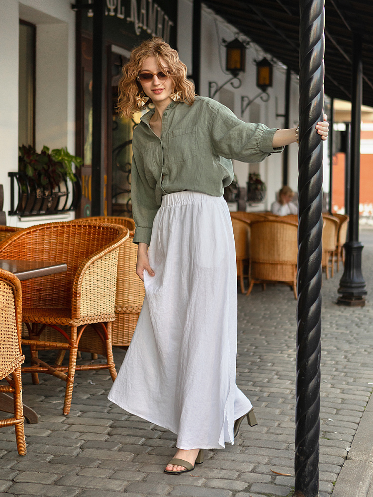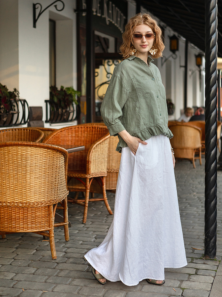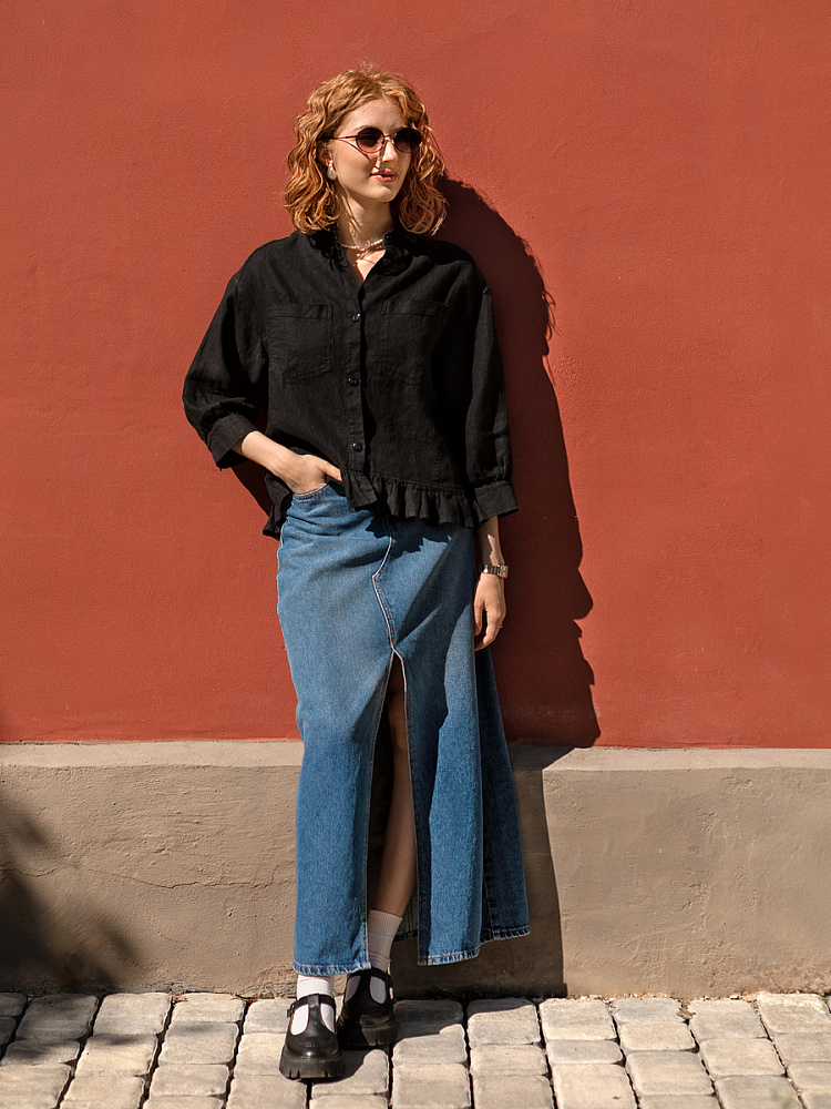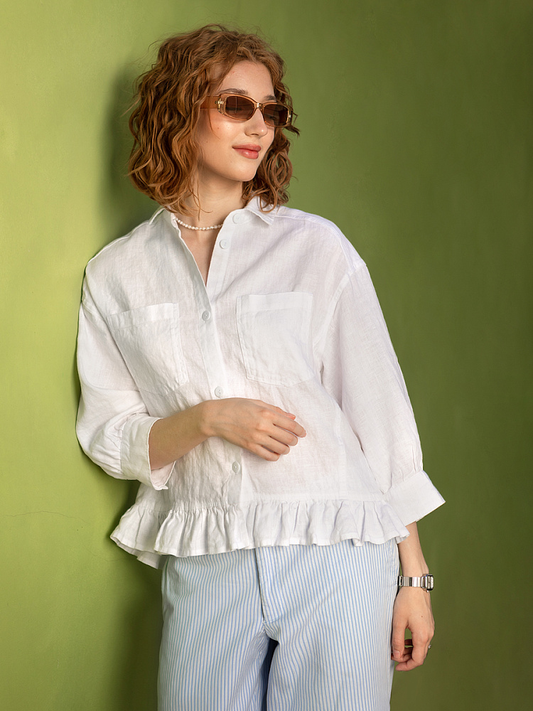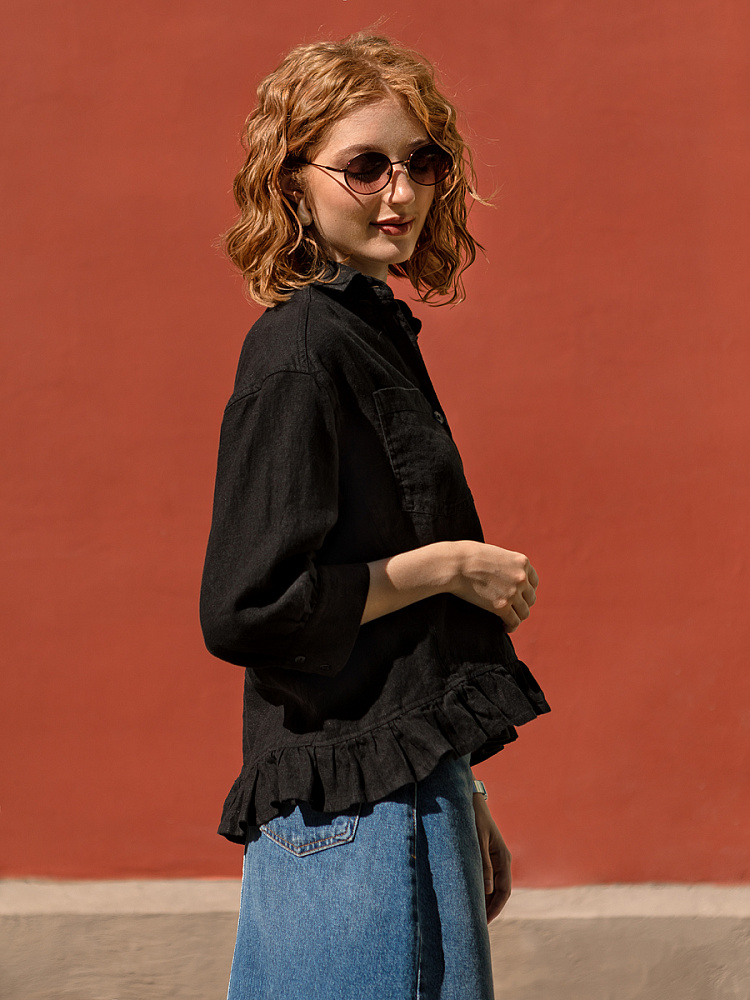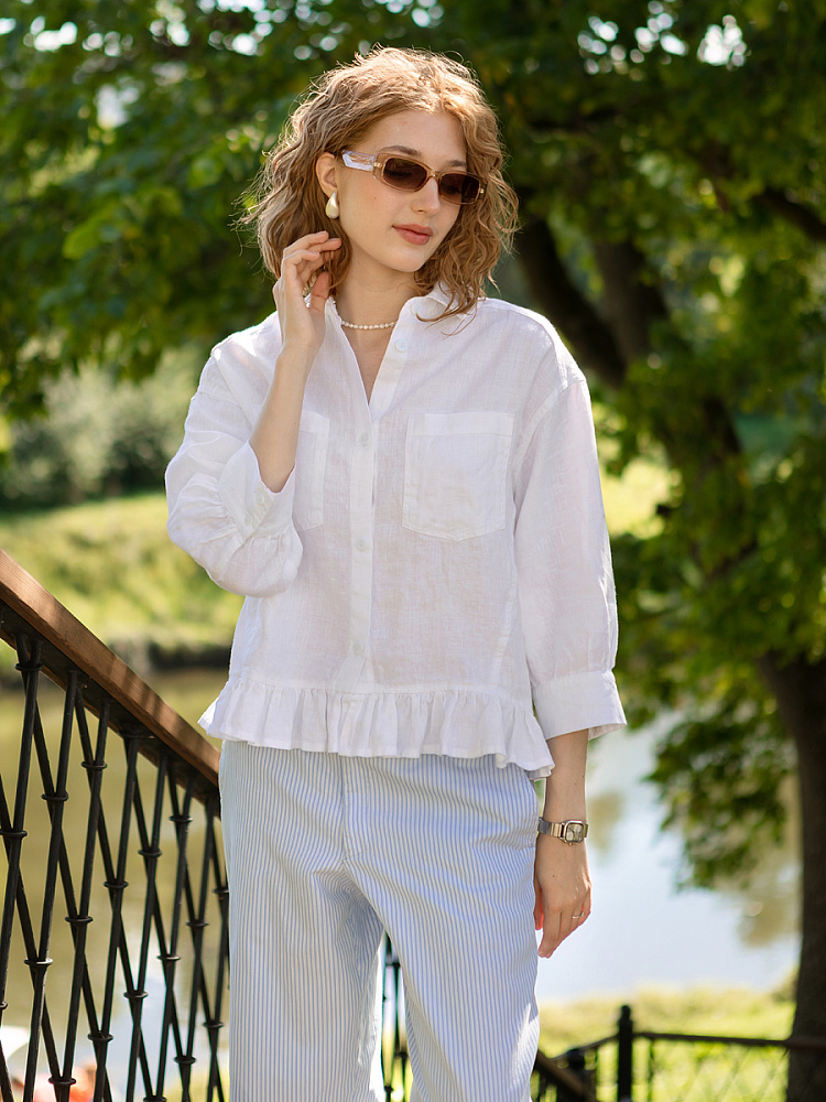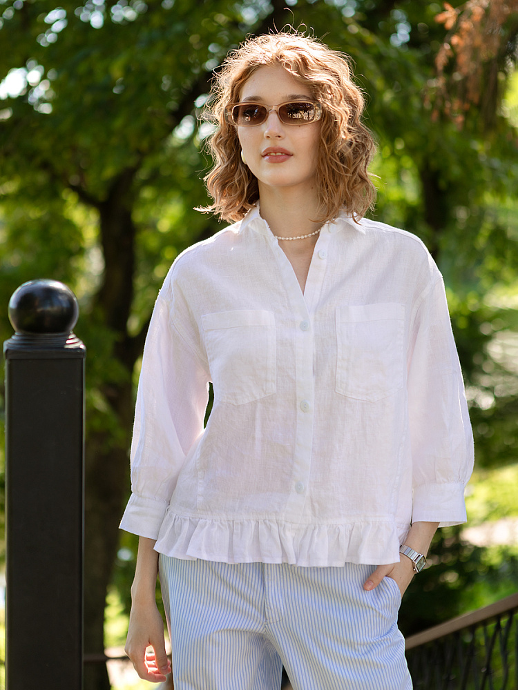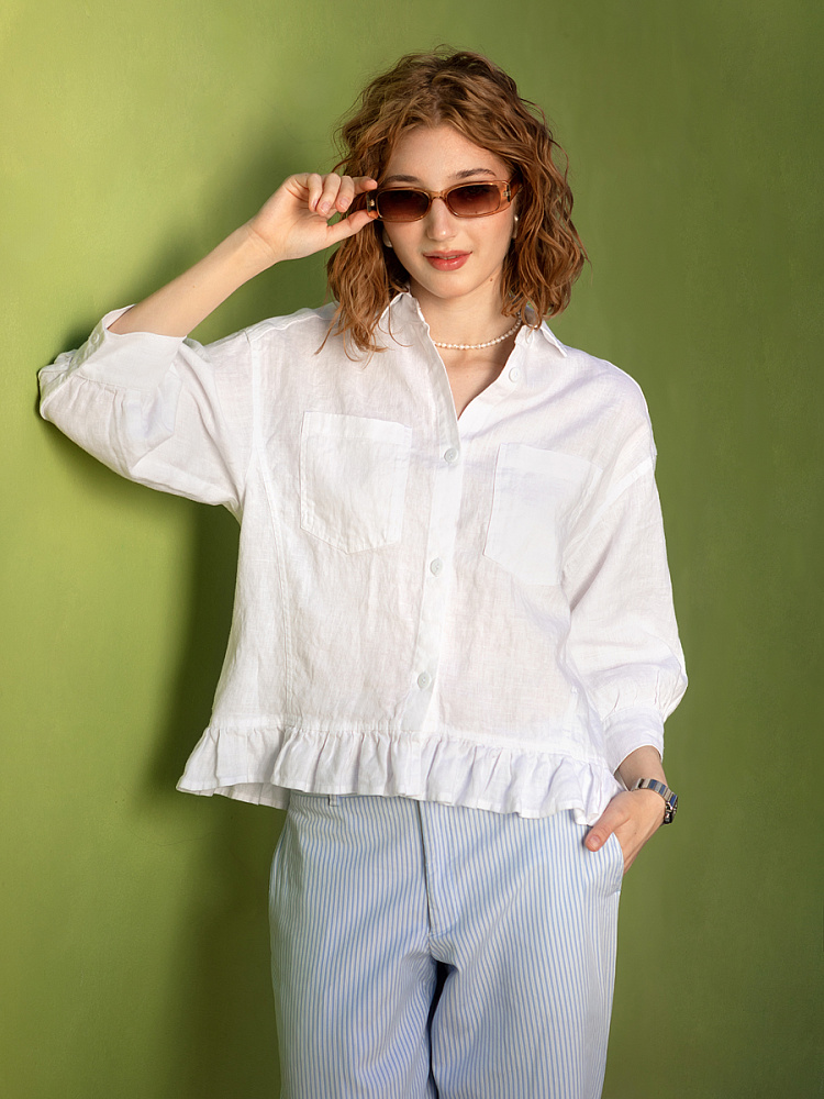 Если вы ищущая натура, любящая эксперименты и различные стилевые сочетания – вам стоит обратить внимание на представленную модель льняного жакета. Даже если вы более демократичны в своём выборе одежды – рекомендуем порадовать себя чем-то новым и необычным. Незаурядный внешний вид жакета из натурального льна приковывает к себе взгляды. На первый взгляд это привычный жакет - рубашка в стиле кэжуал. Прямой силуэт с кокеткой по полочке и спинке, центральной застёжкой – планкой на пуговицы и стояче – отложным воротником – такие привычные элементы для классической рубашка из денима. Однако, сочетание сдержанных накладных карманов с кокетливой оборкой на укороченной длине жакета вызывает интерес и внимание. В классическую конструкцию кроя плечевого шва вписался неординарный рукав. Длина ¾ завершена сборкой на манжету. Не уйдёт от нашего внимания и контрастный патч пришитый на спинке, демонстрирующий витиеватый образ модели.