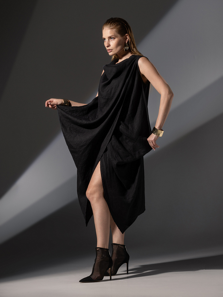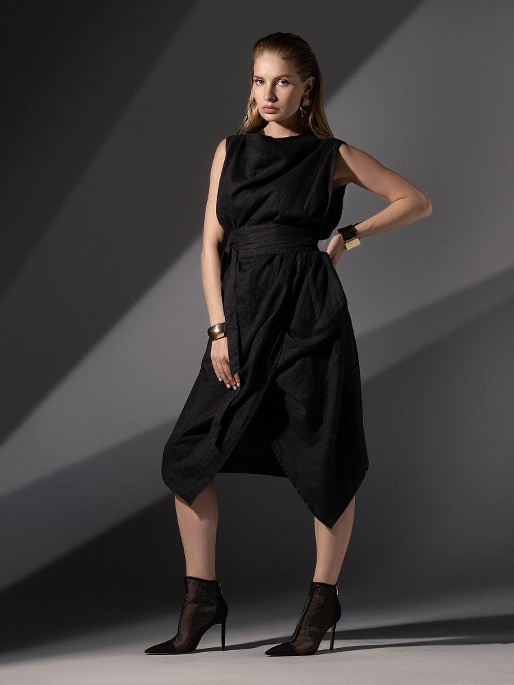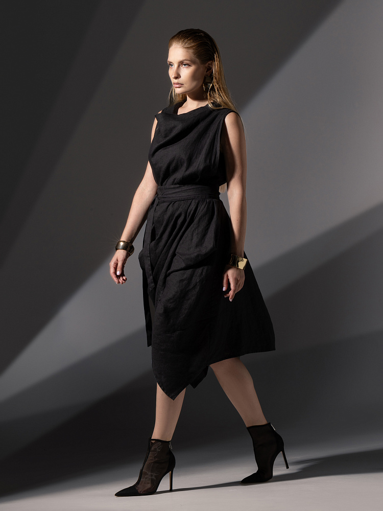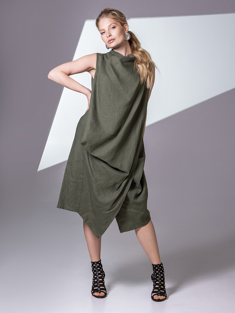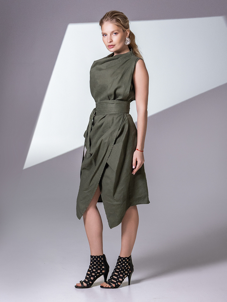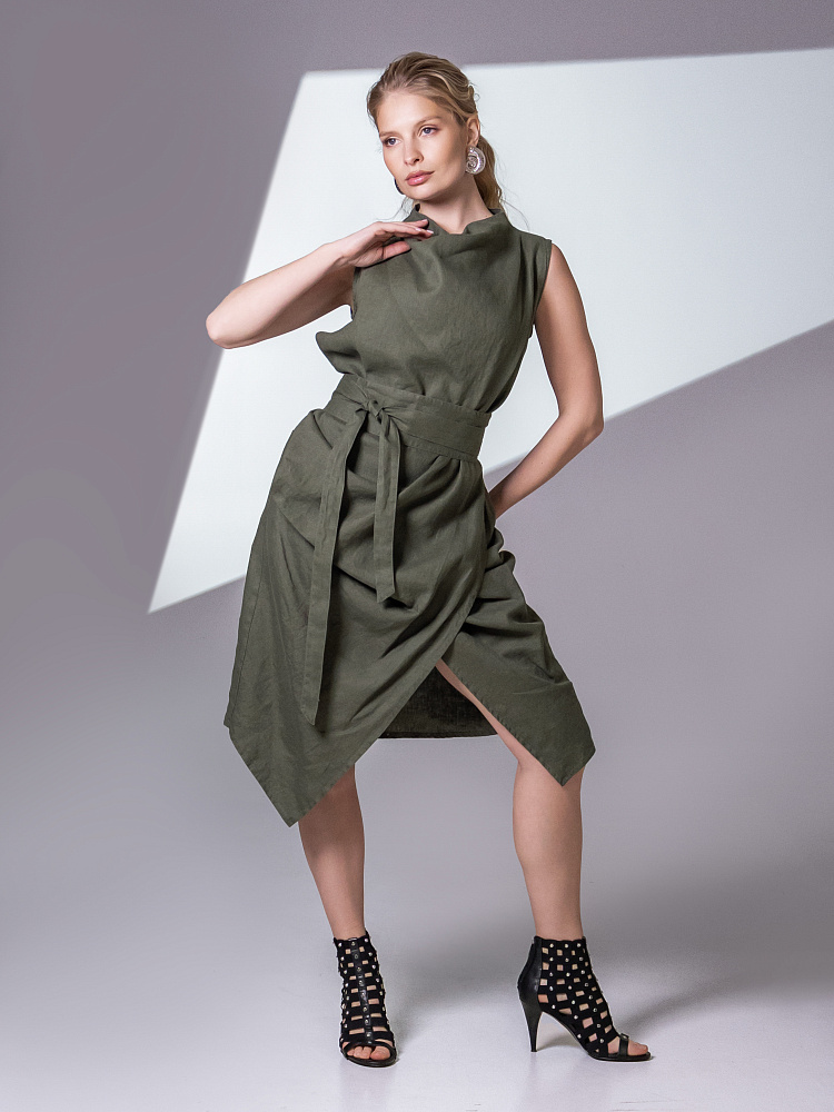 Одно платье, но множество образов. Это ли не женское счастье!? Чарующий многослойный силуэт представленной модели способен на многое. Многочисленные складки натурального льна создают игру света и тени, вычерчивают нетривиальные женские формы. Прямой силуэт платья создан по средствам двух деталей передних половинок, которые нахлестнули одну на другую. Подобный конструктивный приём избавил модель от надоедливых и статичных застёжек. Не плотное смыкание деталей образует интригующий ассиметричный разрез, позволяющий продемонстрировать красоту женских ножек. Геометрия нижнего среза вытягивает силуэт по вертикали, создавая стройные женские черты. Глубокие складки воротника – хомут подчиняются общему замыслу модели, плавно окутывая область шеи. Подчеркнуть талию и поэкспериментировать с формами можно при помощи съёмного пояса, который способен внести кардинальные изменения в ваш образ. Модель платья лишена какого – либо декора, все дизайнерские акценты смещены в сторону силуэта.