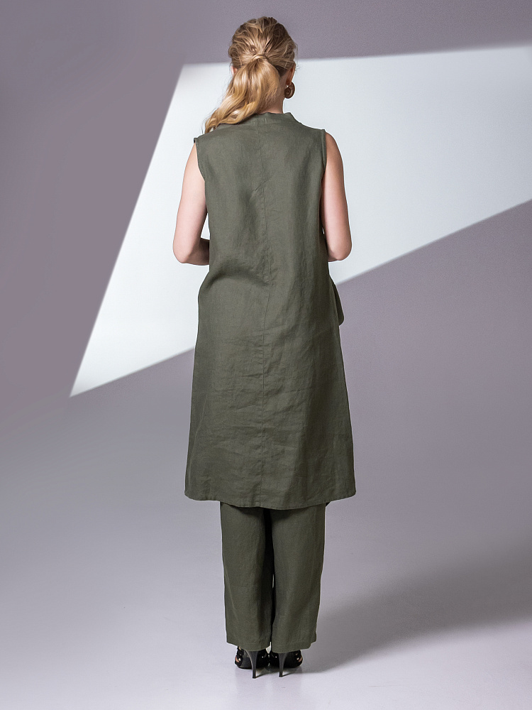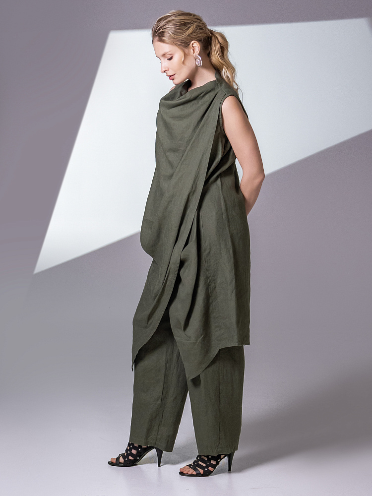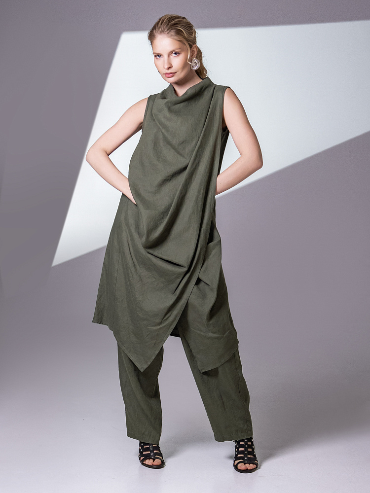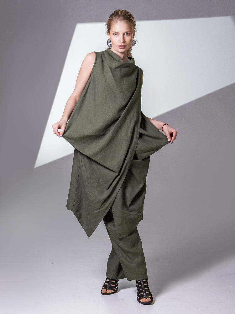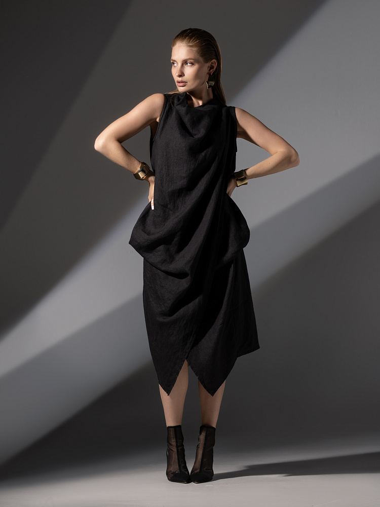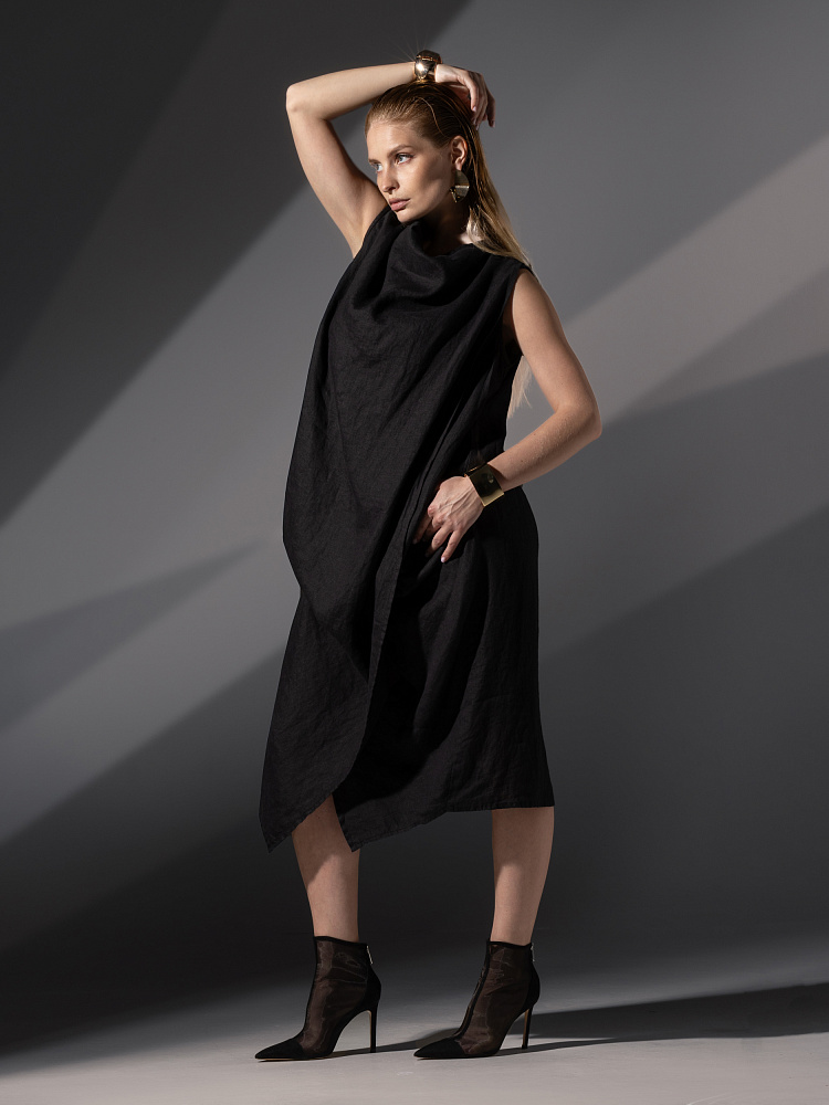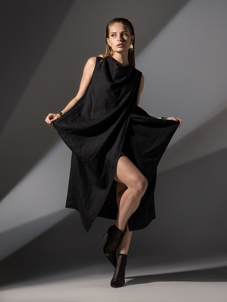 Одно платье, но множество образов. Это ли не женское счастье!? Чарующий многослойный силуэт представленной модели способен на многое. Многочисленные складки натурального льна создают игру света и тени, вычерчивают нетривиальные женские формы. Прямой силуэт платья создан по средствам двух деталей передних половинок, которые нахлестнули одну на другую. Подобный конструктивный приём избавил модель от надоедливых и статичных застёжек. Не плотное смыкание деталей образует интригующий ассиметричный разрез, позволяющий продемонстрировать красоту женских ножек. Геометрия нижнего среза вытягивает силуэт по вертикали, создавая стройные женские черты. Глубокие складки воротника – хомут подчиняются общему замыслу модели, плавно окутывая область шеи. Подчеркнуть талию и поэкспериментировать с формами можно при помощи съёмного пояса, который способен внести кардинальные изменения в ваш образ. Модель платья лишена какого – либо декора, все дизайнерские акценты смещены в сторону силуэта.