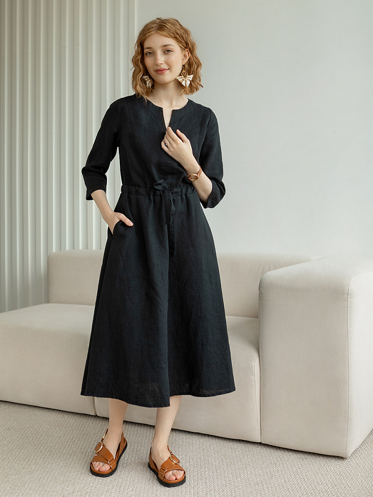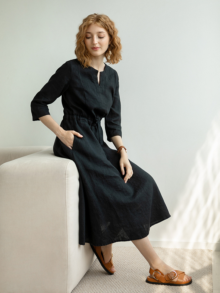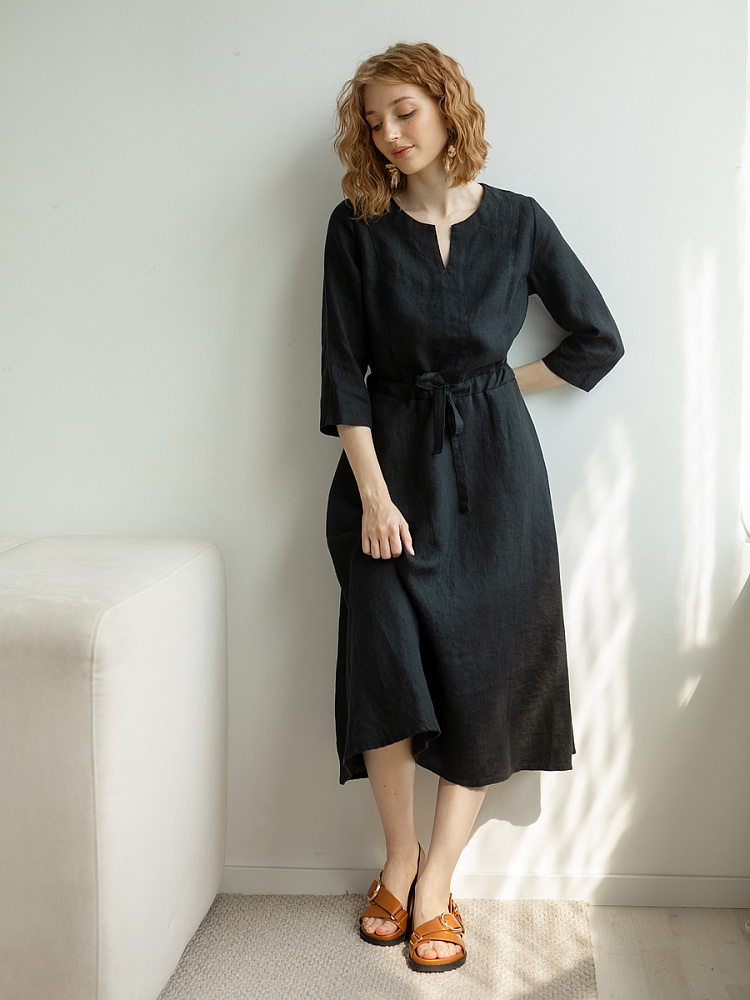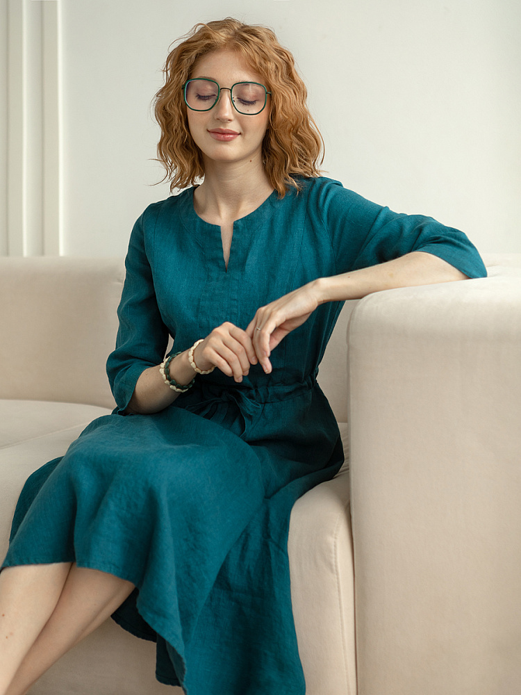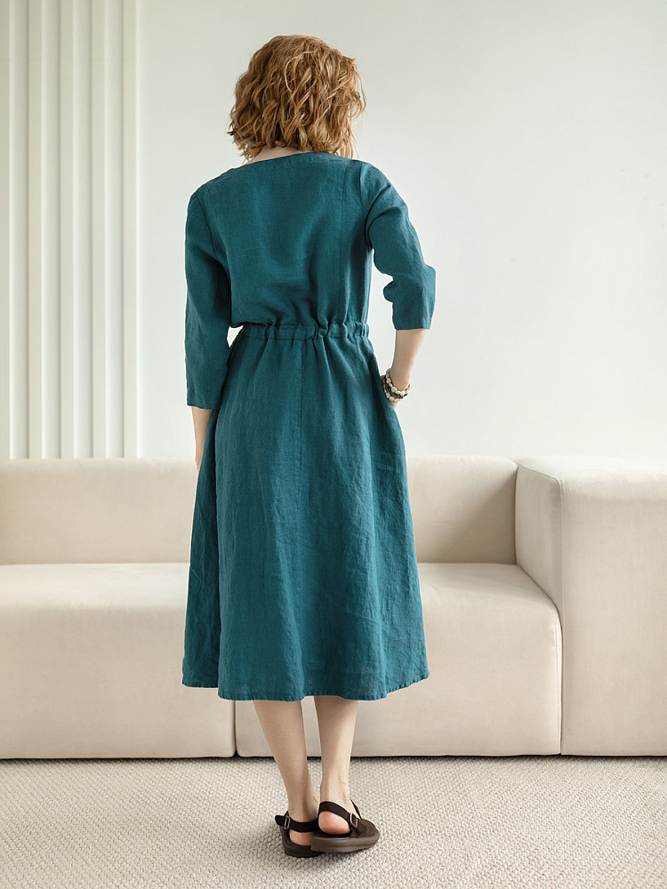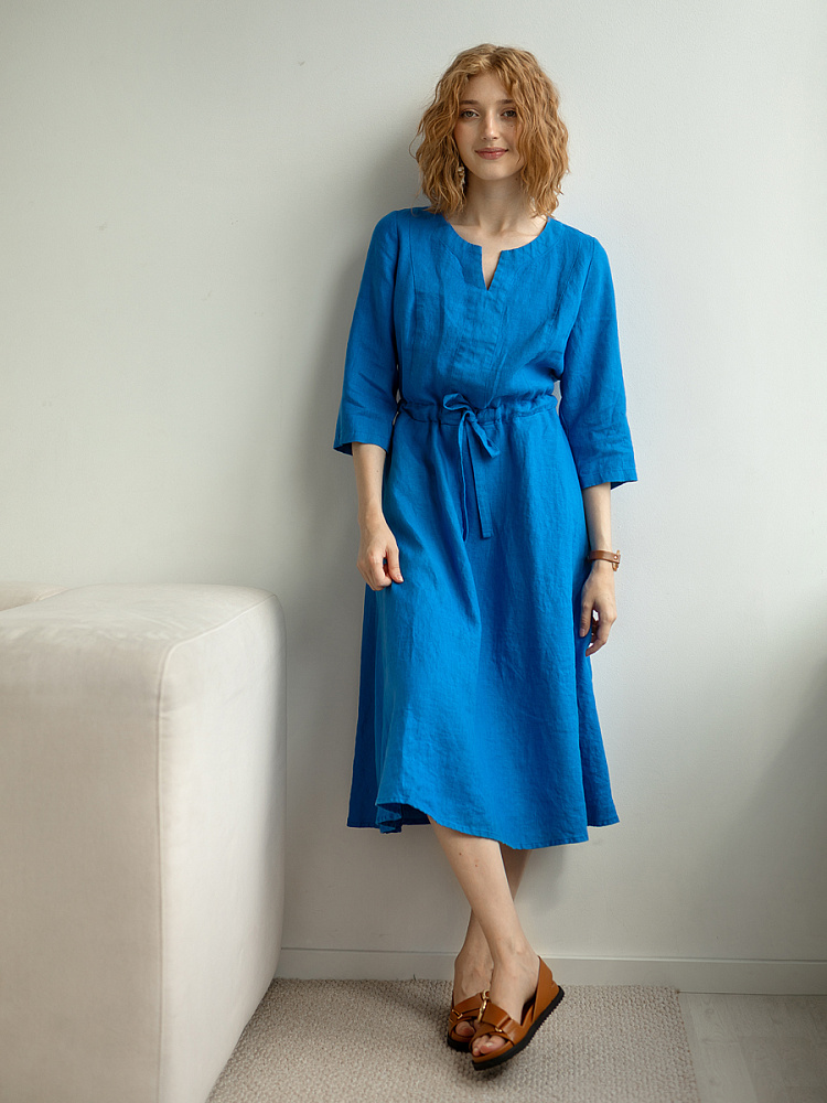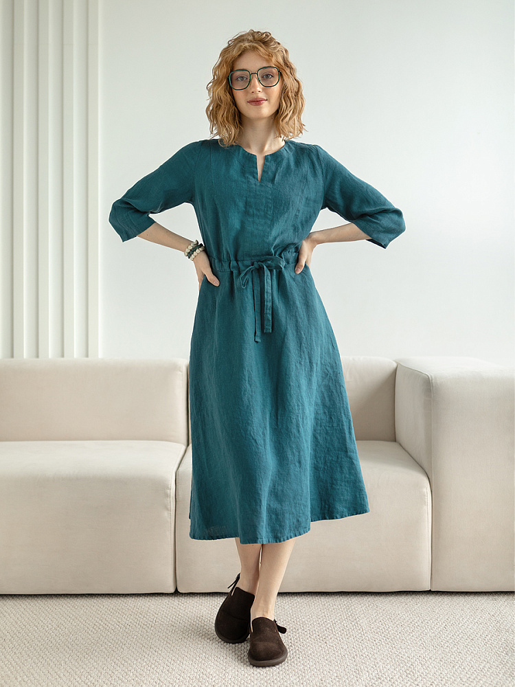 Руководствуясь принципом – к хорошему быстро привыкаешь, в последние несколько лет прослеживается запрос покупателей на качественные изделия, выполненные из натуральных материалов, обладающие хорошей посадкой на фигуре. Подобные изделия всегда в тренде, их комфортно носить, от них не наступает моральная усталость и к тому же, не стыдно демонстрировать окружающим. Представленная модель платья из льна способно удовлетворить все эти запросы. Силуэт песочные часы в сочетании с длиной миди великолепны на представительницах самого разнообразного роста и весомых достоинств. Акцентная кулиса на талии хорошо её подчёркивает, разделяя силуэт на верхнюю и нижнюю часть. Юбка не выказывает декоративного изобилия. Лёгкая расклешённость дополнена карманами в боковых швах. Лиф модели более разнообразен конструкторскими решениями. Рельефные швы на полочке и спинке выстраивают вертикали, которые поддержаны декоративной планкой по борту. Круглый вырез горловины дополняет V - образный вырез, что придаёт женским чертам утончённый силуэт.