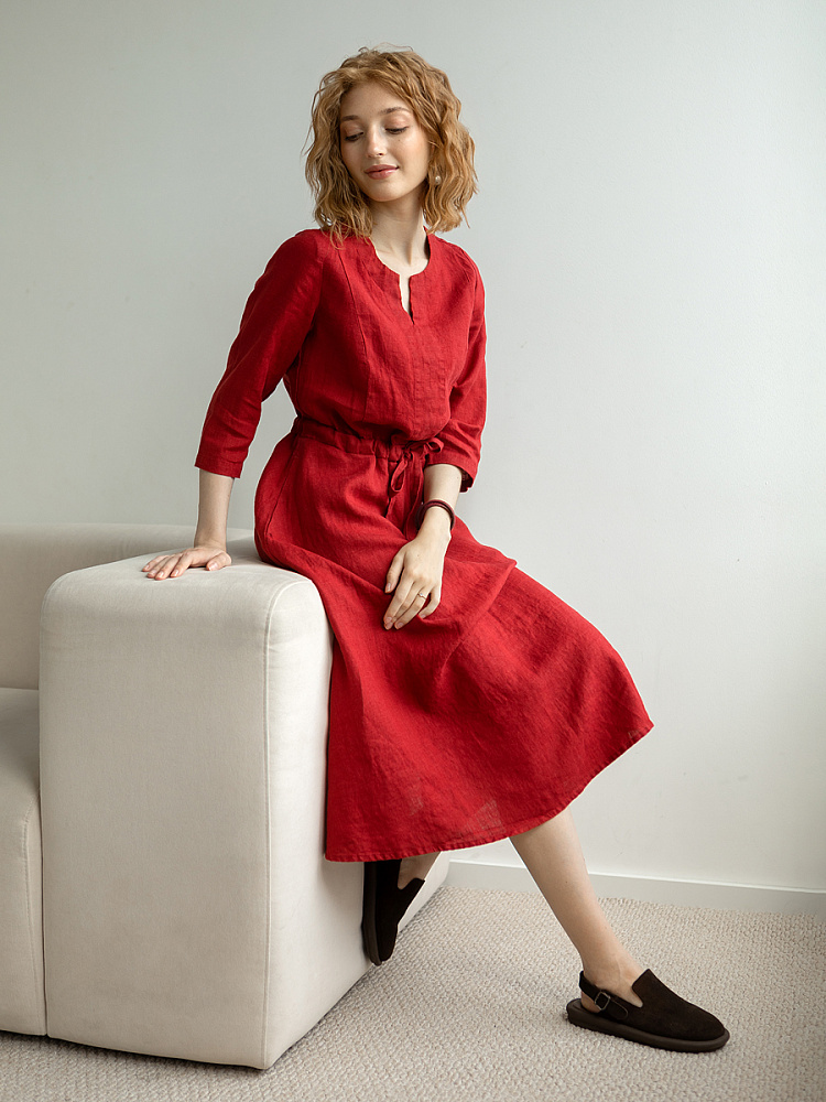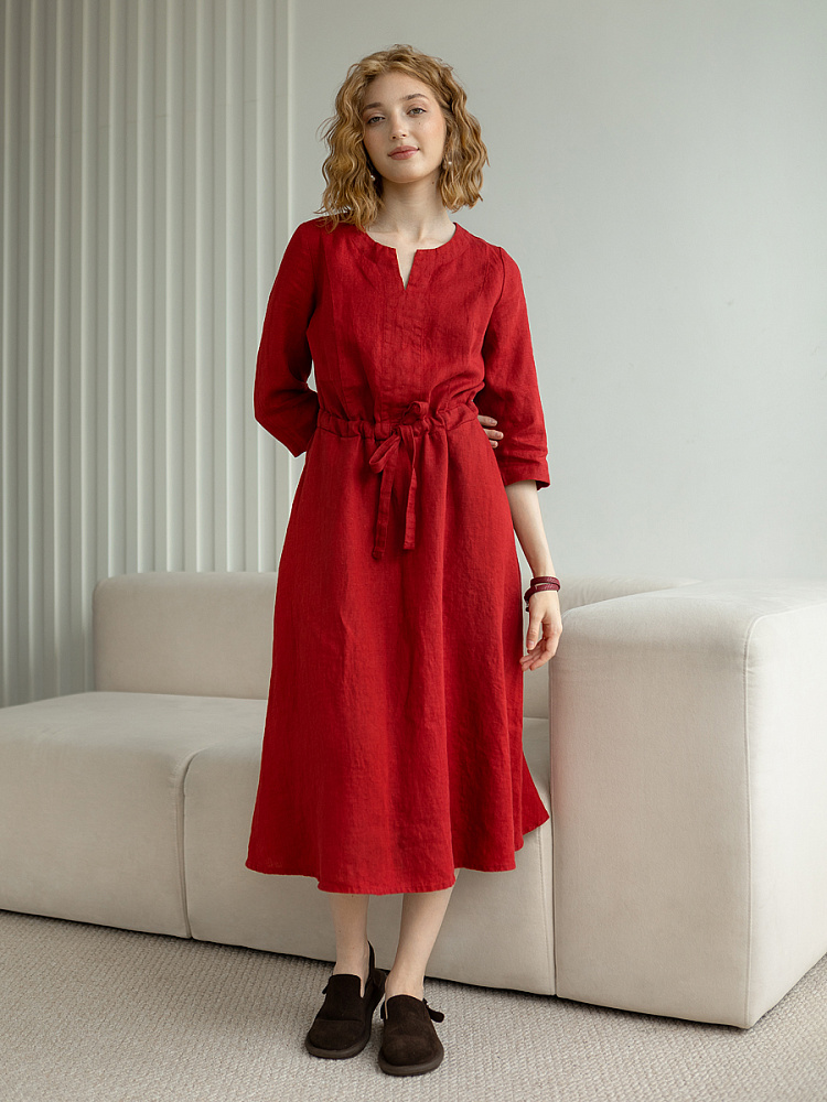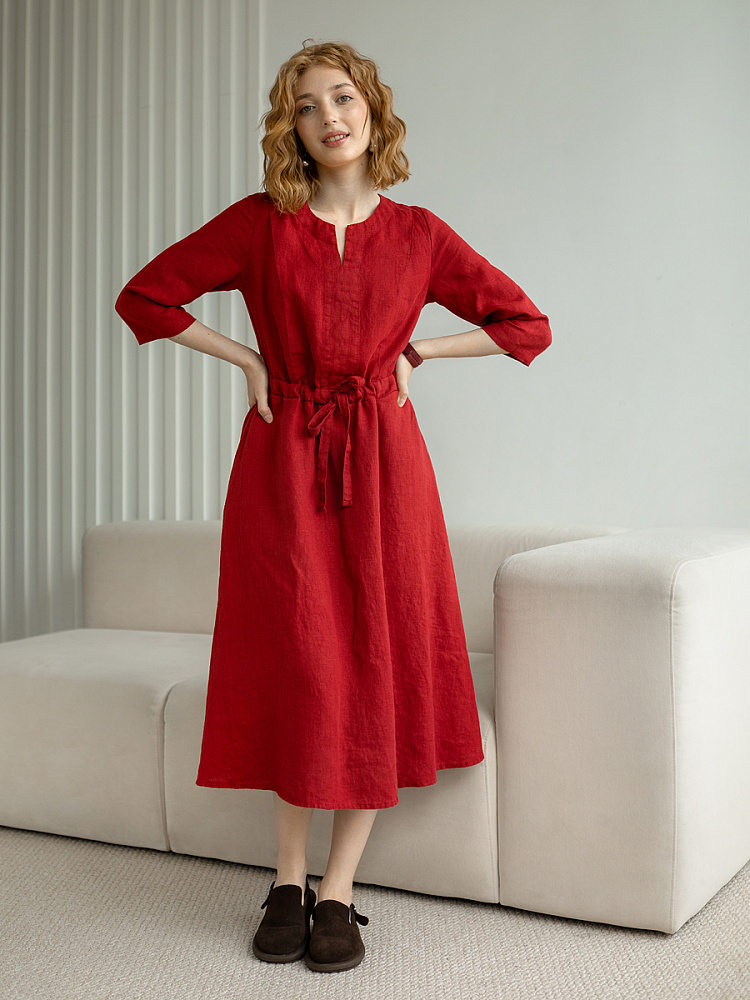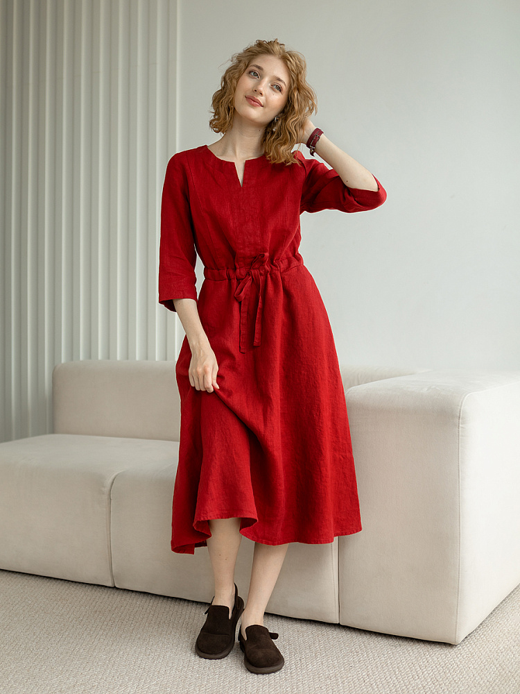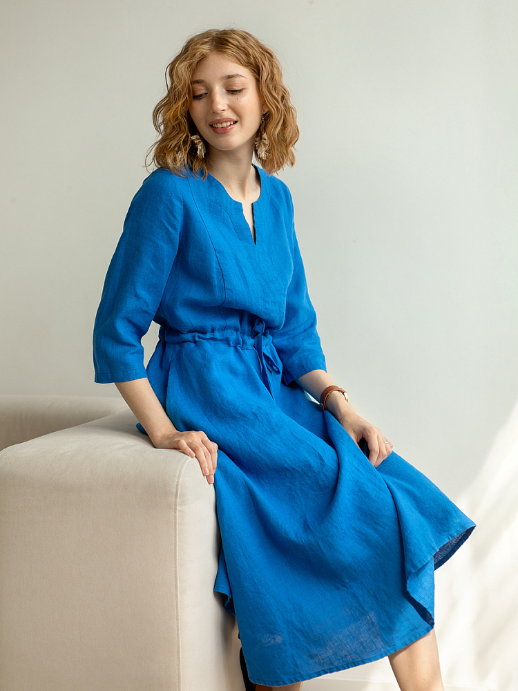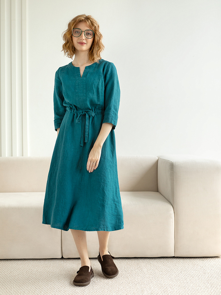 Руководствуясь принципом – к хорошему быстро привыкаешь, в последние несколько лет прослеживается запрос покупателей на качественные изделия, выполненные из натуральных материалов, обладающие хорошей посадкой на фигуре. Подобные изделия всегда в тренде, их комфортно носить, от них не наступает моральная усталость и к тому же, не стыдно демонстрировать окружающим. Представленная модель платья из льна способно удовлетворить все эти запросы. Силуэт песочные часы в сочетании с длиной миди великолепны на представительницах самого разнообразного роста и весомых достоинств. Акцентная кулиса на талии хорошо её подчёркивает, разделяя силуэт на верхнюю и нижнюю часть. Юбка не выказывает декоративного изобилия. Лёгкая расклешённость дополнена карманами в боковых швах. Лиф модели более разнообразен конструкторскими решениями. Рельефные швы на полочке и спинке выстраивают вертикали, которые поддержаны декоративной планкой по борту. Круглый вырез горловины дополняет V - образный вырез, что придаёт женским чертам утончённый силуэт.