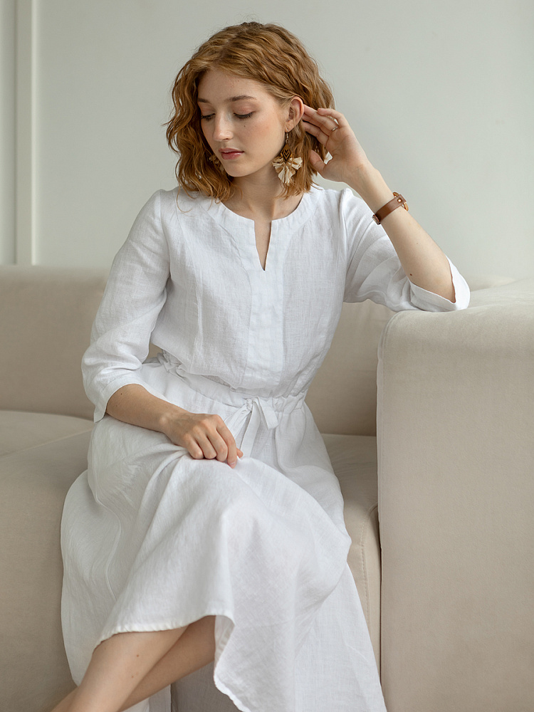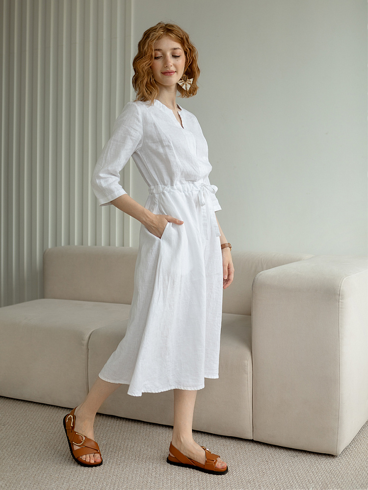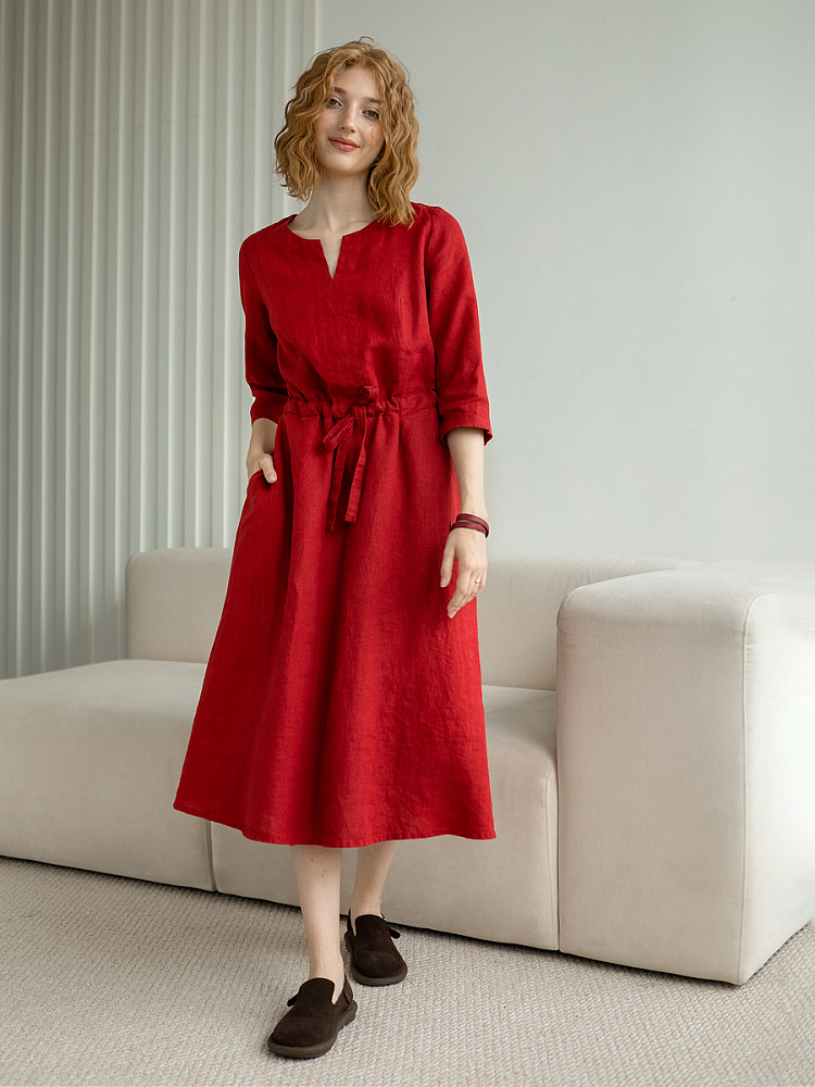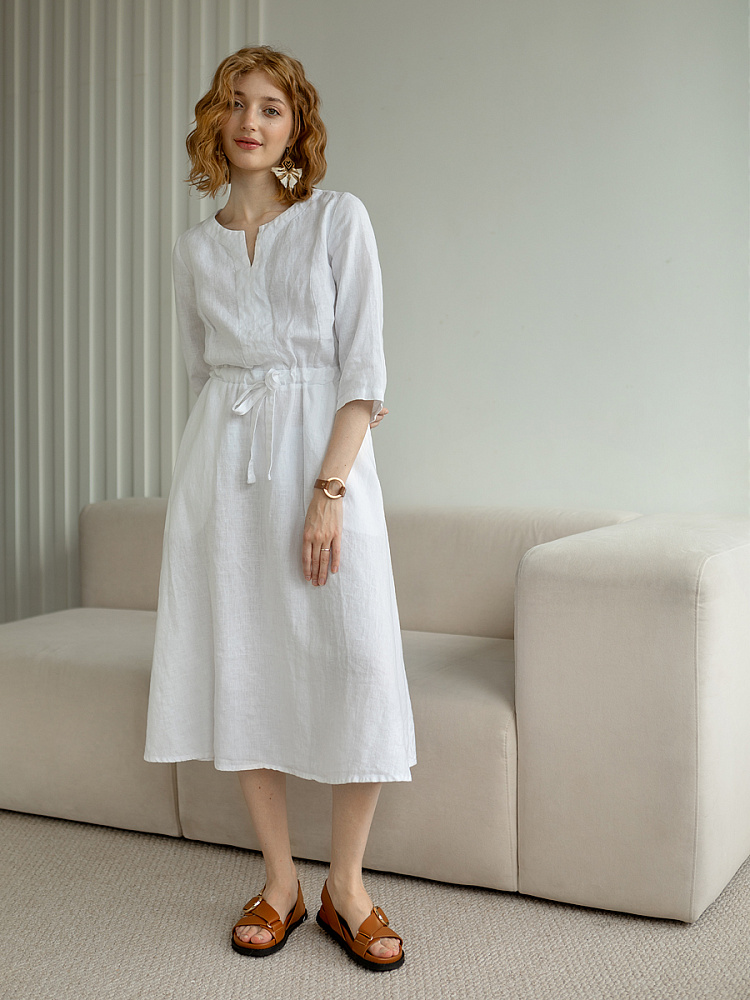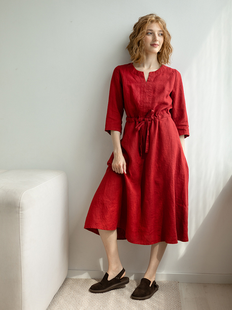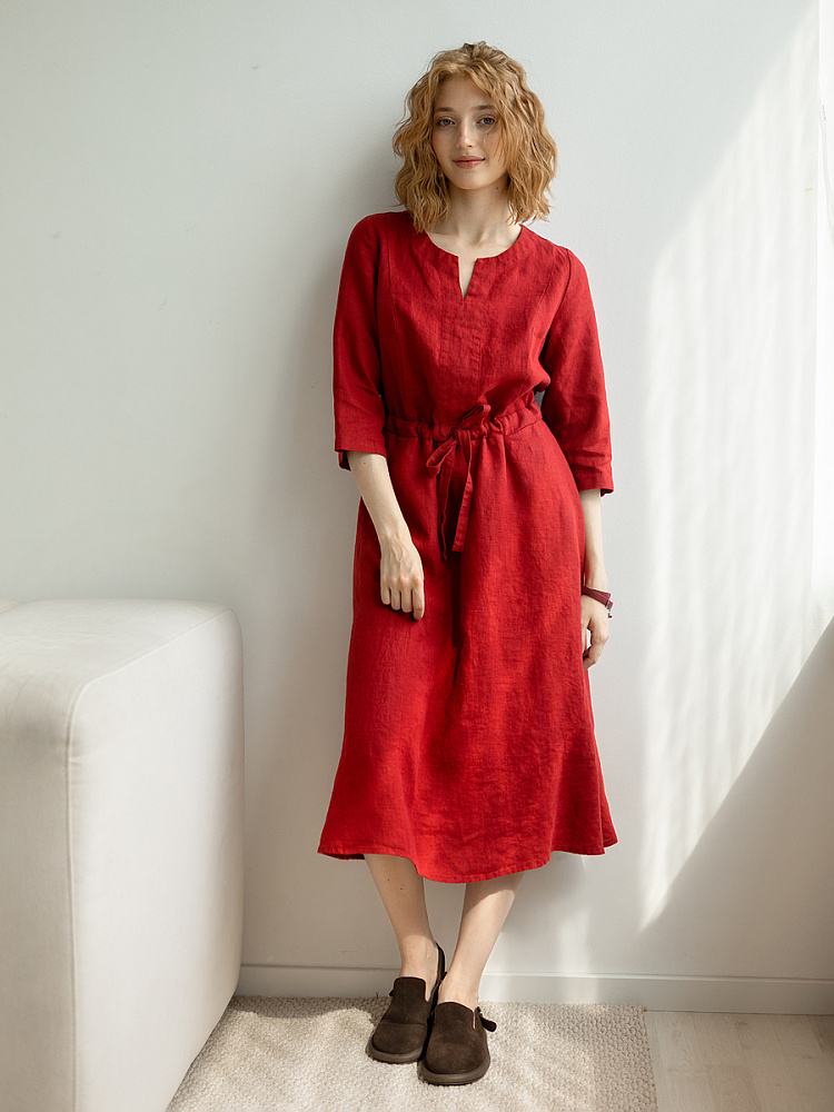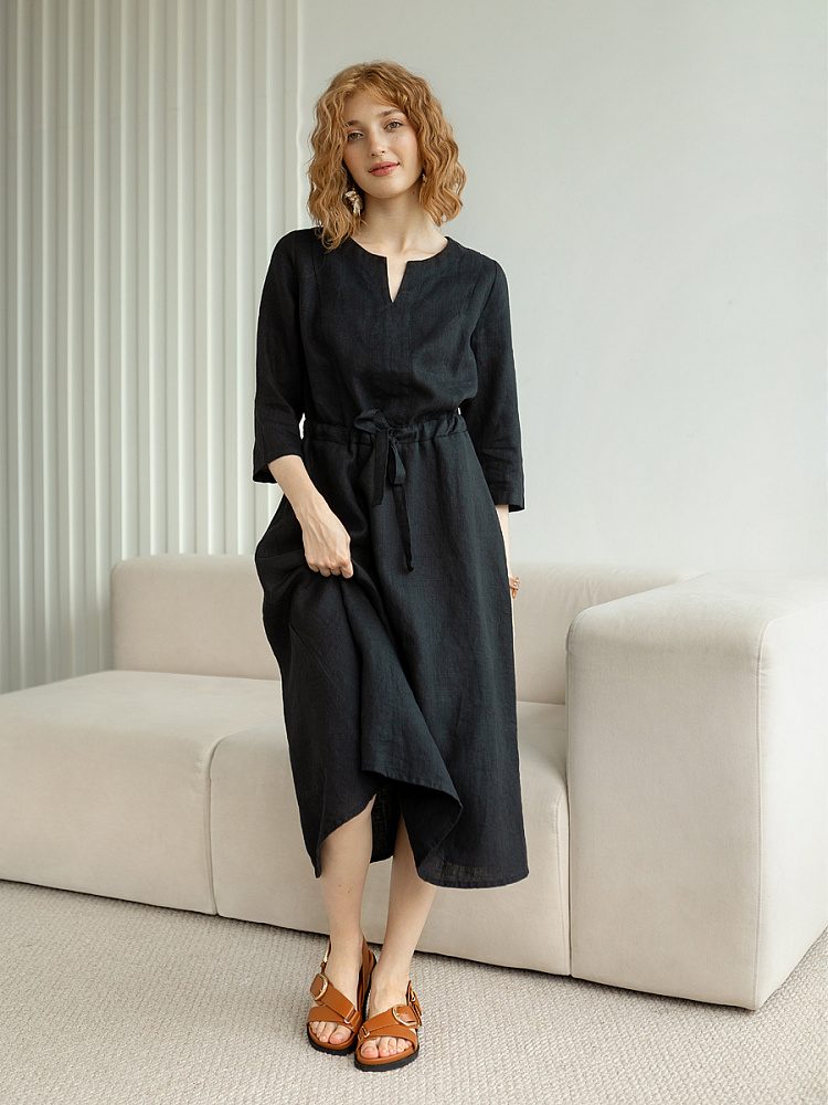Руководствуясь принципом – к хорошему быстро привыкаешь, в последние несколько лет прослеживается запрос покупателей на качественные изделия, выполненные из натуральных материалов, обладающие хорошей посадкой на фигуре. Подобные изделия всегда в тренде, их комфортно носить, от них не наступает моральная усталость и к тому же, не стыдно демонстрировать окружающим. Представленная модель платья из льна способно удовлетворить все эти запросы. Силуэт песочные часы в сочетании с длиной миди великолепны на представительницах самого разнообразного роста и весомых достоинств. Акцентная кулиса на талии хорошо её подчёркивает, разделяя силуэт на верхнюю и нижнюю часть. Юбка не выказывает декоративного изобилия. Лёгкая расклешённость дополнена карманами в боковых швах. Лиф модели более разнообразен конструкторскими решениями. Рельефные швы на полочке и спинке выстраивают вертикали, которые поддержаны декоративной планкой по борту. Круглый вырез горловины дополняет V - образный вырез, что придаёт женским чертам утончённый силуэт.