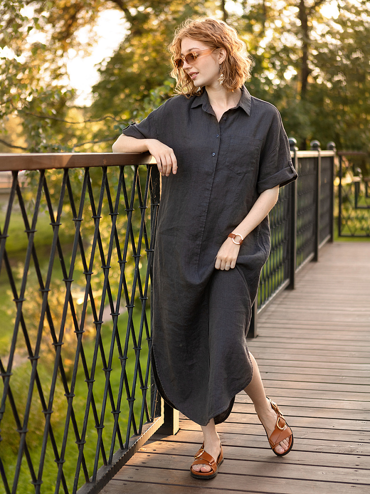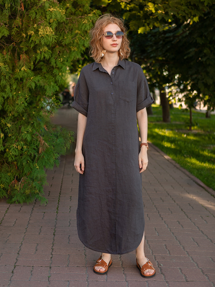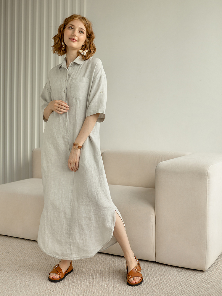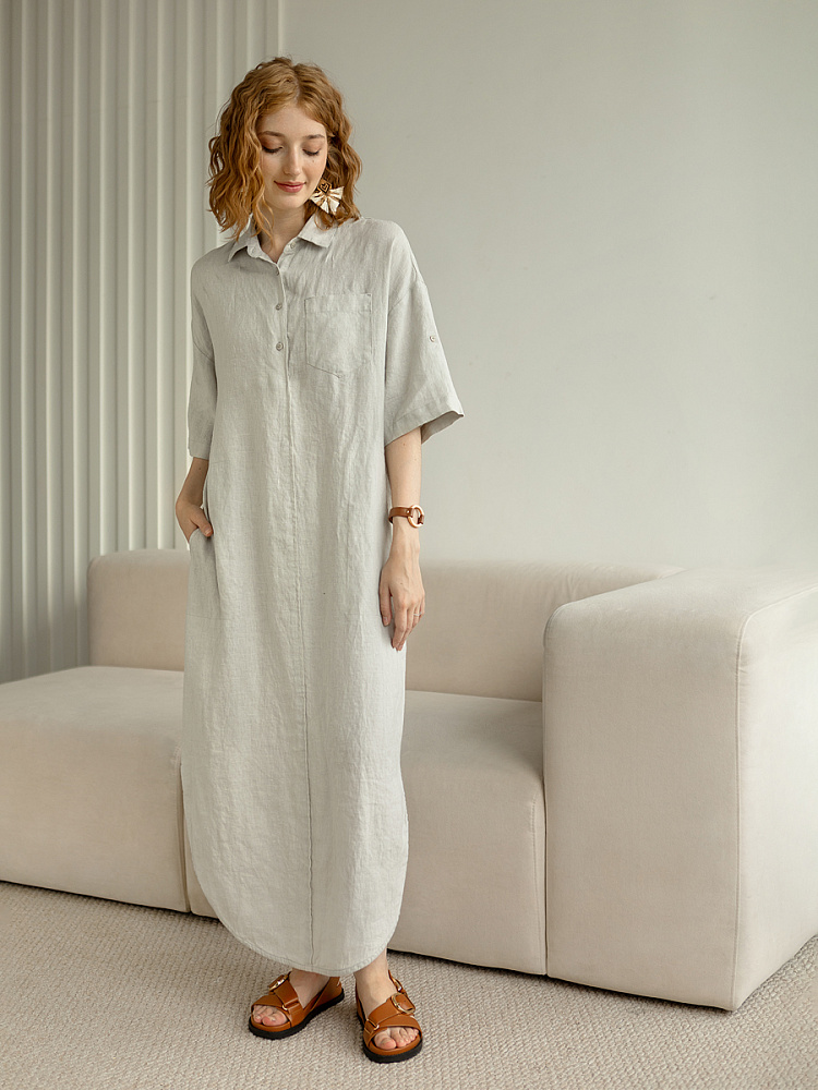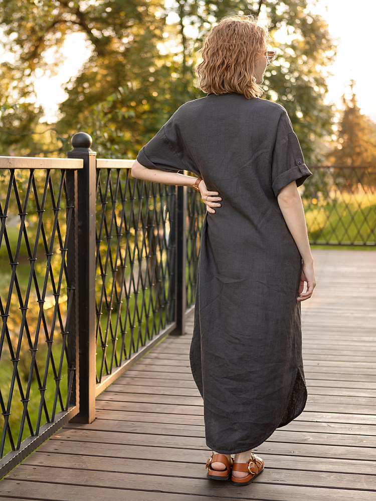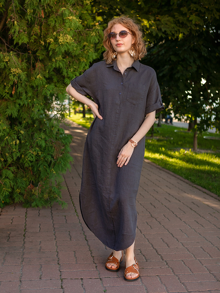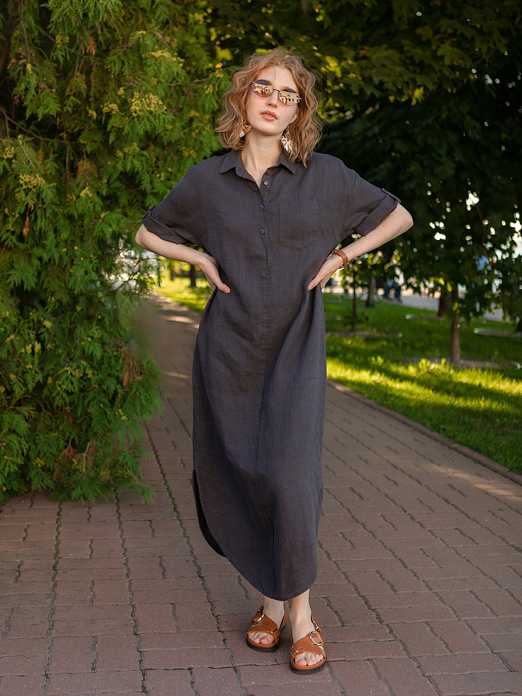 Минимализм – это синоним сдержанности. Представленная модель платья на своём примере способна раздвинуть границы привычного представления о подобных вещах. Сдержанный декор и лаконичные формы прекрасно впишутся в любые жизненные обстоятельства, будь то работа или отдых. Подобная стилистика деликатно подчеркнёт любой характер и настроение своей обладательницы. Прямые формы хорошо скроют проблемные участки фигуры, не стесняя движений, даря комфорт и практичность. Неоспоримый плюс представленного платья — это материал, из которого оно изготовлено. Натуральный лён хорошо вентилируется, поэтому ваша кожа будет дышать даже в самые жаркие дни. Прямой силуэт модели обладает длиной макси, что придаёт женской фигуре стати и респектабельности. Скруглённый нижний срез акцентирует внимание на обуви, поэтому рекомендуем внимательно отнестись к её подбору. Стояче-отложной воротник рубашечного типа плавно переходит в планку на пуговицах, выстраивая акцентную декоративную вертикаль. Плавную линию плеча завершает хлястик по низу рукава, который привносит лёгкую небрежность, нарушая правильную геометрию линий.