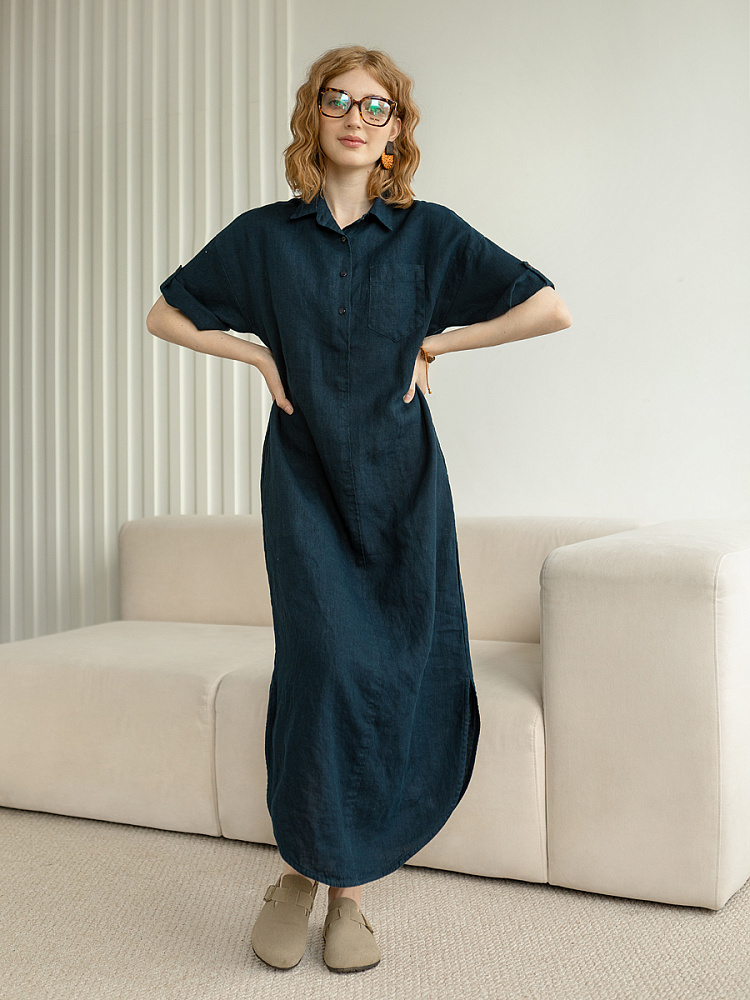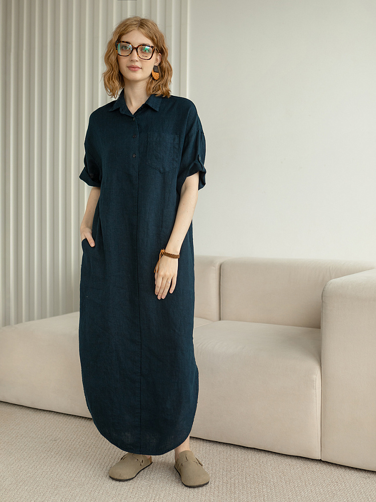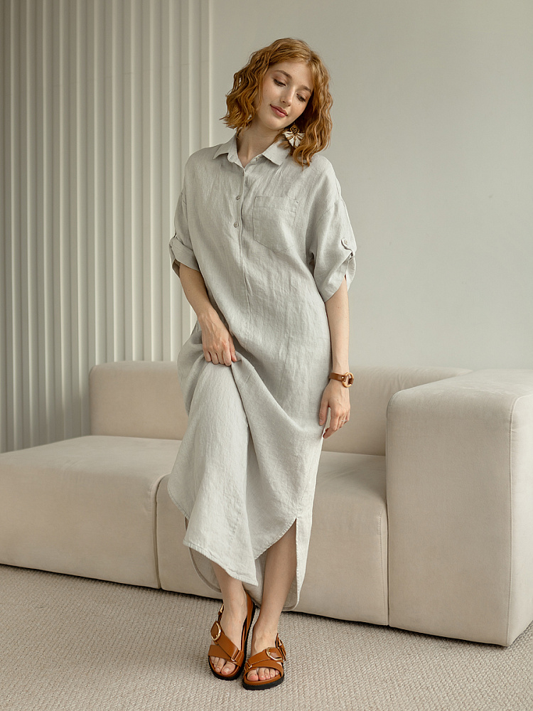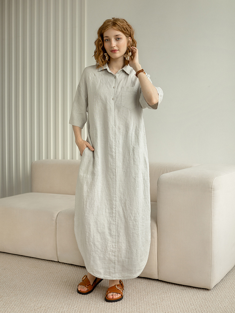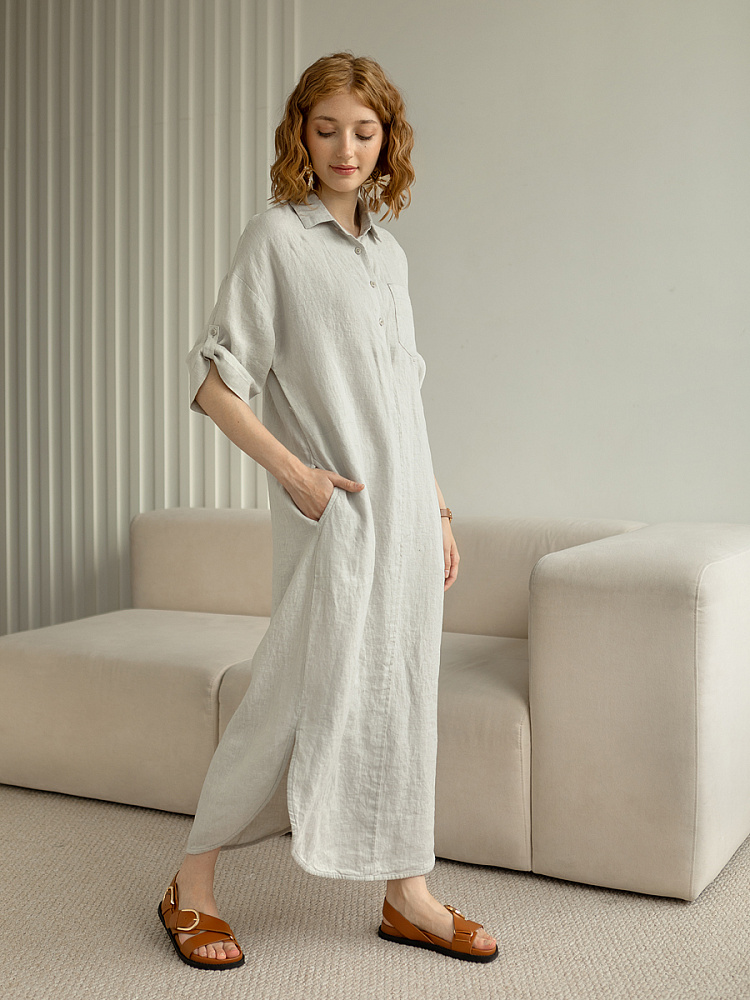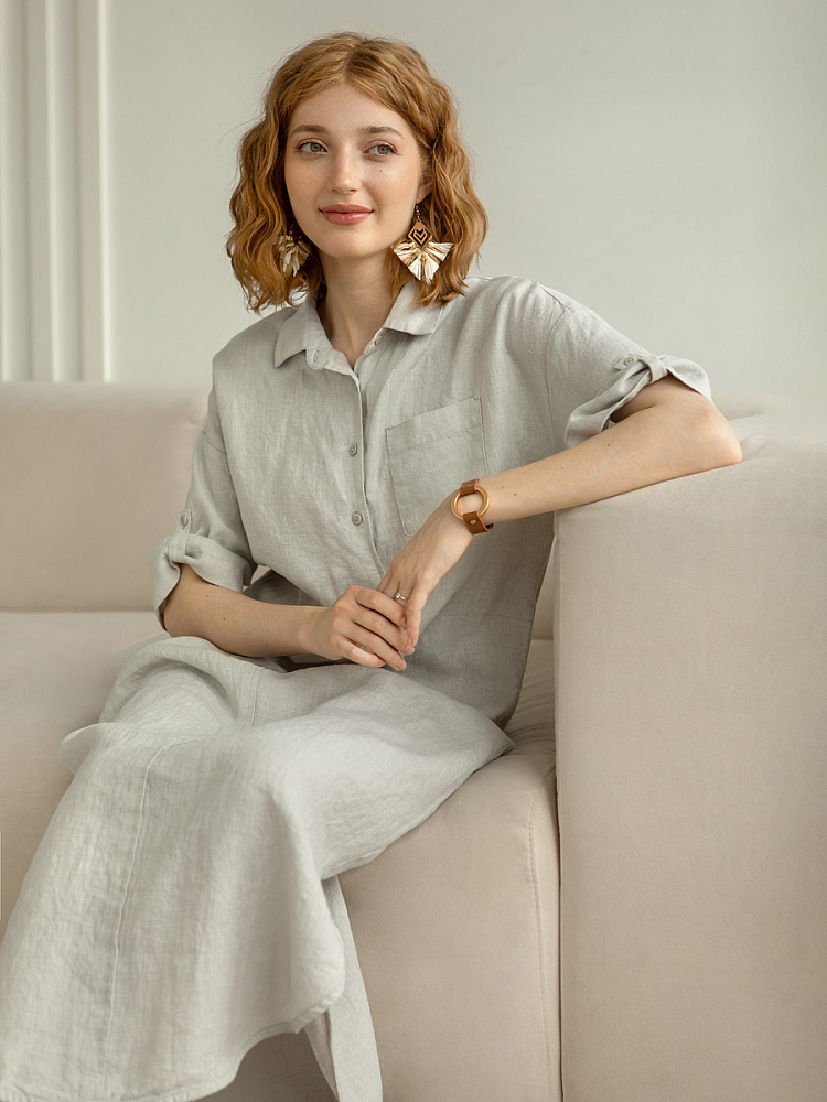Минимализм – это синоним сдержанности. Представленная модель платья на своём примере способна раздвинуть границы привычного представления о подобных вещах. Сдержанный декор и лаконичные формы прекрасно впишутся в любые жизненные обстоятельства, будь то работа или отдых. Подобная стилистика деликатно подчеркнёт любой характер и настроение своей обладательницы. Прямые формы хорошо скроют проблемные участки фигуры, не стесняя движений, даря комфорт и практичность. Неоспоримый плюс представленного платья — это материал, из которого оно изготовлено. Натуральный лён хорошо вентилируется, поэтому ваша кожа будет дышать даже в самые жаркие дни. Прямой силуэт модели обладает длиной макси, что придаёт женской фигуре стати и респектабельности. Скруглённый нижний срез акцентирует внимание на обуви, поэтому рекомендуем внимательно отнестись к её подбору. Стояче-отложной воротник рубашечного типа плавно переходит в планку на пуговицах, выстраивая акцентную декоративную вертикаль. Плавную линию плеча завершает хлястик по низу рукава, который привносит лёгкую небрежность, нарушая правильную геометрию линий.