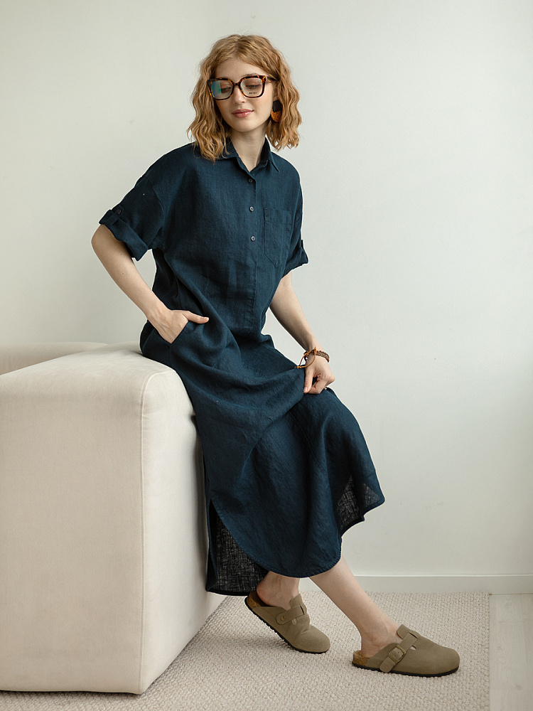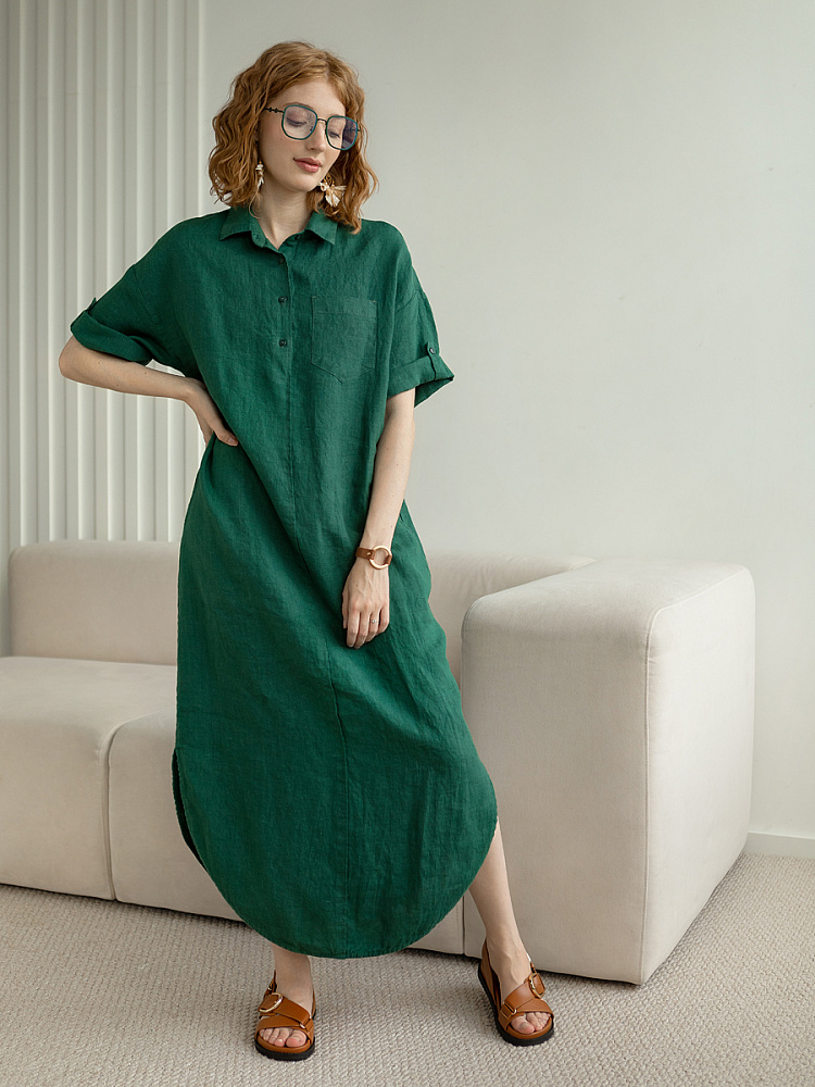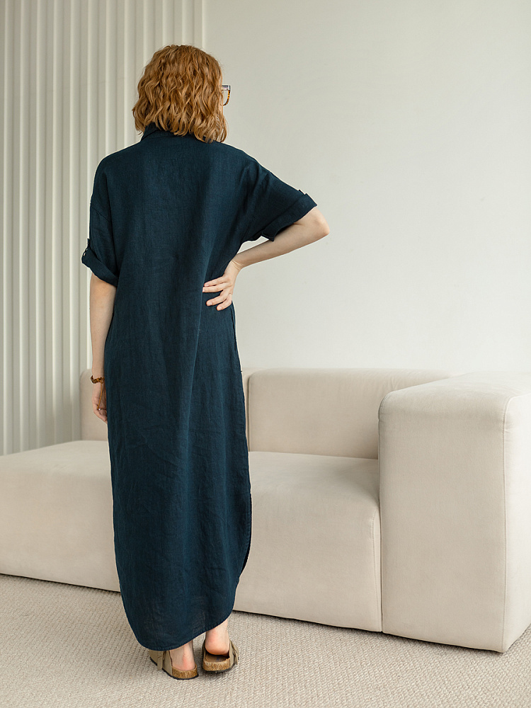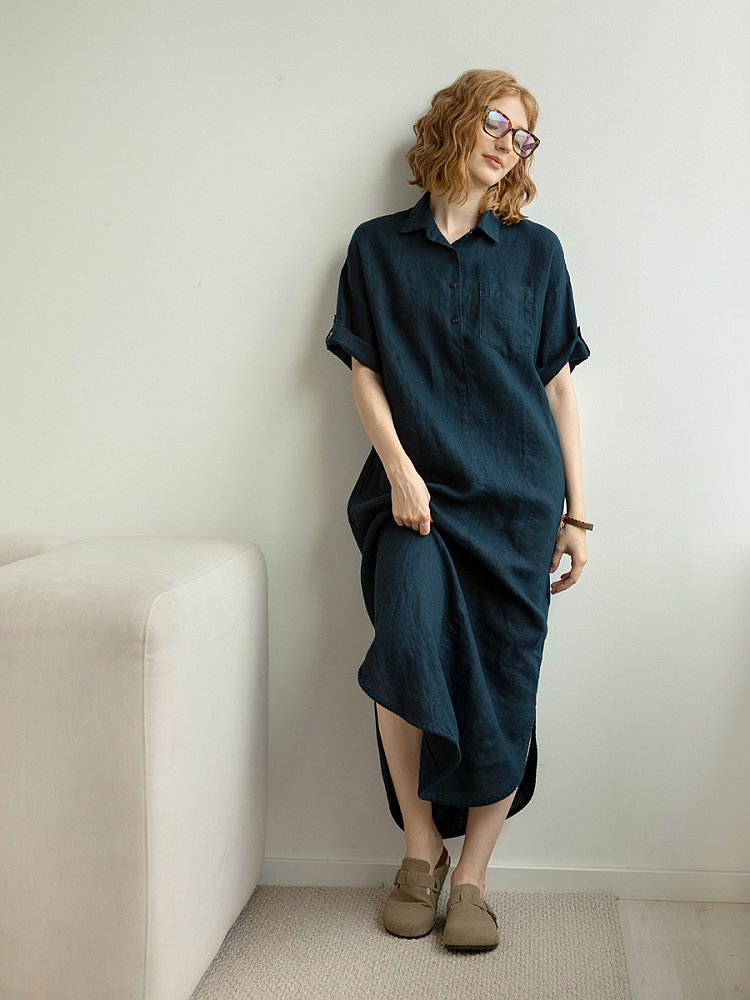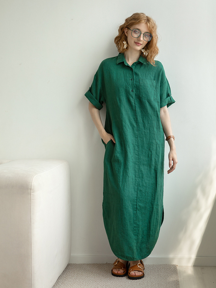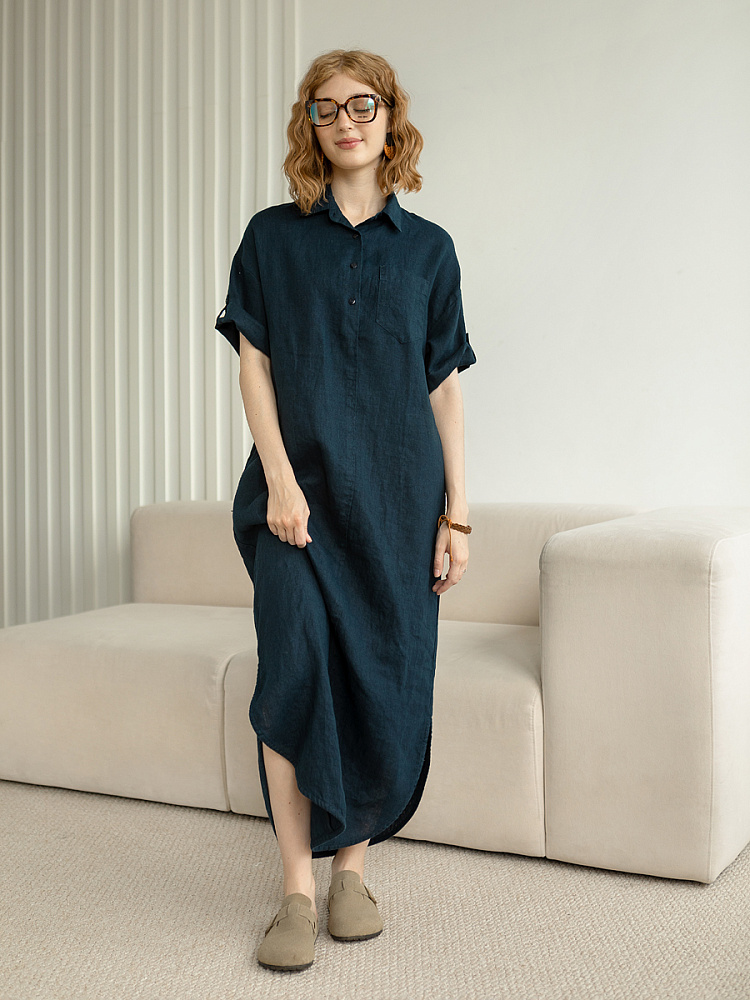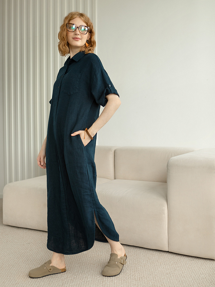 Минимализм – это синоним сдержанности. Представленная модель платья на своём примере способна раздвинуть границы привычного представления о подобных вещах. Сдержанный декор и лаконичные формы прекрасно впишутся в любые жизненные обстоятельства, будь то работа или отдых. Подобная стилистика деликатно подчеркнёт любой характер и настроение своей обладательницы. Прямые формы хорошо скроют проблемные участки фигуры, не стесняя движений, даря комфорт и практичность. Неоспоримый плюс представленного платья — это материал, из которого оно изготовлено. Натуральный лён хорошо вентилируется, поэтому ваша кожа будет дышать даже в самые жаркие дни. Прямой силуэт модели обладает длиной макси, что придаёт женской фигуре стати и респектабельности. Скруглённый нижний срез акцентирует внимание на обуви, поэтому рекомендуем внимательно отнестись к её подбору. Стояче-отложной воротник рубашечного типа плавно переходит в планку на пуговицах, выстраивая акцентную декоративную вертикаль. Плавную линию плеча завершает хлястик по низу рукава, который привносит лёгкую небрежность, нарушая правильную геометрию линий.