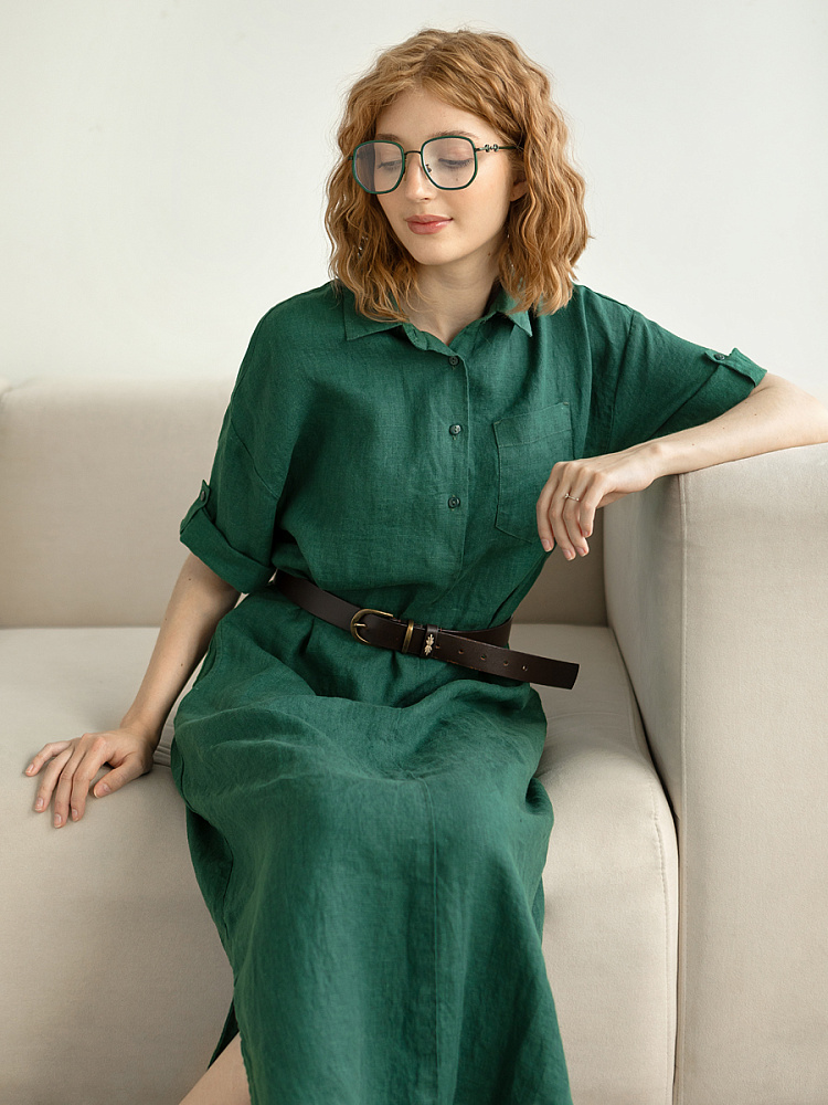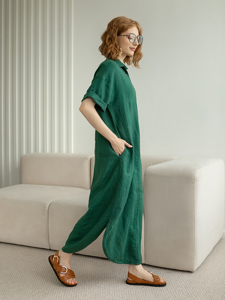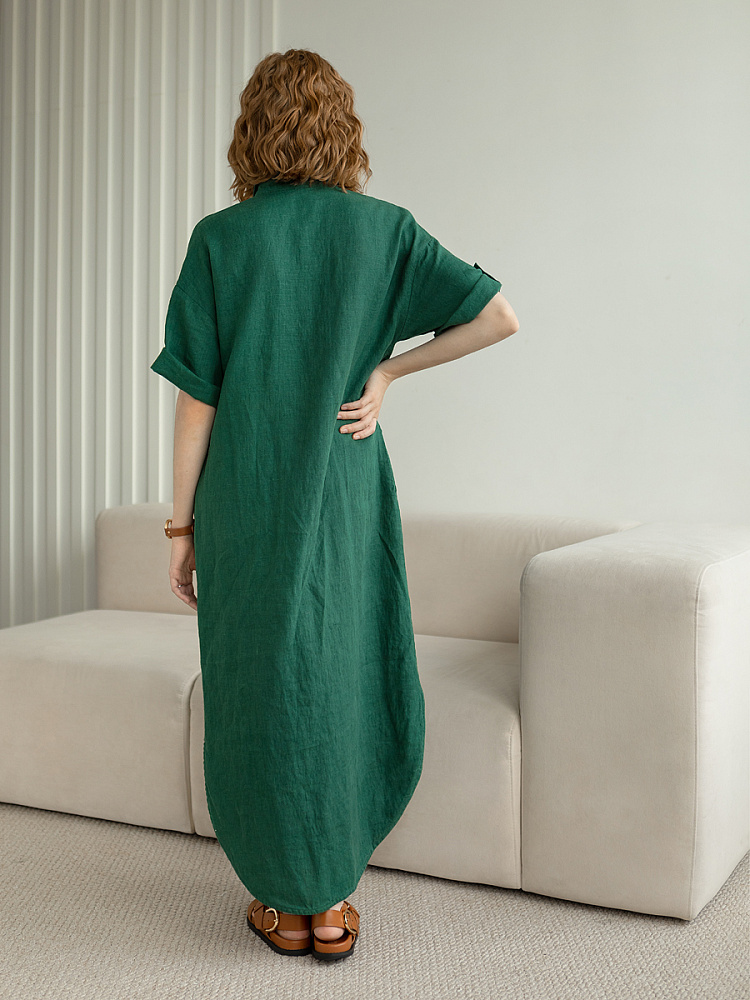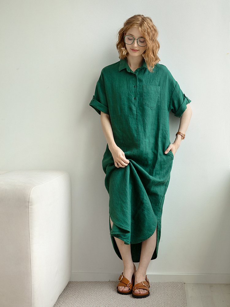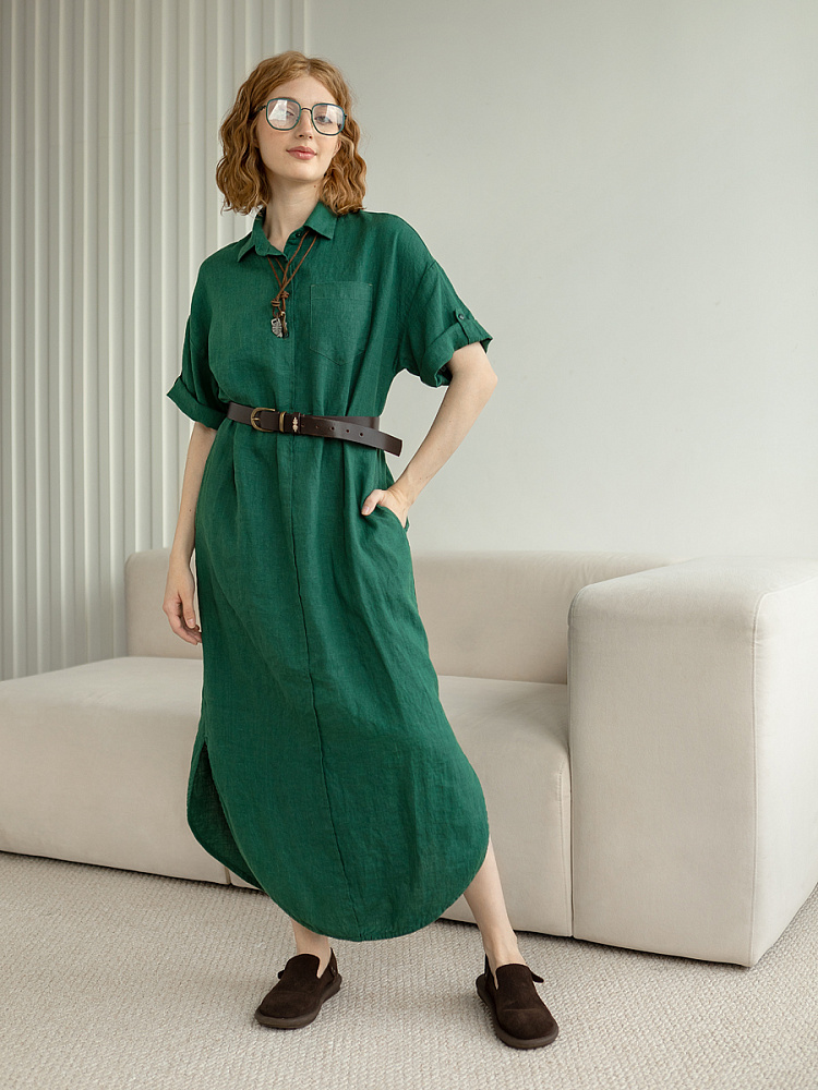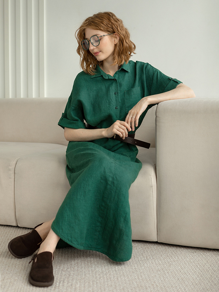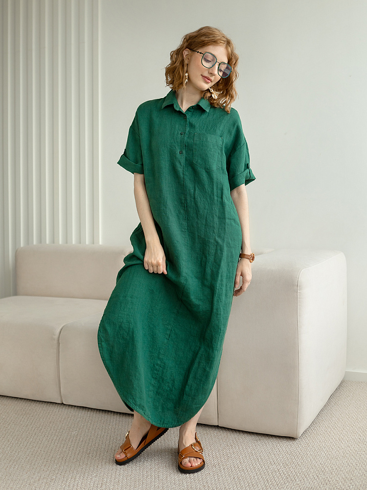 Минимализм – это синоним сдержанности. Представленная модель платья на своём примере способна раздвинуть границы привычного представления о подобных вещах. Сдержанный декор и лаконичные формы прекрасно впишутся в любые жизненные обстоятельства, будь то работа или отдых. Подобная стилистика деликатно подчеркнёт любой характер и настроение своей обладательницы. Прямые формы хорошо скроют проблемные участки фигуры, не стесняя движений, даря комфорт и практичность. Неоспоримый плюс представленного платья — это материал, из которого оно изготовлено. Натуральный лён хорошо вентилируется, поэтому ваша кожа будет дышать даже в самые жаркие дни. Прямой силуэт модели обладает длиной макси, что придаёт женской фигуре стати и респектабельности. Скруглённый нижний срез акцентирует внимание на обуви, поэтому рекомендуем внимательно отнестись к её подбору. Стояче-отложной воротник рубашечного типа плавно переходит в планку на пуговицах, выстраивая акцентную декоративную вертикаль. Плавную линию плеча завершает хлястик по низу рукава, который привносит лёгкую небрежность, нарушая правильную геометрию линий.