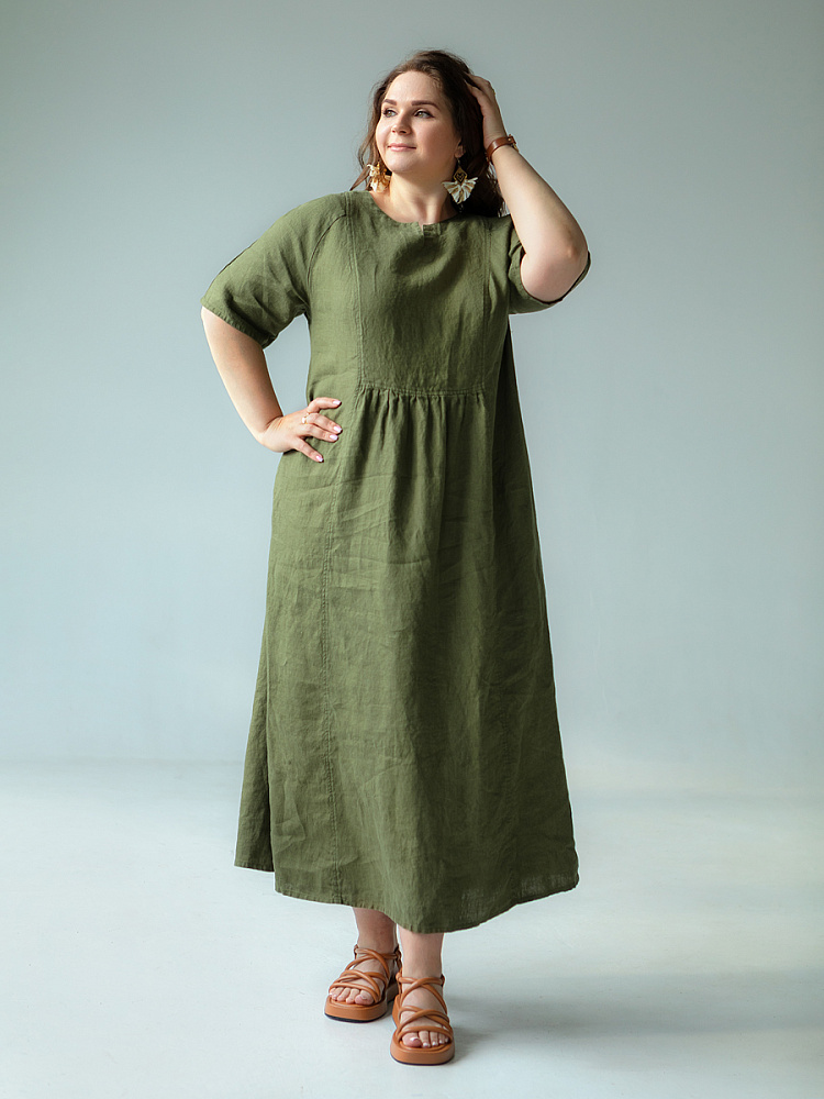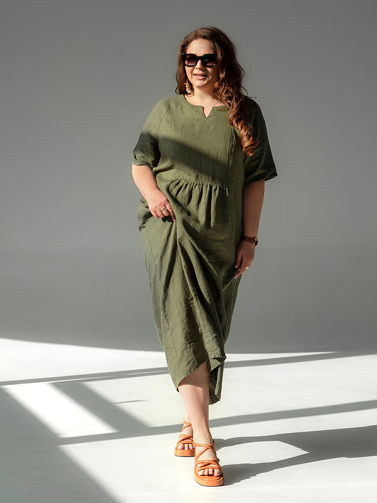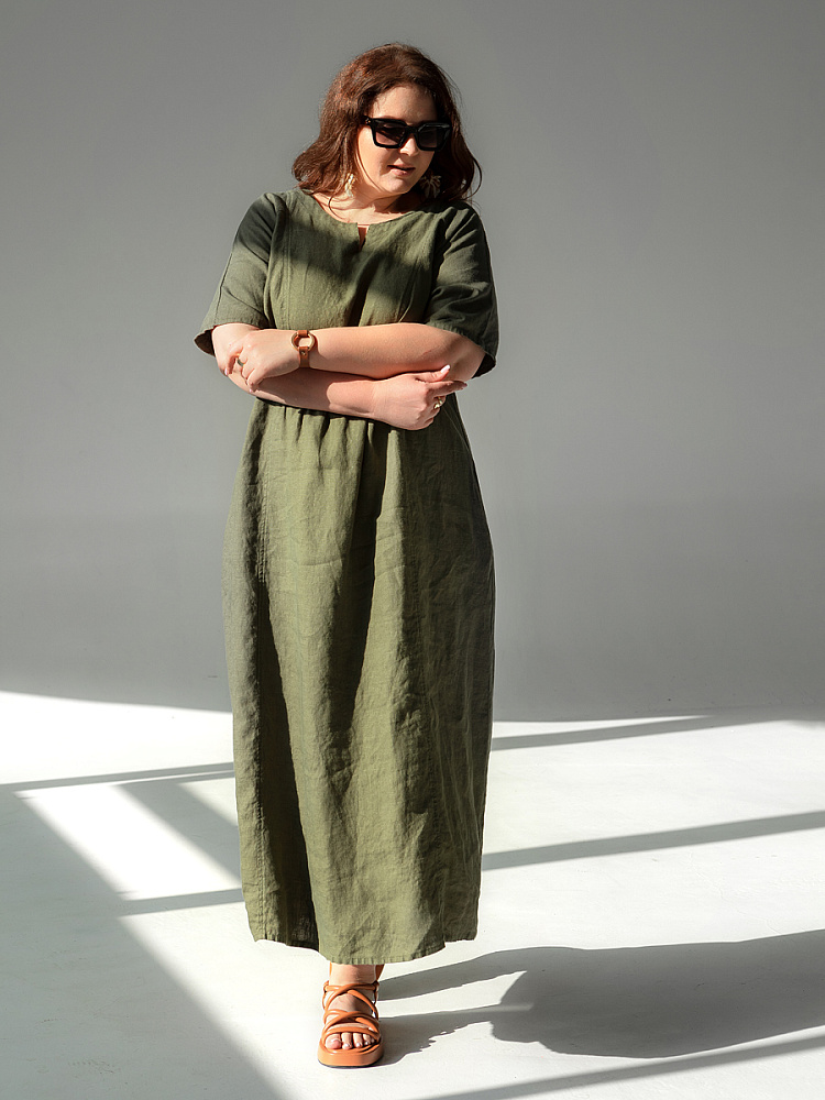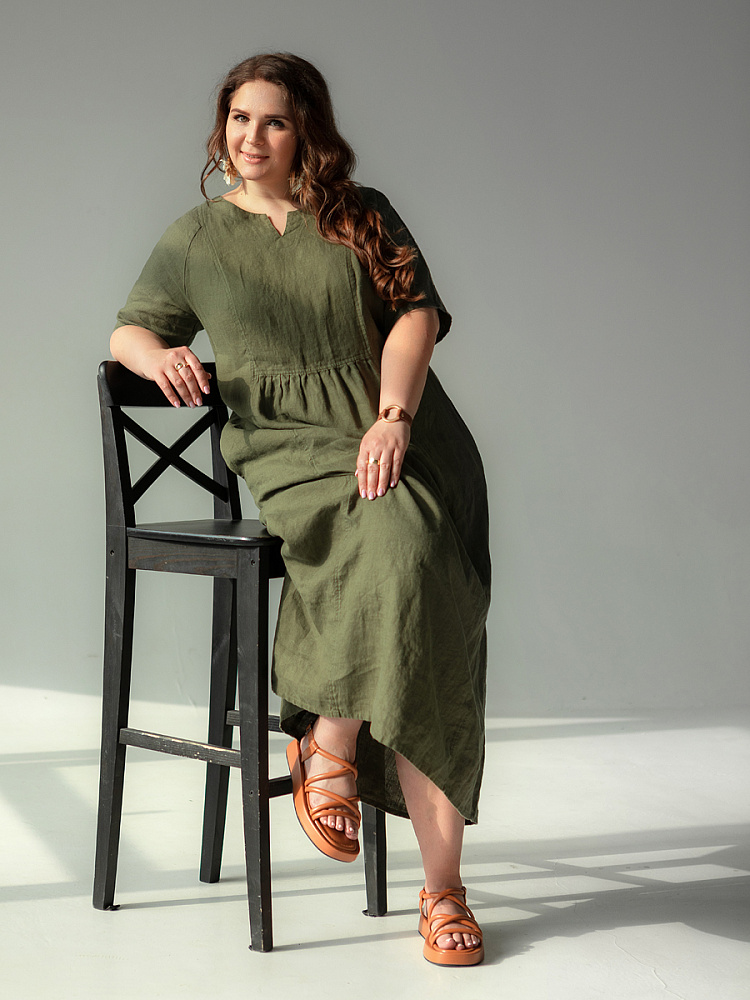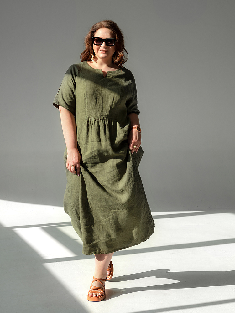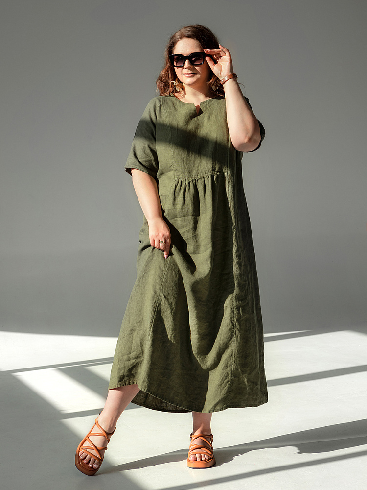 Если вы являетесь дамой весомых достоинств и замучались подбирать вещи достойные вас – вам стоит обратить внимание на линейку моделей Kayros, которые учитывают все ваши чаянья. Представленное платье выполнено из натурального льна, который станет спасением в жаркие будни. Натуральные волокна хорошо вентилируются и впитывают влагу, не вызывают неприятных ощущений для кожи. Фактура ткани обладает потрясающей жатой текстурой, что придаёт платью самобытный и харизматичный внешний вид. Прямой полуприлегающий силуэт стильно скроет все ваши тревоги на тему «проблемных участков», даря исключительно позитивные эмоции. Длина миди наделяет женскую фигуру статными пропорциями и предполагает самые различные виды обуви. Это может быть каблук, танкетка или сплошная подошва. Рукав покроя реглан делает линию плеча плавной и женственной. Долю кокетства в образ привносит фигурный вырез горловины и мелкая присобранность под грудью и спинке. Декоративная строчка вдоль рельефных швов демонстрирует минималистический настрой платья. А карманы в боковых швах станут приятным и удобным дополнением к образу.