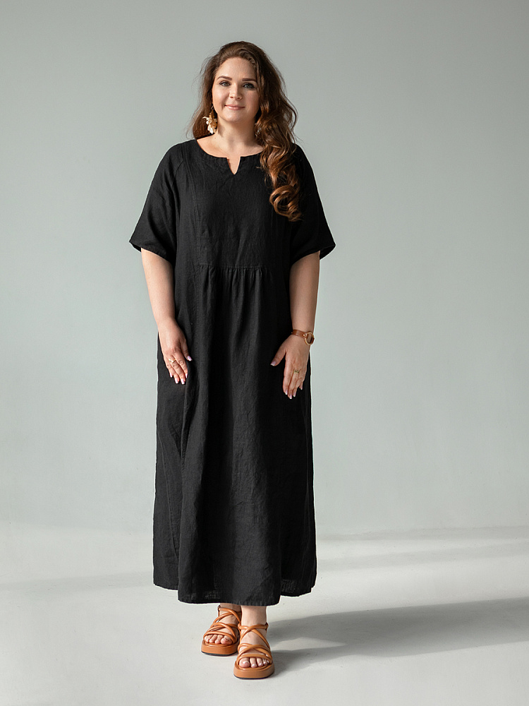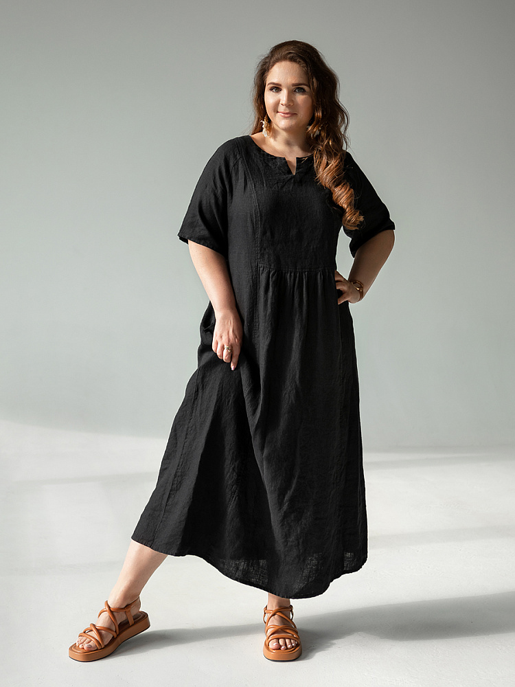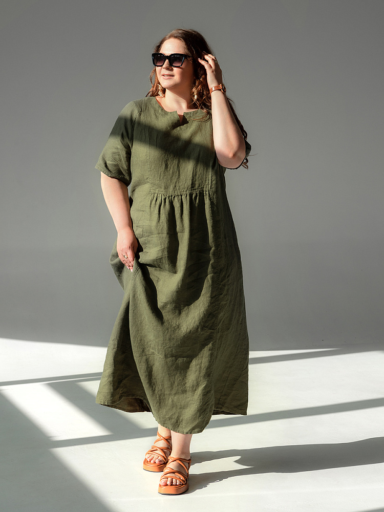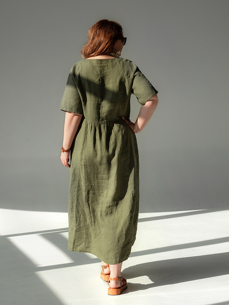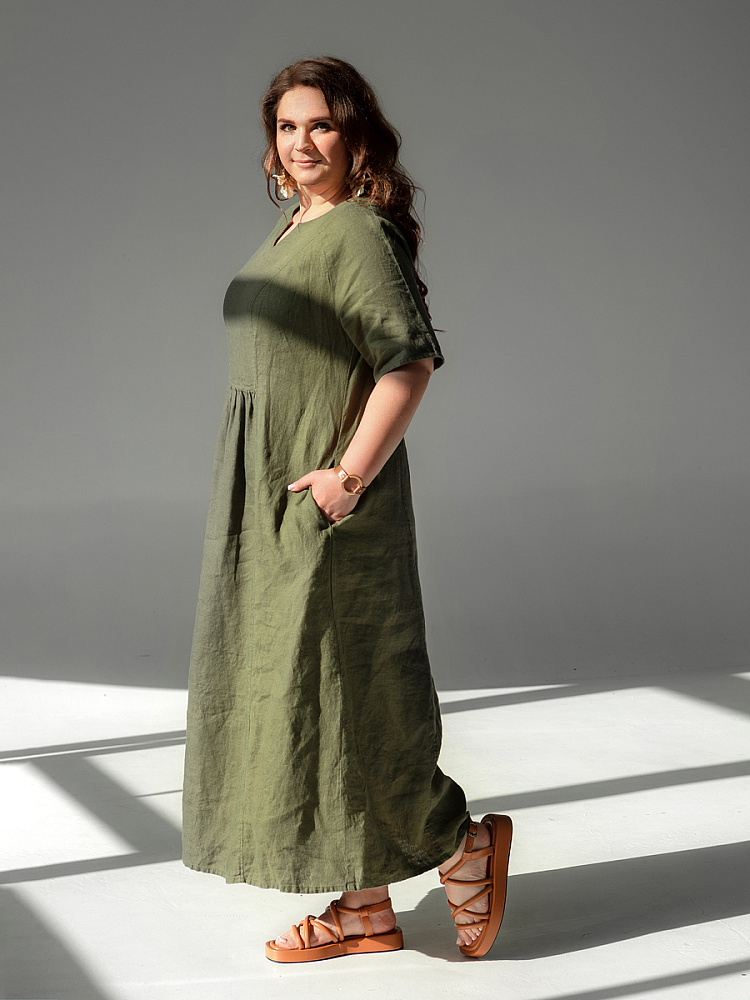 Если вы являетесь дамой весомых достоинств и замучались подбирать вещи достойные вас – вам стоит обратить внимание на линейку моделей Kayros, которые учитывают все ваши чаянья. Представленное платье выполнено из натурального льна, который станет спасением в жаркие будни. Натуральные волокна хорошо вентилируются и впитывают влагу, не вызывают неприятных ощущений для кожи. Фактура ткани обладает потрясающей жатой текстурой, что придаёт платью самобытный и харизматичный внешний вид. Прямой полуприлегающий силуэт стильно скроет все ваши тревоги на тему «проблемных участков», даря исключительно позитивные эмоции. Длина миди наделяет женскую фигуру статными пропорциями и предполагает самые различные виды обуви. Это может быть каблук, танкетка или сплошная подошва. Рукав покроя реглан делает линию плеча плавной и женственной. Долю кокетства в образ привносит фигурный вырез горловины и мелкая присобранность под грудью и спинке. Декоративная строчка вдоль рельефных швов демонстрирует минималистический настрой платья. А карманы в боковых швах станут приятным и удобным дополнением к образу.