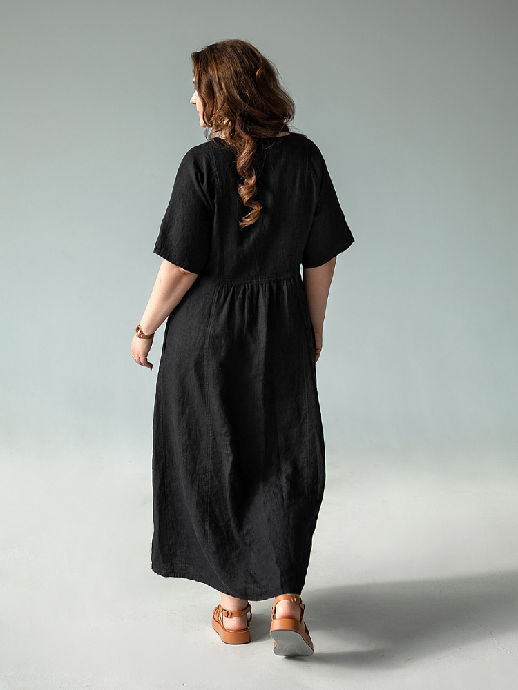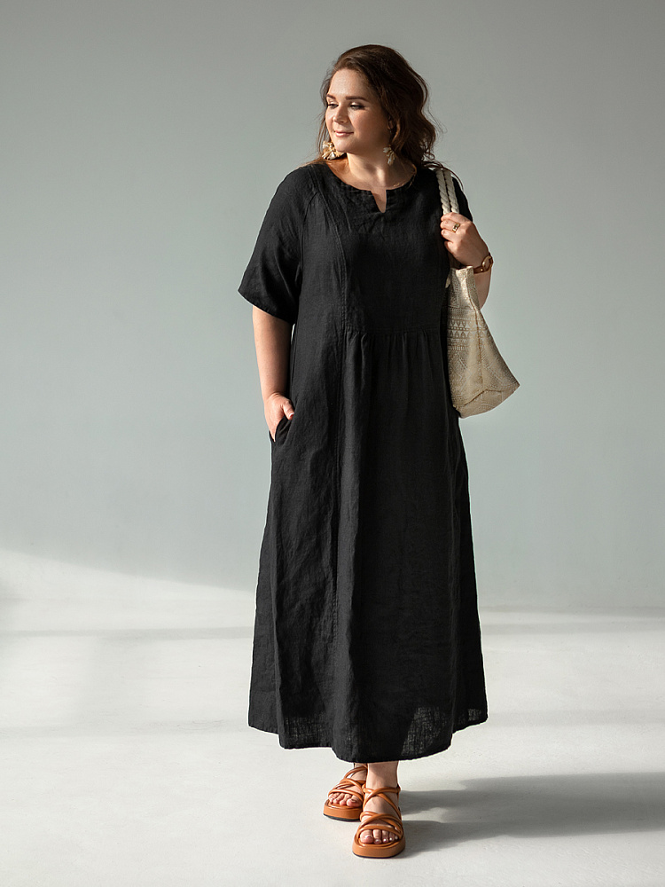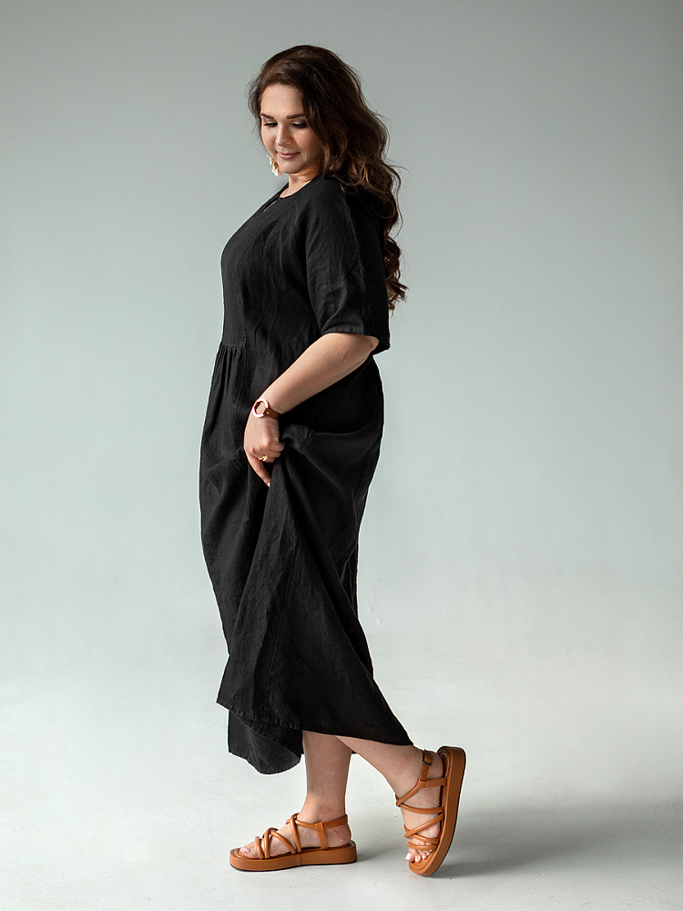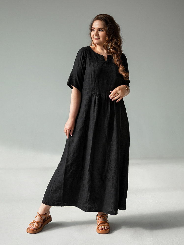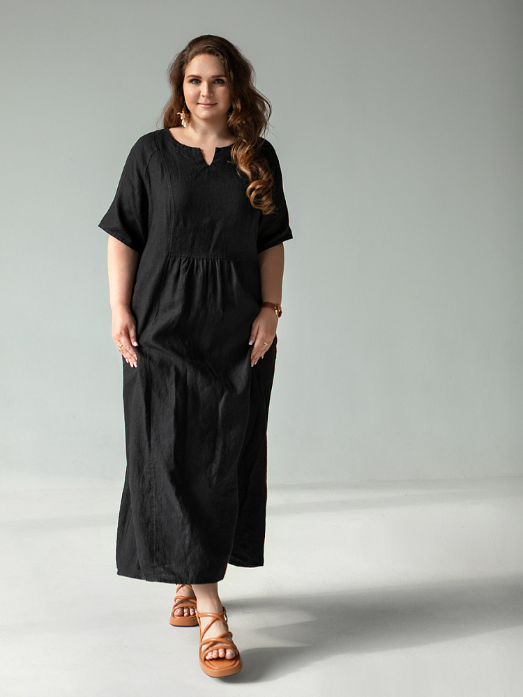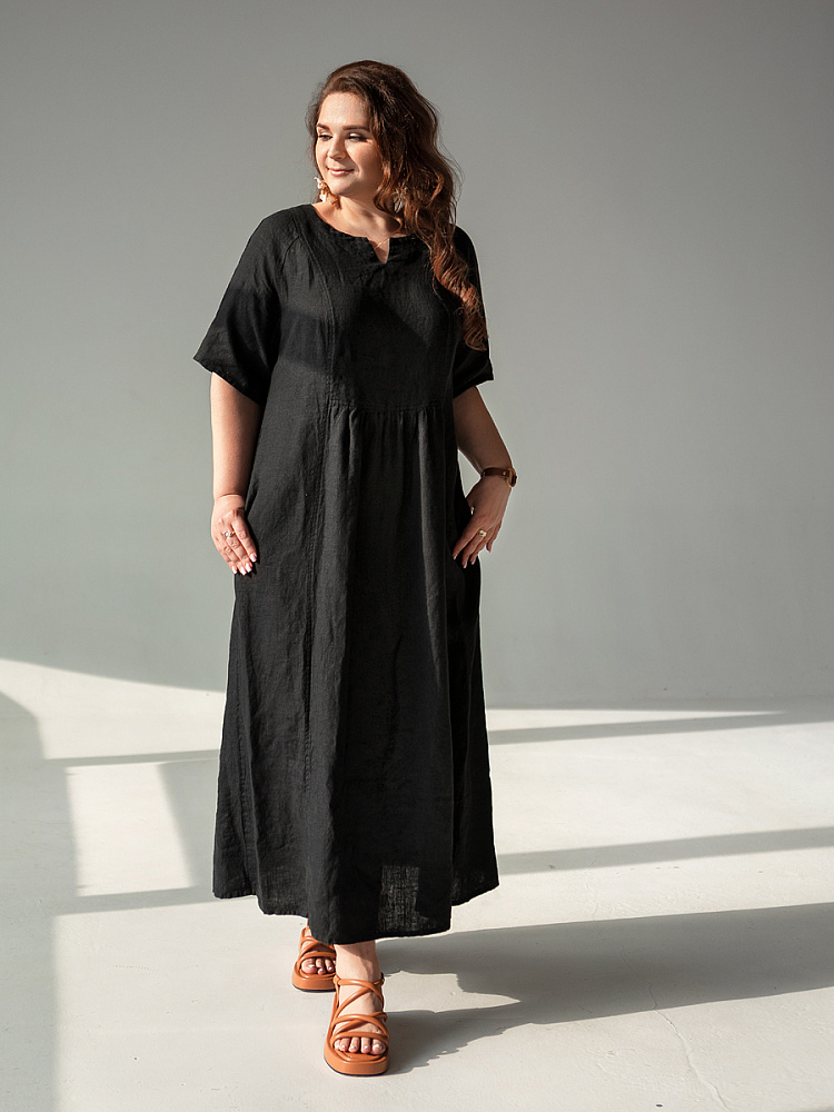 Если вы являетесь дамой весомых достоинств и замучались подбирать вещи достойные вас – вам стоит обратить внимание на линейку моделей Kayros, которые учитывают все ваши чаянья. Представленное платье выполнено из натурального льна, который станет спасением в жаркие будни. Натуральные волокна хорошо вентилируются и впитывают влагу, не вызывают неприятных ощущений для кожи. Фактура ткани обладает потрясающей жатой текстурой, что придаёт платью самобытный и харизматичный внешний вид. Прямой полуприлегающий силуэт стильно скроет все ваши тревоги на тему «проблемных участков», даря исключительно позитивные эмоции. Длина миди наделяет женскую фигуру статными пропорциями и предполагает самые различные виды обуви. Это может быть каблук, танкетка или сплошная подошва. Рукав покроя реглан делает линию плеча плавной и женственной. Долю кокетства в образ привносит фигурный вырез горловины и мелкая присобранность под грудью и спинке. Декоративная строчка вдоль рельефных швов демонстрирует минималистический настрой платья. А карманы в боковых швах станут приятным и удобным дополнением к образу.