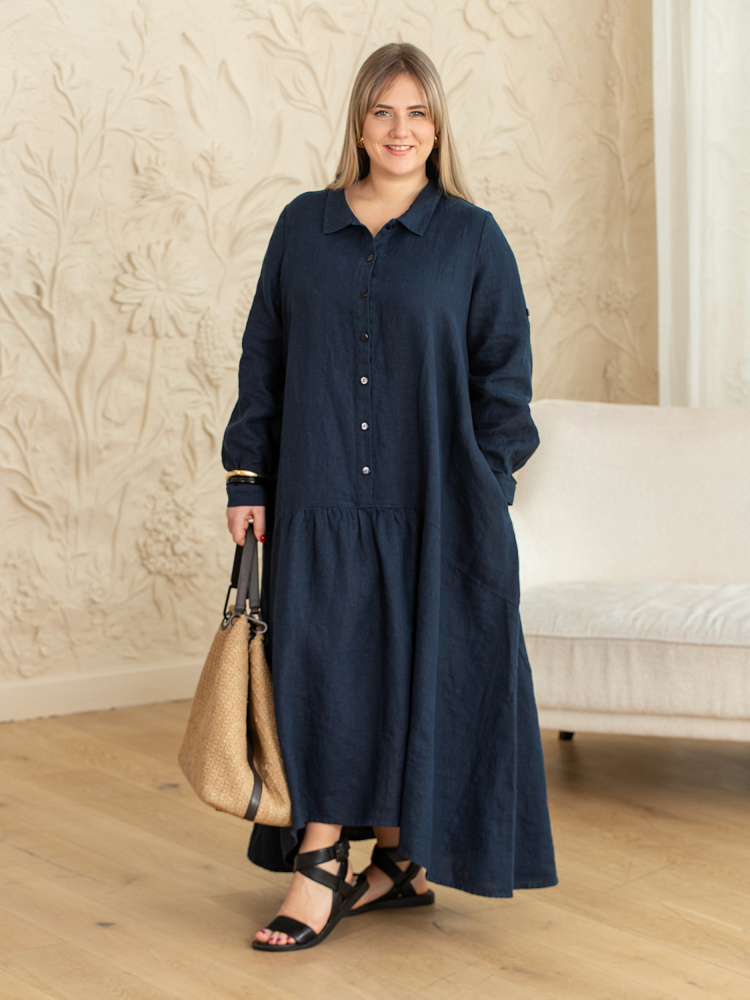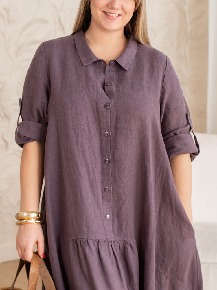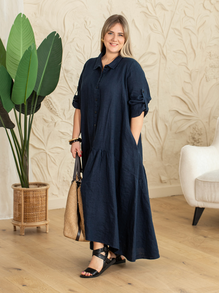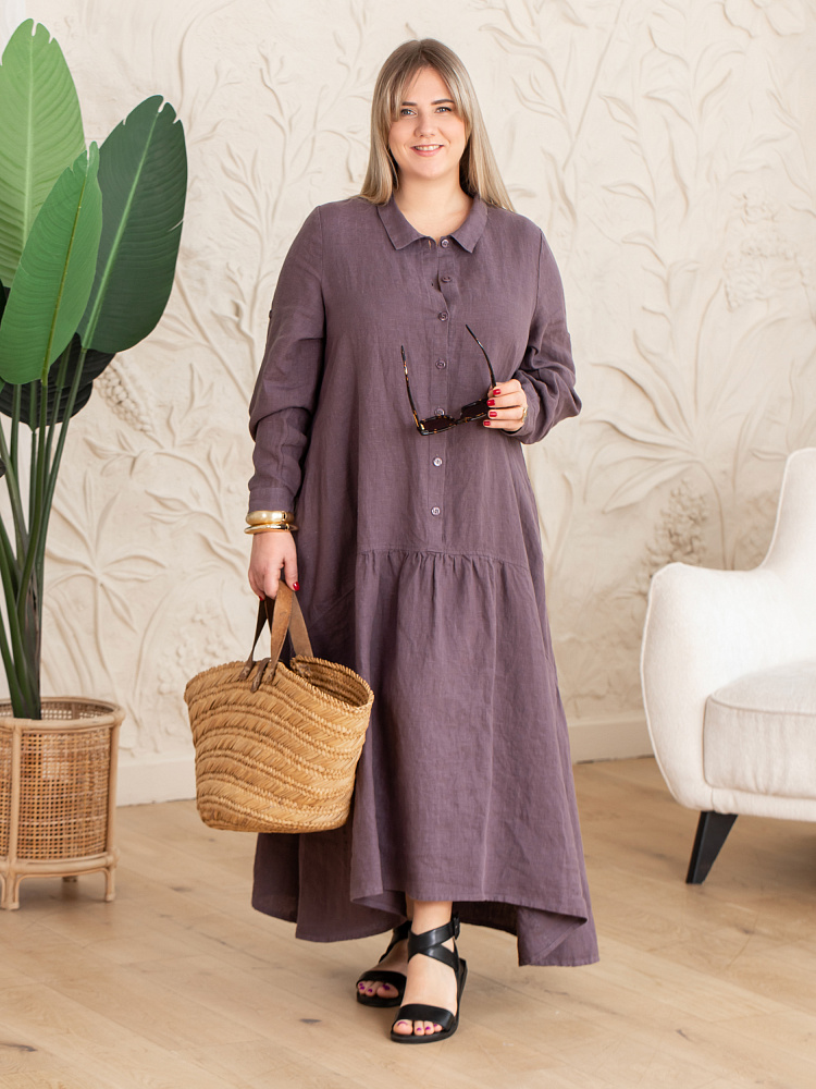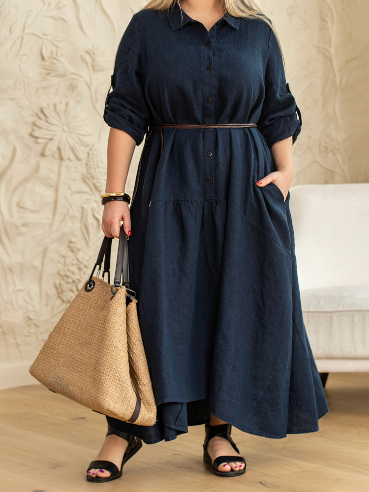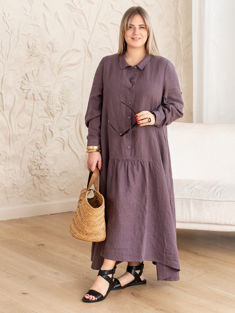 Элегантное платье в стиле бохо — идеальный выбор для женщин, ценящих комфорт и свободу движений. Модель разработана с учётом пожеланий женщин весомых достоинств. Пропорции и силуэт стильно скроют все несовершенства фигуры. Изготовлено платье из натурального льна, который обеспечивает отличную воздухопроницаемость и комфорт в носке. Укороченная длина по полочке позволяет продемонстрировать стильную обувь, которая завершит ваш образ. Это могут быть босоножки на танкетке или сплошном ходу. Разновеликий низ элегантно подчёркнут отрезной деталью, которая имеет мелкую сборку. Все эти приёмы создают манящий и притягательный бохо стиль. А вот центральная застёжка - планка на пуговицах, втачной рукав с манжетой и стояче - отложной воротник выказывают в модели элементы мужской сорочки. Такое смешение стилей привносят в платье харизматичные отличительные черты. Дизайнеры позаботились о функционале и универсальности, снабдив рукава хлястиками, при помощи которых можно регулировать длину рукава. Это платье станет отличным дополнением к вашему гардеробу.