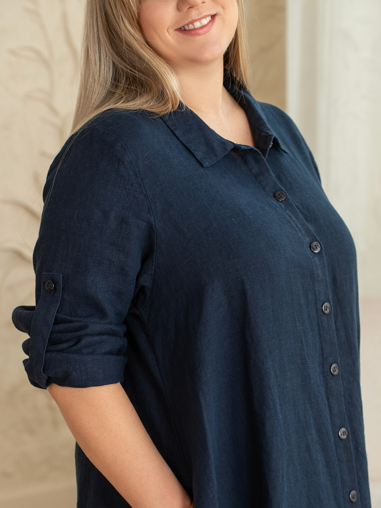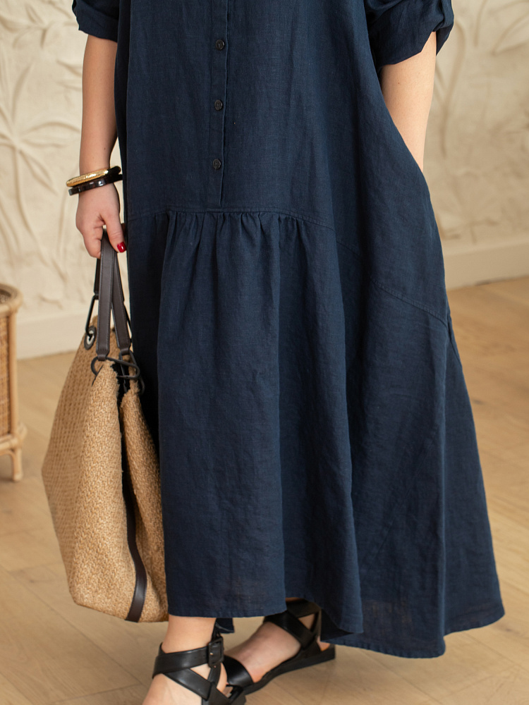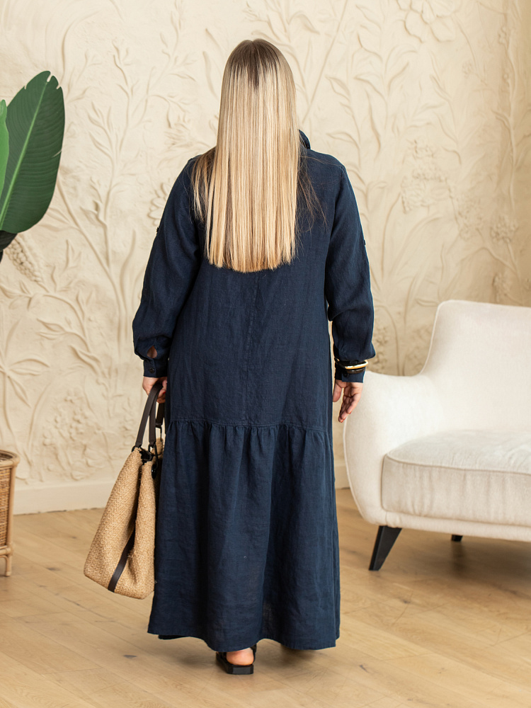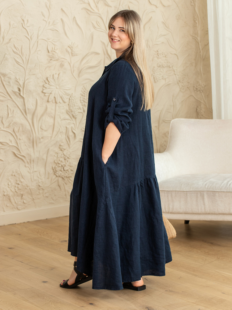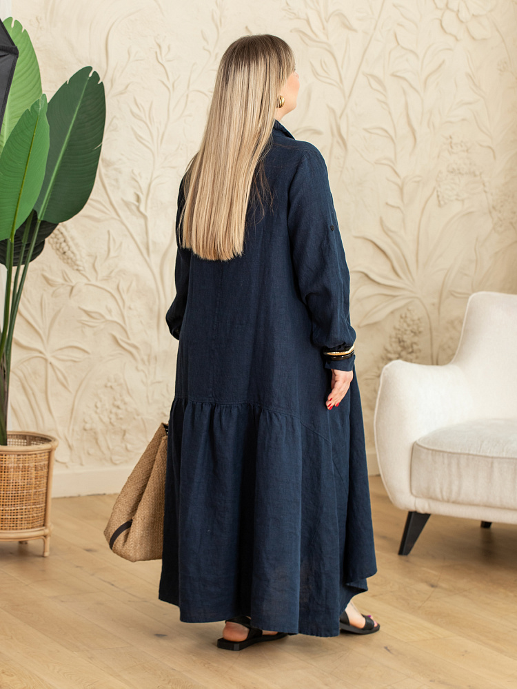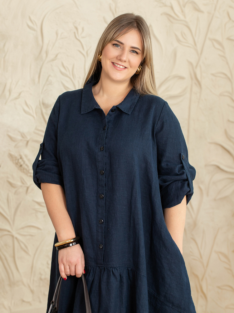 Элегантное платье в стиле бохо — идеальный выбор для женщин, ценящих комфорт и свободу движений. Модель разработана с учётом пожеланий женщин весомых достоинств. Пропорции и силуэт стильно скроют все несовершенства фигуры. Изготовлено платье из натурального льна, который обеспечивает отличную воздухопроницаемость и комфорт в носке. Укороченная длина по полочке позволяет продемонстрировать стильную обувь, которая завершит ваш образ. Это могут быть босоножки на танкетке или сплошном ходу. Разновеликий низ элегантно подчёркнут отрезной деталью, которая имеет мелкую сборку. Все эти приёмы создают манящий и притягательный бохо стиль. А вот центральная застёжка - планка на пуговицах, втачной рукав с манжетой и стояче - отложной воротник выказывают в модели элементы мужской сорочки. Такое смешение стилей привносят в платье харизматичные отличительные черты. Дизайнеры позаботились о функционале и универсальности, снабдив рукава хлястиками, при помощи которых можно регулировать длину рукава. Это платье станет отличным дополнением к вашему гардеробу.