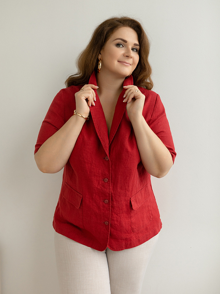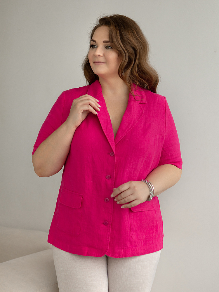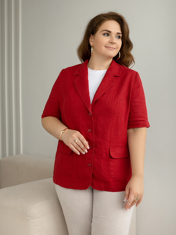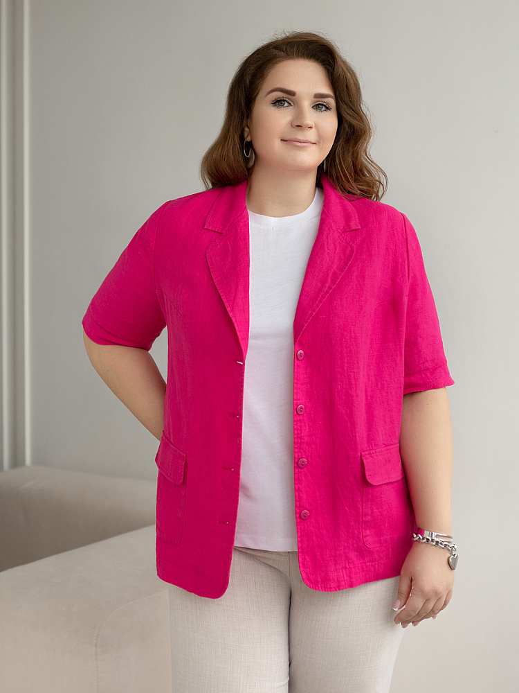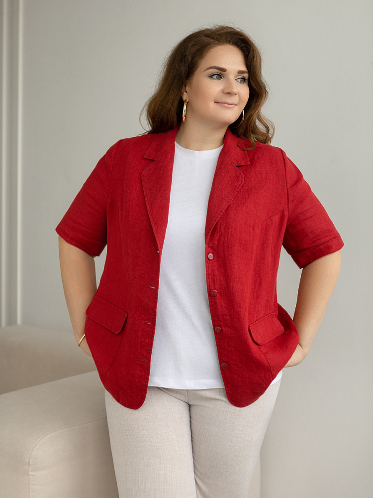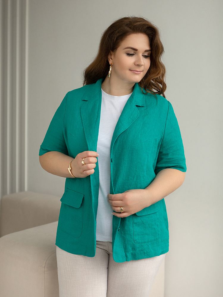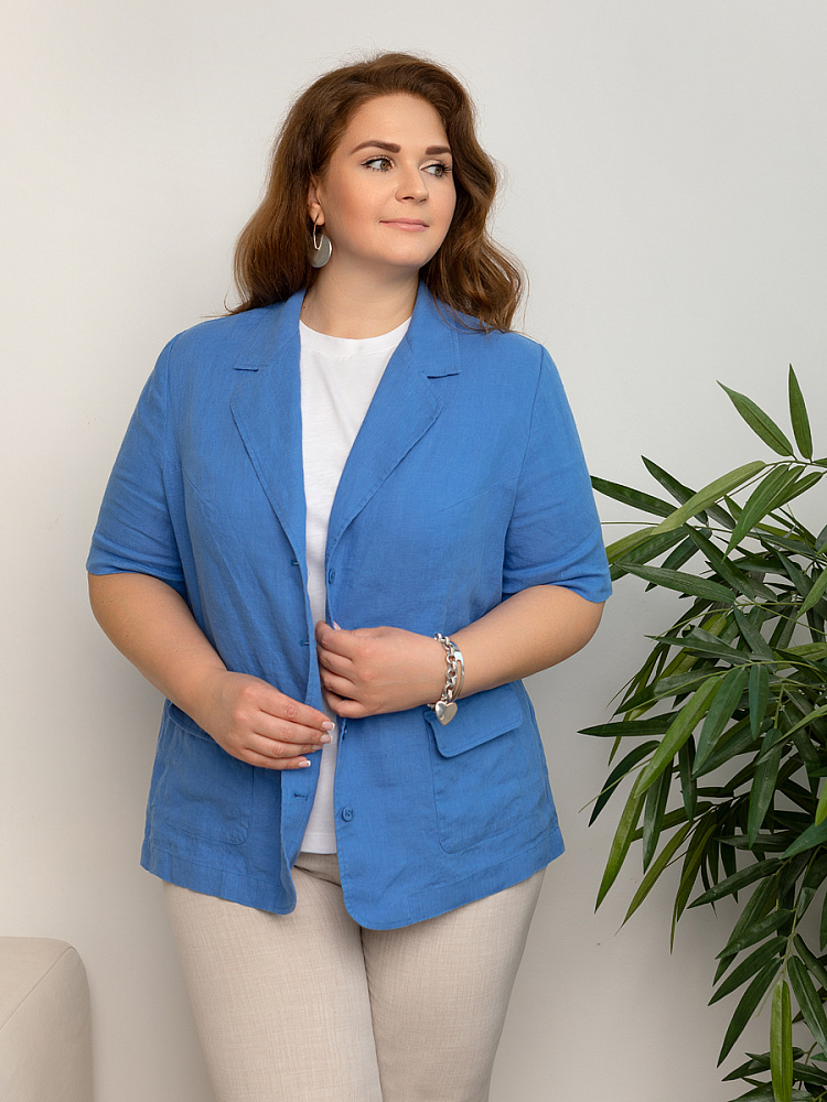 Ничего не может быть более универсальным чем льняной жакет прямого кроя. Устанешь перечислять образы, которые можно создать по средствам такой незаменимой вещи. Это могут быть дуэты с юбками и брюками, как для отдыха, так и для работы. И в каждом таком сочетании жакет как финальный штрих к образу. Но уверены, женщины весомых достоинств тратят массу времени на поиски такого универсального решения в свой гардероб. Разнообразия выбора в этом сегменте не много. Предлагаем обратить внимание на жакет из натурального льна от Kayros. Он разработан с учётом пожеланий обладательниц аппетитных форм. Прямой силуэт хорошо скрывает проблемные участки и не вызывает дискомфорта во время движений. Длина чуть ниже линии бёдер надёжно скрывает проблемную область паха. Ведь мы знаем, как способны испортить образ в целом плохо сидящие на фигуре брюки. Этот жакет поможет вам избежать этого. Классический пиджачный воротник со скруглёнными лацканами подчеркнёт вашу женственность. А подобная форма накладных карманов и край борта усилят этот эффект. Практичный втачной рукав длиной до локтя удобен жарким летом.